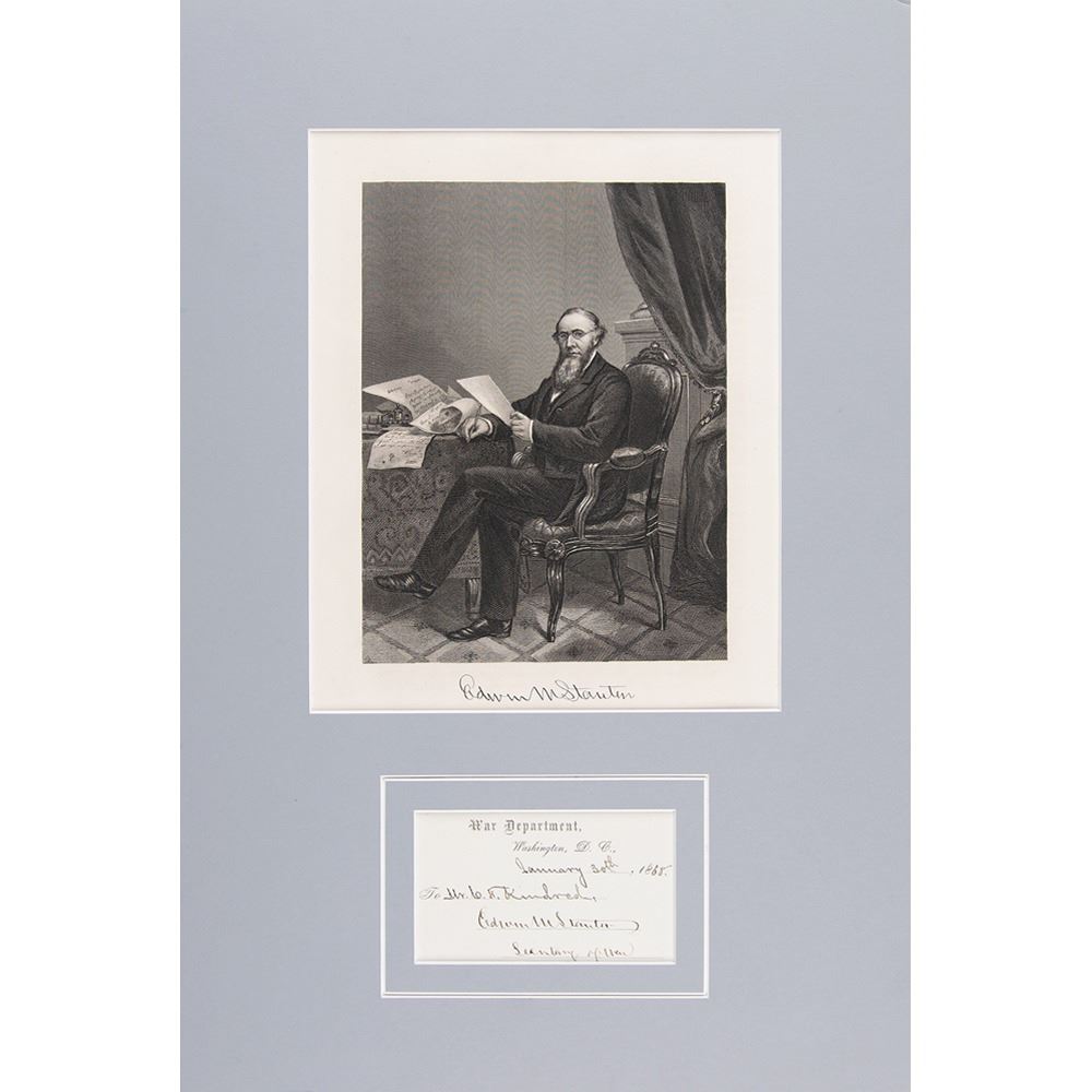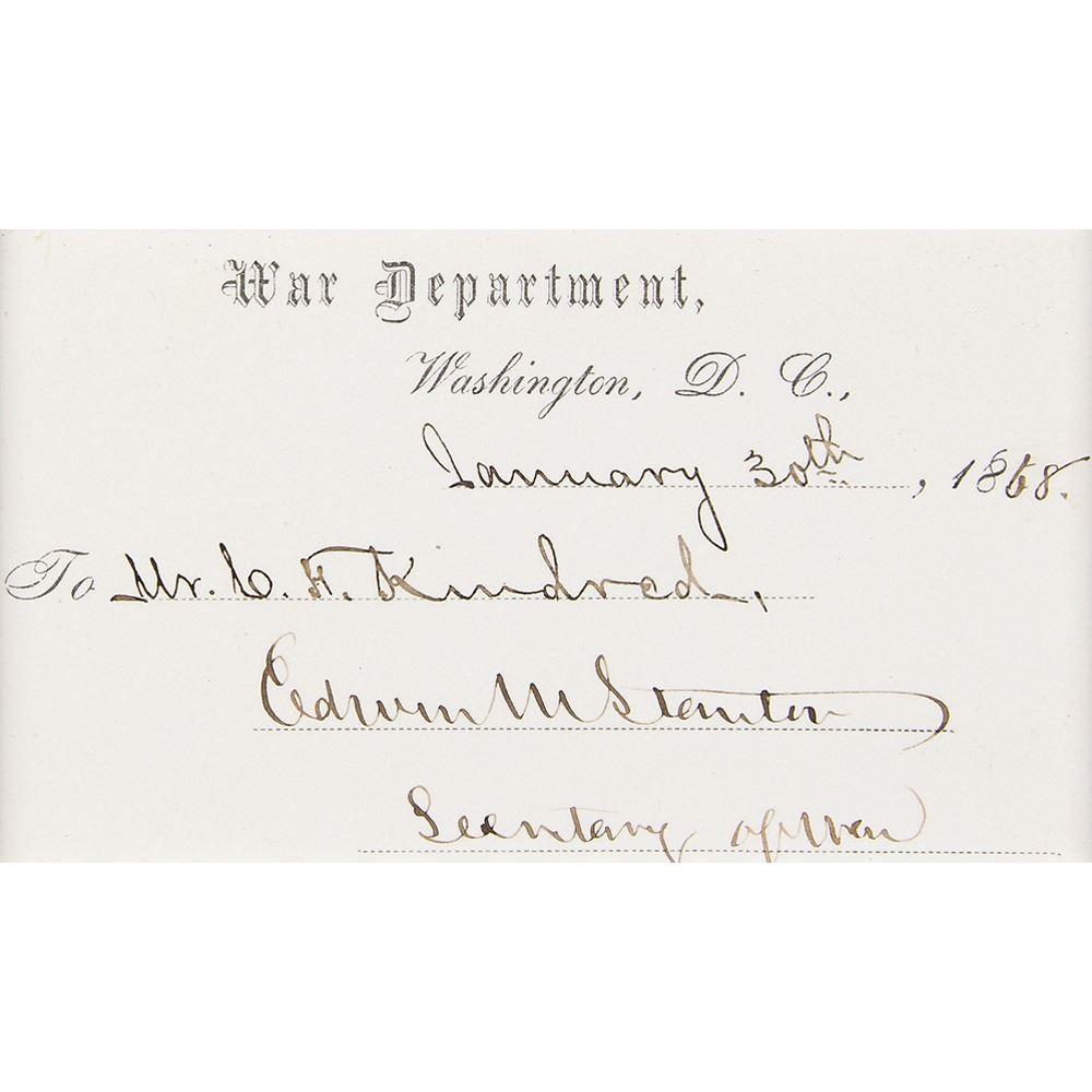 Neat ink signature and inscription, "Mr. C. F. Kindred, Edwin M. Stanton, Secretary of War,” on an off-white 3.75 x 2.25 official War Department card, dated January 30, 1868. Matted with an engraved portrait (bearing a facsimile signature) to an overall size of 11 x 16.5. In fine condition.