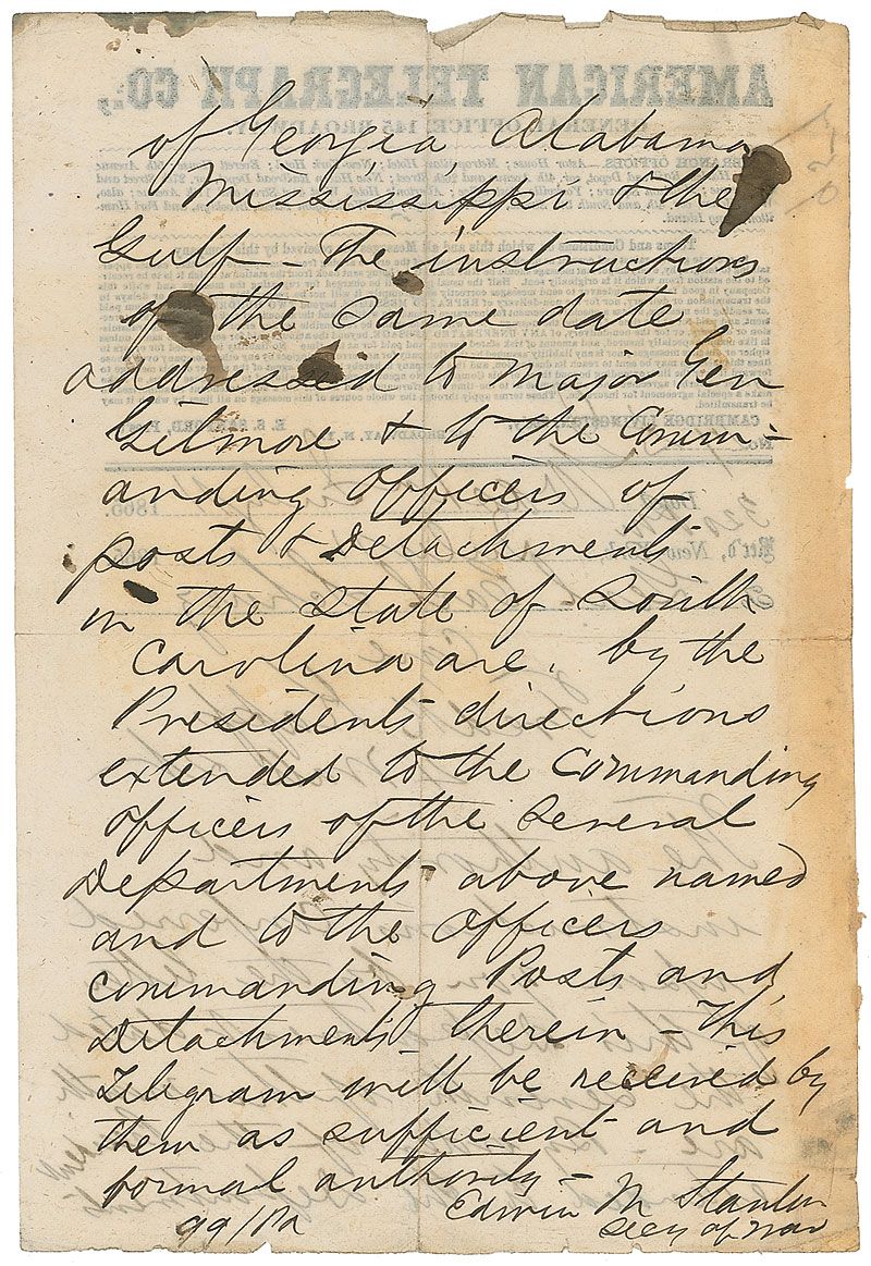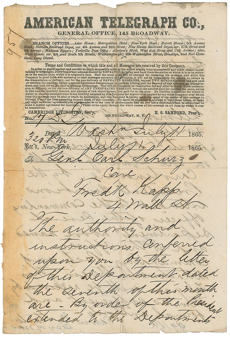 Unsigned manuscript telegram in from Edwin M. Stanton to General Carl Schurz, one page both sides, 5.25 x 8, sent from the American Telegraph Co., July 11, 1865. In part: “The authority and instructions conferred upon you by the letter of this Department dated the seventh of this month are—By order of the President—extended to the Departments of Georgia, Alabama, Mississippi & the Gulf.” Central vertical and horizontal folds, a band of toning to the left border, various edge chips and tiny tears, and a few stray blotches of ink, otherwise very good condition.