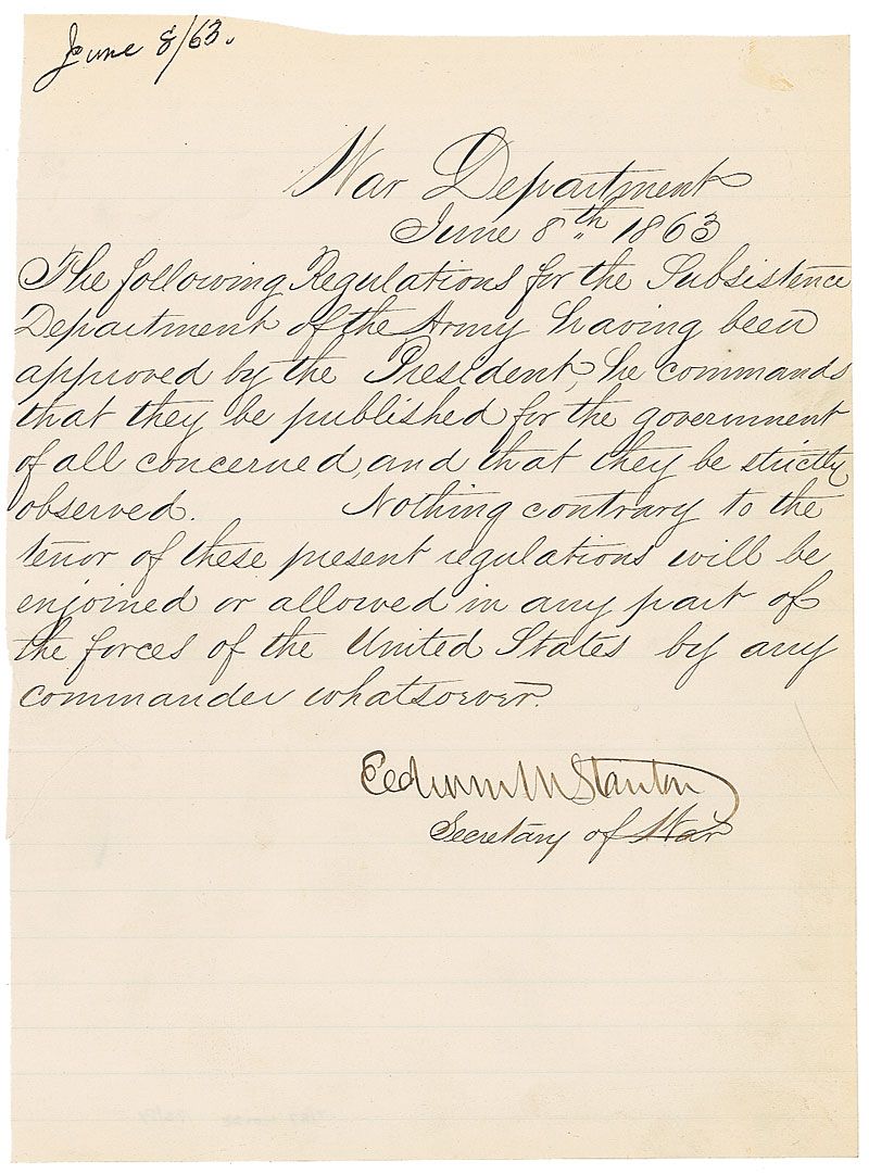 American politician (1814–1869) who served as secretary of war in the cabinets of Abraham Lincoln and Andrew Johnson. LS, as secretary of state, one page, lightly-lined, 7 x 9.5, June 8, 1863. Letter which accompanied sent regulations. In full: “The following Regulations for the Subsistence Department of the Army having been approved by the President, he commands that they be published for the government of all concerned and that they be strictly observed. Nothing contrary to the tenor of these present regulations will be enjoined or allowed in any part of the forces of the United States by any commander whatsoever.” In fine condition, with two slightly trimmed edges.