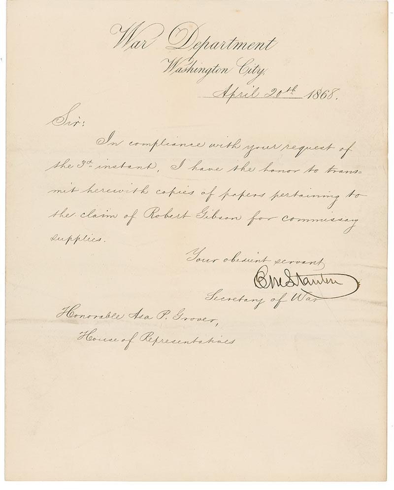 LS signed “E. M. Stanton,” one page, 7.75 x 9.75, War Department letterhead, April 20, 1868. Letter to Representative Asa Grover. In full: “In compliance with your request of the 3rd instant, I have the honor to transmit herewith copies of papers pertaining to the claim of Robert Gibson for commissary supplies.” In very good condition, with a bit of scattered light soiling, several scattered creases, a couple surrounding signature, and some mild toning.
