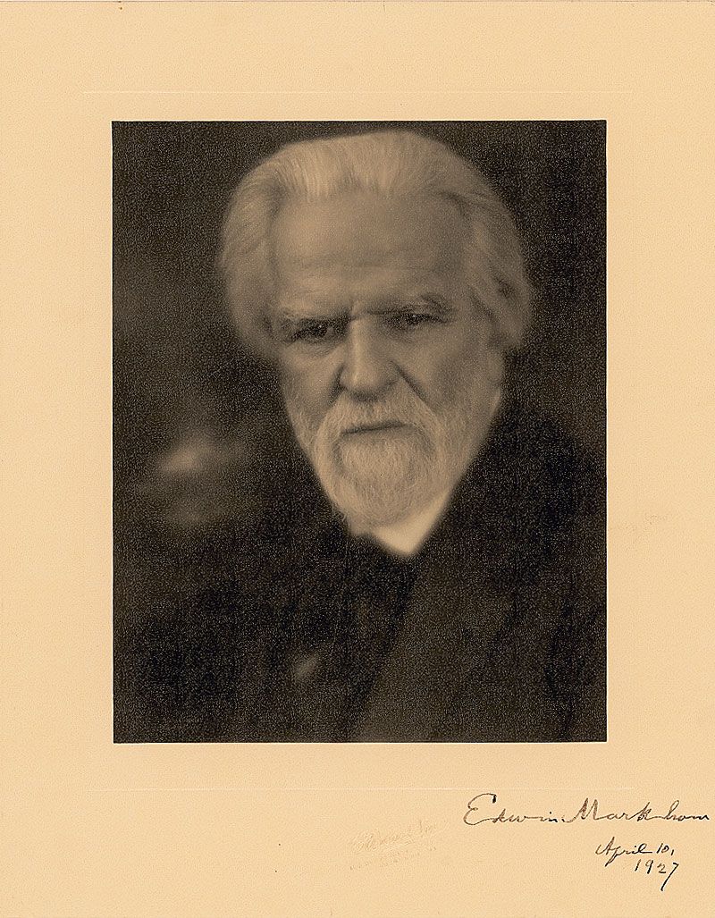Vintage matte-finish 11 x 14 head-and-shoulders portrait of the poet by E. Willard Spurr, signed in the lower right in black ink, “Edwin Markham, April 10, 1927.” In fine condition.