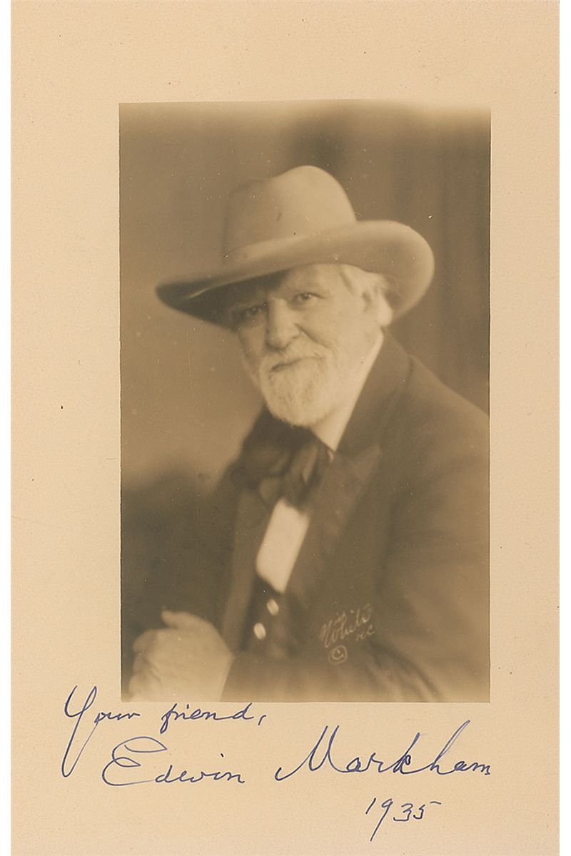 American poet and lecturer (1852–1940) whose poem of social protest, ‘The Man with the Hoe,’ brought him worldwide acclaim. Vintage matte-finish 5 x 7.5 photo, signed in the lower border in blue ink, “Your friend, Edwin Markham 1935.” In fine condition.