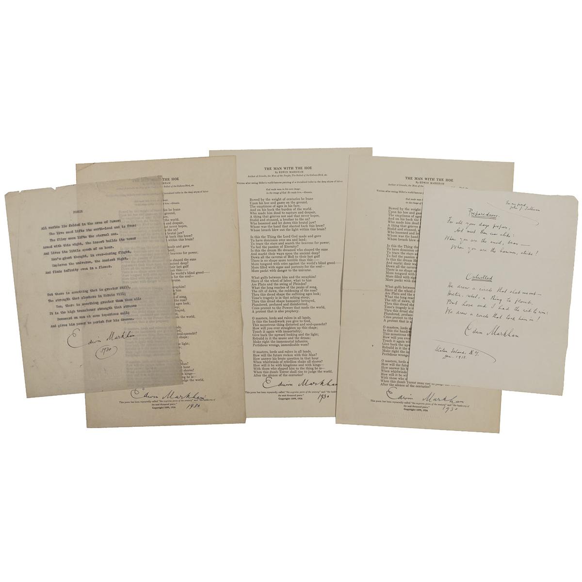 American poet and lecturer (1852–1940) whose poem of social protest, ‘The Man with the Hoe,’ brought him worldwide acclaim. Five items: two handwritten poems, ‘Preparedness’ and ‘Outwitted,’ on an 8 x 10.25 sheet, signed and inscribed, “Edwin Markham”; three copies of ‘The Man with the Hoe’ on individual 8.5 x 14 sheets, each signed “Edwin Markham 1930”; and a typewritten poem, ‘Power,’ on an 8.5 x 11 sheet, signed “Edwin Markham 1930.” In overall very good condition with expected handling wear.