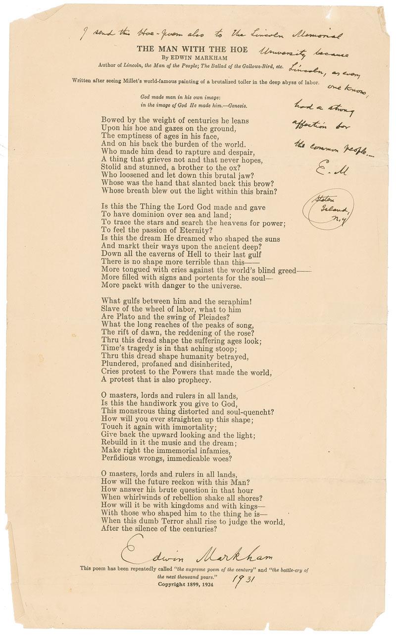 American poet and lecturer (1852–1940) whose poem of social protest, ‘The Man with the Hoe,’ brought him worldwide acclaim. Signed copy of ‘The Man with the Hoe,’ one page, 8.5 x 14, signed at the bottom in black ink. Edwin Markham, 1931.” He has added at the top of the page, “I send this Hoe-poem also to the Lincoln Memorial University because Lincoln, as every one knows, had a strong affection for the common people. E. M.” Beneath his initials he was written and then circled, “Staten Island, N. Y.” Few small tears, several horizontal folds, a uniform shade of mild toning, and a few light edge creases, otherwise in fine condition.