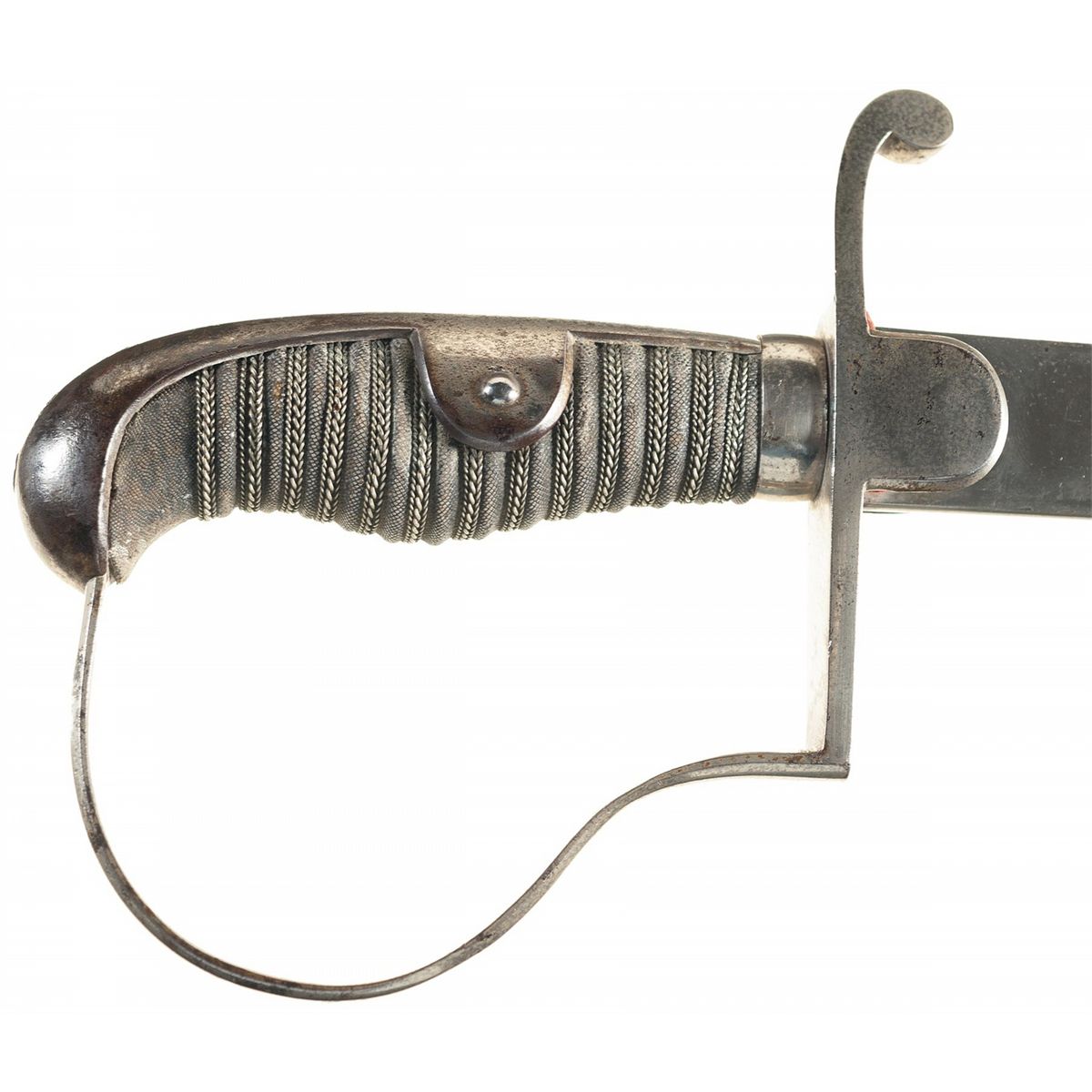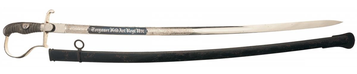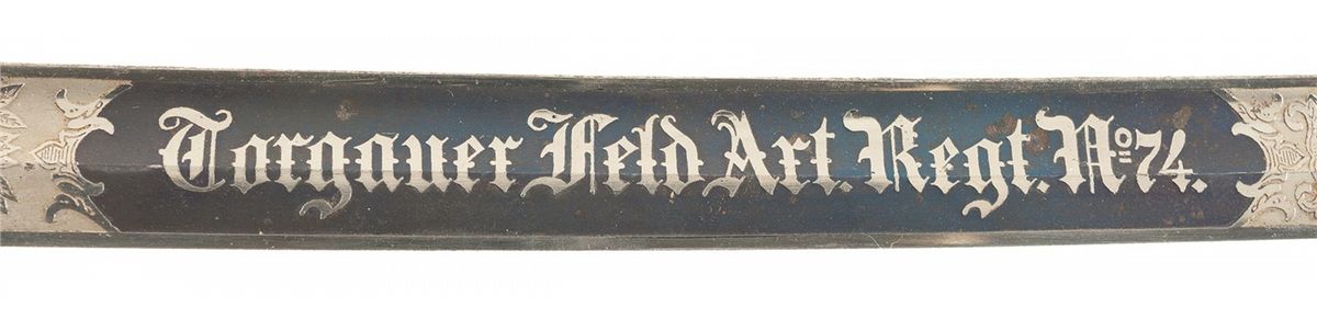 Overall the sword measures 37 1/4 inches long, with a 32 1/4 inch curved single fuller blade, showing martial etching on both sides, a vine pattern along the spine, and a niter blue panel on the right with "Torgauer Feld Art. Regt. No74." within. Nickel scabbard, with "A.74.1.48" stamped on the left languet, with a wire wrapped sharkskin grip. The 74 Field Artillery Regiment was a component of the 8th Field Artillery Brigade of the 8th Division of the Prussian/Imperial German IV Army Corps, active from 1818 to it?s disbanding at the end of World War One.