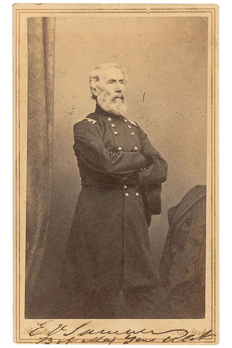 Union military officer (1797–1863), nicknamed ‘Bull,’ who was the oldest field commander on either side during the Civil War. Original 2.25 x 4 carte-de-visite photo by Brady’s of New York, signed in the lower border in black ink, “E. V. Sumner, Bvt Maj Genl USA.” In fine condition.