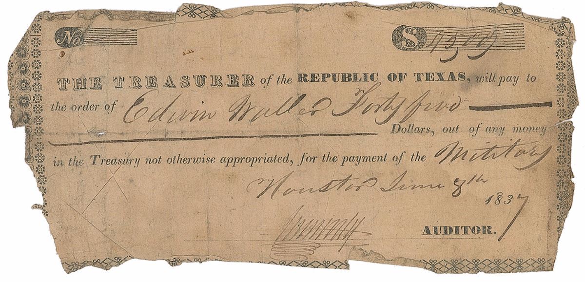 Public official and signer of the Texas Declaration of Independence (1800–1881). Partly-printed DS, one page, 6.5 x 3, June 8, 1837. Financial document, in part: “The Treasurer of the Republic of Texas, will pay to the order of Edwin Waller Forty five Dollars.” Endorsed on the reverse by Waller, “Pay the bearer, Edwin Waller.” Heavy overall wear, soiling, endorsement heavily affected and difficult to read, and paper loss and tears to edges, otherwise very good condition. Provenance: The Robert Davis Collection.