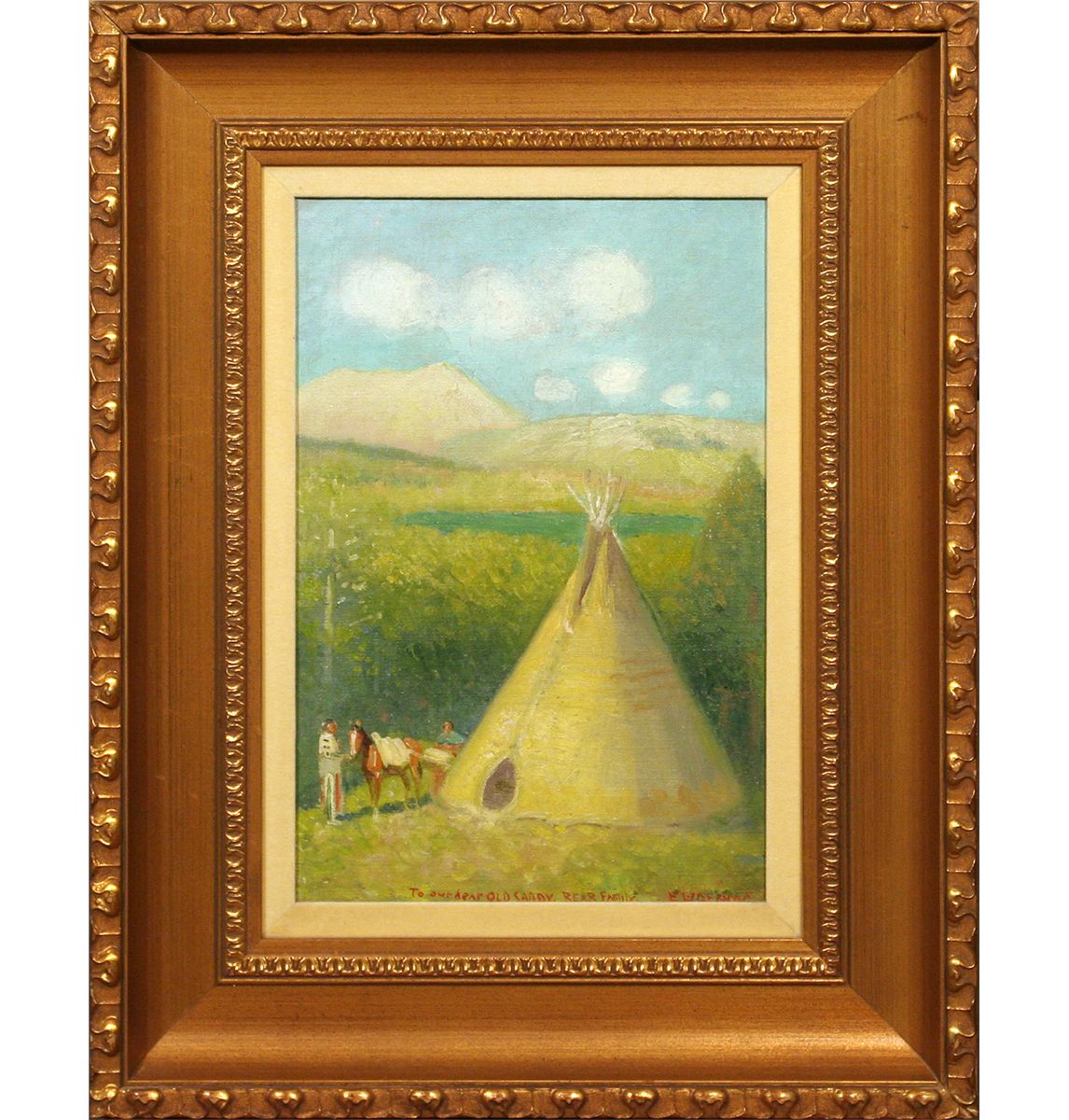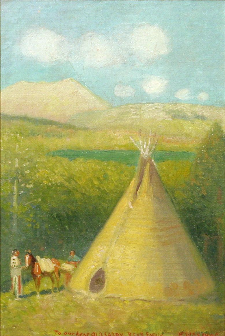 Edwin Willard Deming (1860 - 1942). Northern Teepee. 18" x 12" oil on canvas. Signed and inscribed across the bottom: To our dear OLD SANDY, BEAR FAMILY. E. W. Deming.