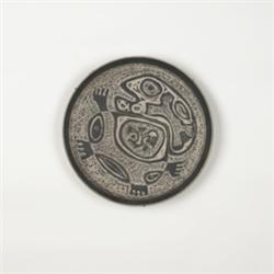 Edwin and Mary Scheier charger USA, 1950s glazed earthenware 17.25"dia Wax-resist decorated interior in textured black glaze. Incised signature.