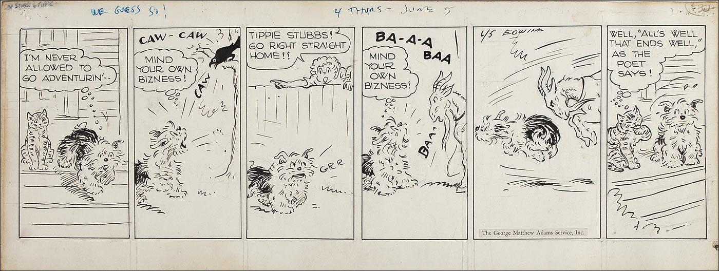 Creator of Cap Stubbs and Tippie and one of the first female cartoonists (1893–1990). Original hand-inked six-panel Cap Stubbs and Tippie daily comic strip, dated “Thursday—June 5” on an off-white 17 x 6.25 piece of artist’s cardstock. Strip depicts Tippie heading out in search of adventure, only to be butted back in line by a rogue billy goat. Signed in black ink in the second to last panel, “Edwina.” Rippling, toning, and a few stray ink marks and editorial notations, otherwise fine condition.