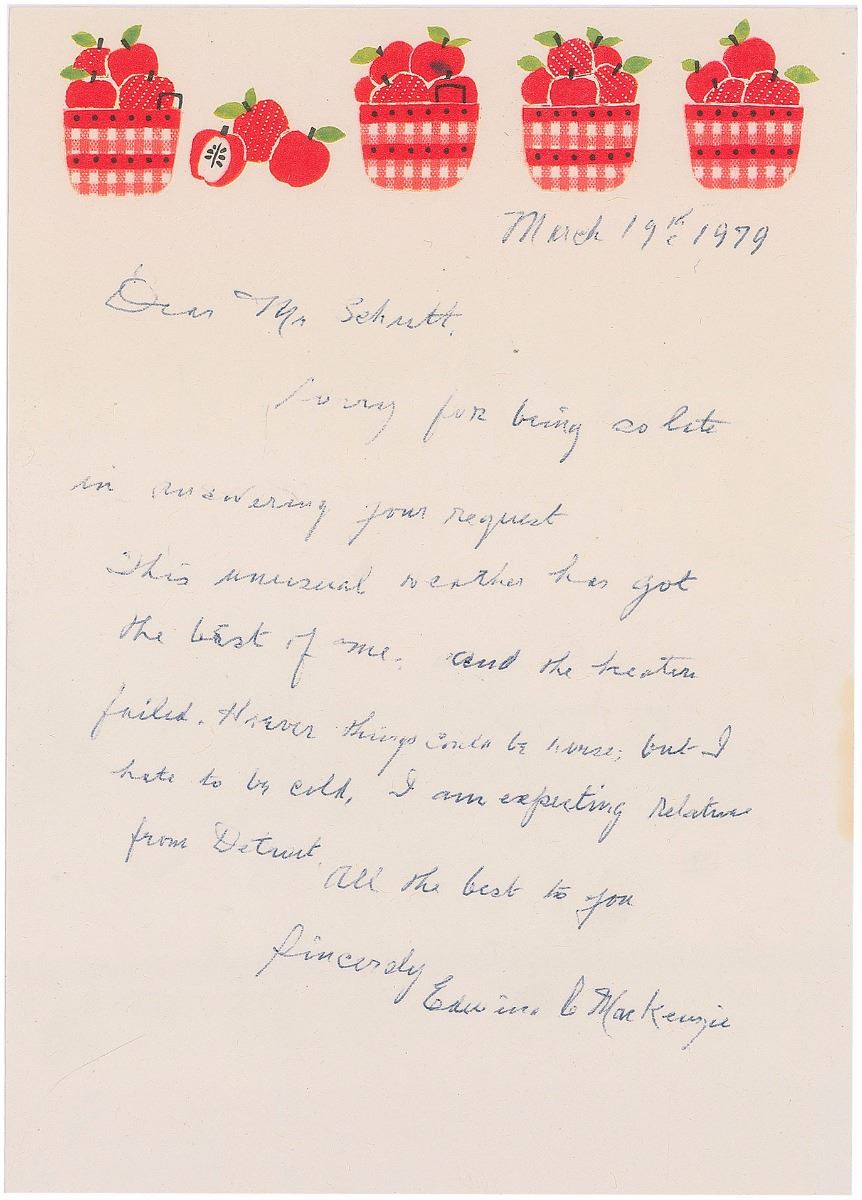 Second-oldest survivor of the Titanic (1884–1984). ALS signed “Edwina C. MacKenzie,” one page, 5.5 x 7.75, March 19, 1979. Letter to Mr. Schuett, in full: “Sorry for being so late in answering your request. This unusual weather has got the best of me, and the heater failed. However things could be worse, but I hate to be cold. I am expecting relatives from Detroit.” In fine condition, with one vertical fold. Accompanied by an unsigned copy of an article entitled “Edwina MacKenzie Remembers” from The Chicago Daily Tribune on April 16, 1912.