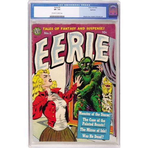 <B>Eerie #3 Spokane pedigree (Avon, 1951) CGC VF- 7.5 Off-white to white pages.</B></I> A creepy Wally Wood cover wraps Joe Kubert and Joe Orlando art in this horrorfest. Overstreet 2006 VF 8.0 value = $444. CGC census 3/07: 1 in 7.5, 1 higher.<BR><BR><b>Shipping:</b> Comics - Slabbed (certified) (<a target="_blank" href="http://www.heritageauctions.com/common/shipping.php">view shipping information</a>)