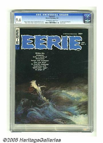 <B>Eerie #7 (Warren, 1967) CGC NM+ 9.6 Off-white to white pages.</B></I> Frank Frazetta cover. Interior art by Gray Morrow, Gene Colan, Steve Ditko, Dan Adkins, Johnny Craig, and Jerry Grandenetti. Overstreet 2005 NM- 9.2 value = $55. CGC census 1/05: 6 in 9.6, 2 higher. <I>From the collection of Chris Bell.</B></I>