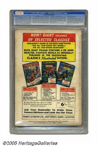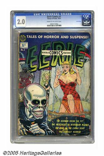 <B>Eerie Comics #1 (Thorpe & Porter, 1951) CGC GD 2.0 Cream to off-white pages.</B></I> This UK edition is of great historical importance in Britain's anti-comics campaign started by George Pumphrey. In fact, this very issue was the first horror comic Pumphrey had seen, and it prompted his starting the campaign that, like a similar one conducted by Dr. Fredric Wertham in the US, resulted in the banning of such horror comics in the UK. This comic book was denounced in the House of Commons in 1952, and Pumphrey's <B>Guide for Parents and Teachers</B></I> (1956) cites stories from this compilation, a derivative of Avon's publication in the US. Because parents were encouraged to destroy such offensive horror comic books, and since this book was specifically lambasted, few copies have survived. This is the only copy of this comic book to be certified by CGC to date. Not listed in Overstreet. CGC census 6/05: 1 in 2.0, none higher.