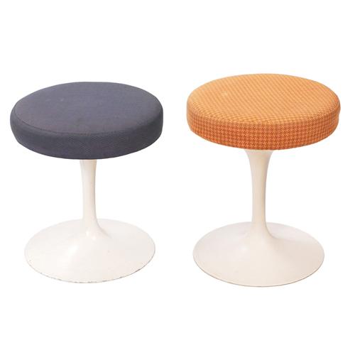 Eero Saarinen Pedestal stools, two, by Knoll, enameled aluminum bases with seats upholstered in wool fabric, each marked "BR 51" on base, 15"dia. X 16.5"h, stool at right has wood support under seat and is 18"h, good condition