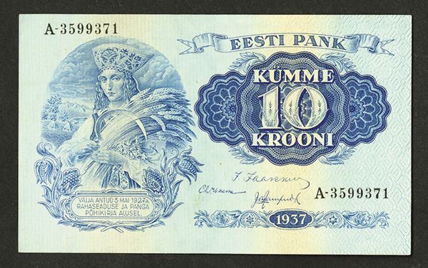 Estonia. 10 Krooni. P-67a. Female in national costume holding sickle and sheaf of wheat at right. Choice AU. Three signatures.