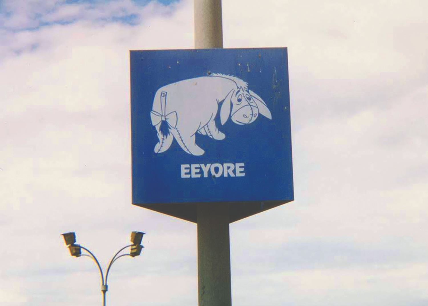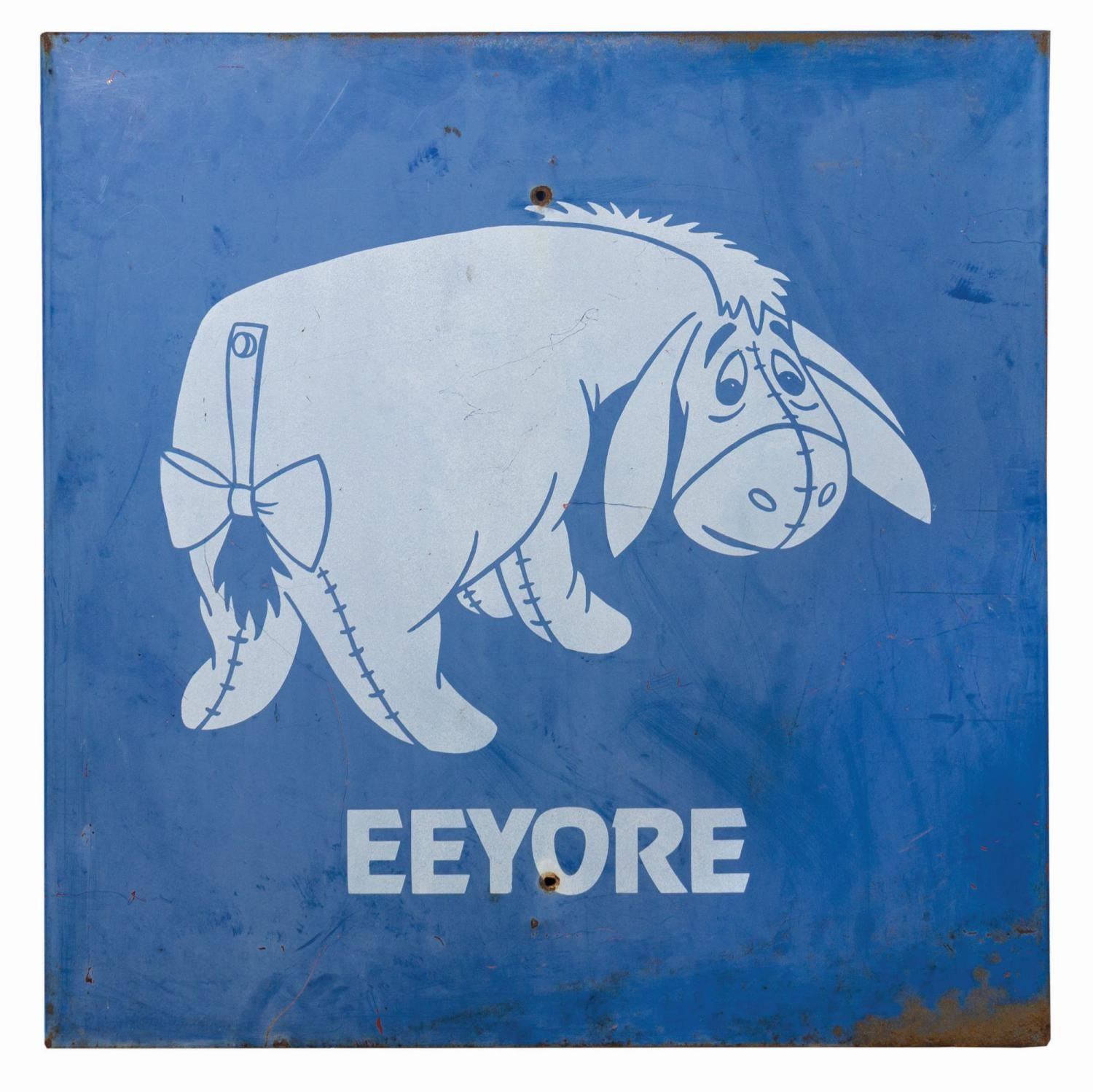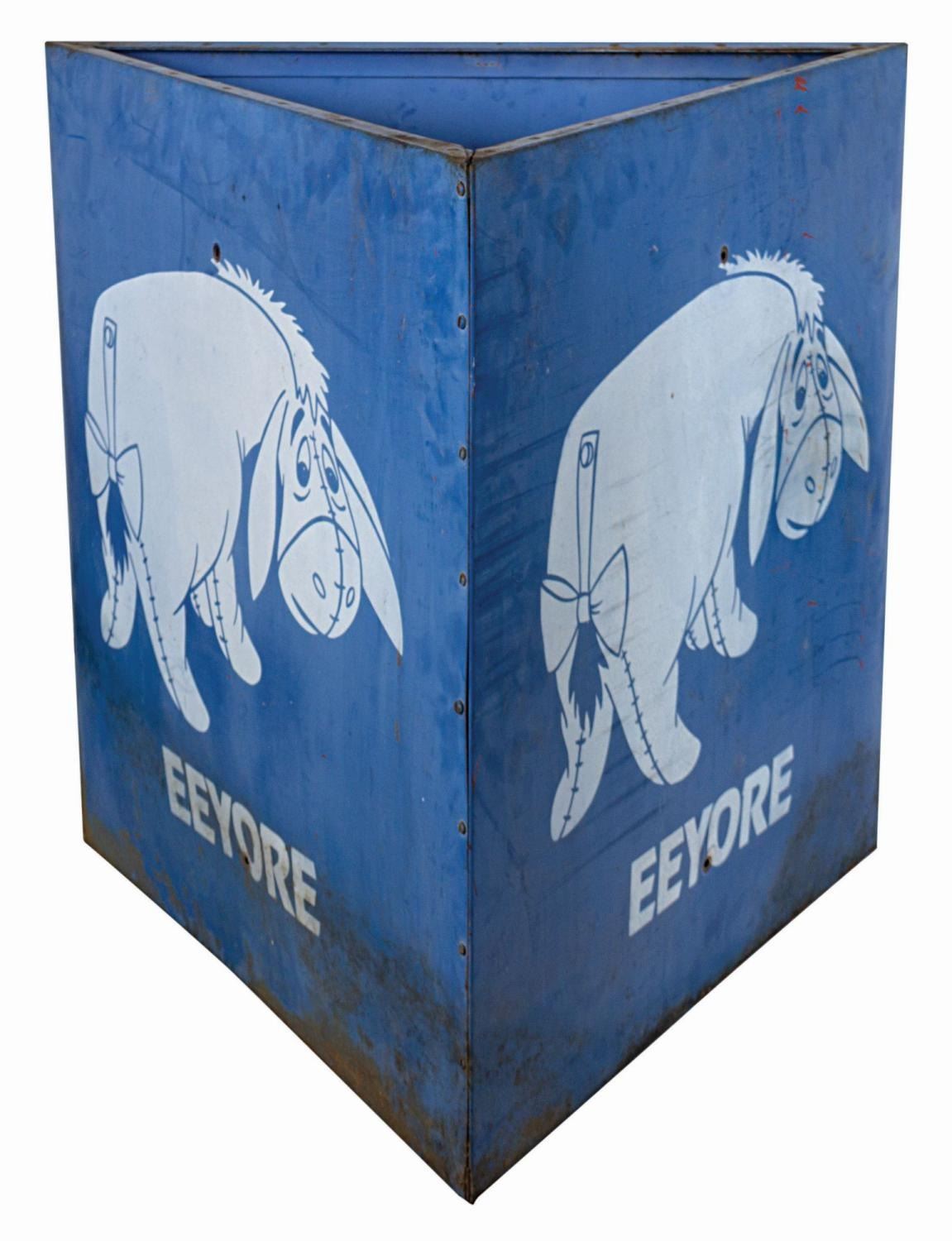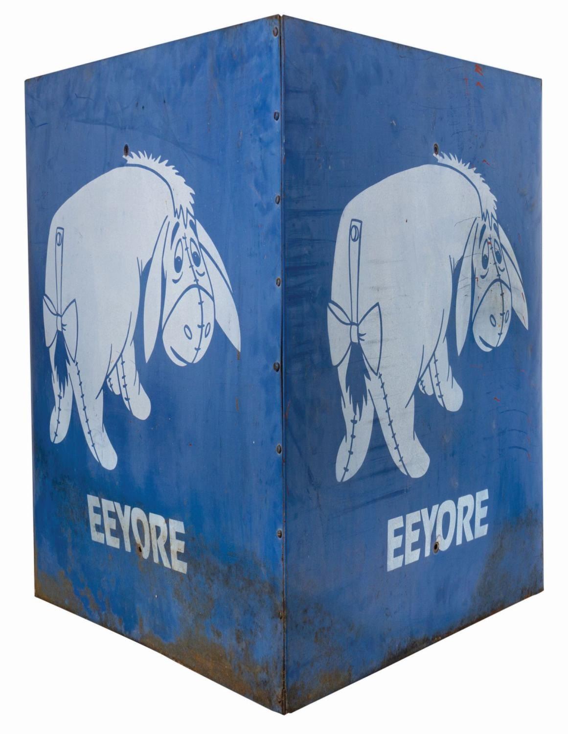 (Disneyland, 1990s) A large triangular metal parking lot sign from Disneyland. Each 30"x30" side features the name and depiction of Eeyore from Winnie the Pooh. The condition is fair with various dings and wear throughout from the sign's park use and removal, and moderate rusting around the bottom edge. This item may require special shipping arrangements, please inquire for details and estimates.