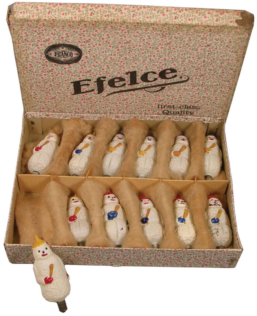 Efelce Snow Man Christmas Light Bulbs. One dozen, unused in original box. Each bulb measures 3 1/2 inches tall. Start Price $20