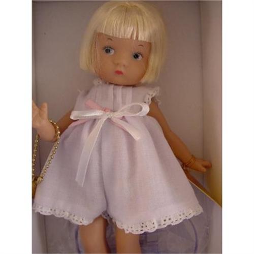 Effanbee Blonde Patsyette in White, Mint in Box. Very cute and sweet 8in baby doll, purely Patsyette, with rooted blonde hair, handpainted blue eyes, and smiling red lips. She is dressed in a crisp white cotton outfit with black leatherette shoes. She is in mint condition and comes in her original box, decorated with a vintage style children's print, also in mint condition. This is a contemporary doll.