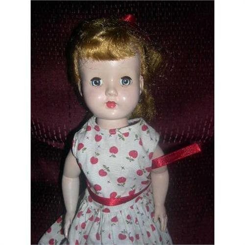 Here is a 14" hard plastic walker maked Effanbee on the back of the head. She was made in the 1950's. When her legs move, her head turns. She has open and close eyes and has all her eyelashes. She has an open mouth with teeth. Her wig is original and has been pulled to the back. The lower layer is thin but there looks to be enough there that you could reset and it could look nice. She has been played with but is still nice. She only has on a little cotton dress. She has no smells, cracks or stains. She is sold as is so if you can give her TLC, please bid. She is from a smoke free environment. Buyer to pay $15 for shipping, insurance and handling. Thanks for viewing.