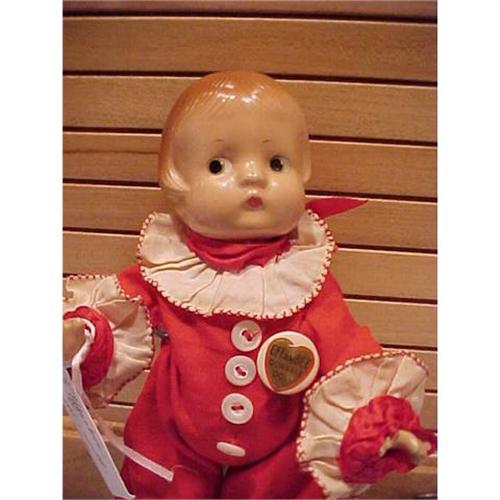 This 9" Patsyette from the Effanbee's Patsy family is hard to find as original as this one is. She is not mint but still very nice. She has about an inch craze line on her head and some faint scratches near one ear. The top layer of varish has a few places where it is worn, mostly on one arm. Her finger tips are slightly worn. None of this is distracting as she has so many pluses. Her romper is original as is her Effanbee button. She is marked correctly and her painting is excellent. The other outfit looks really cute on her. It is a clown suit. She would display beautifully. Thanks.