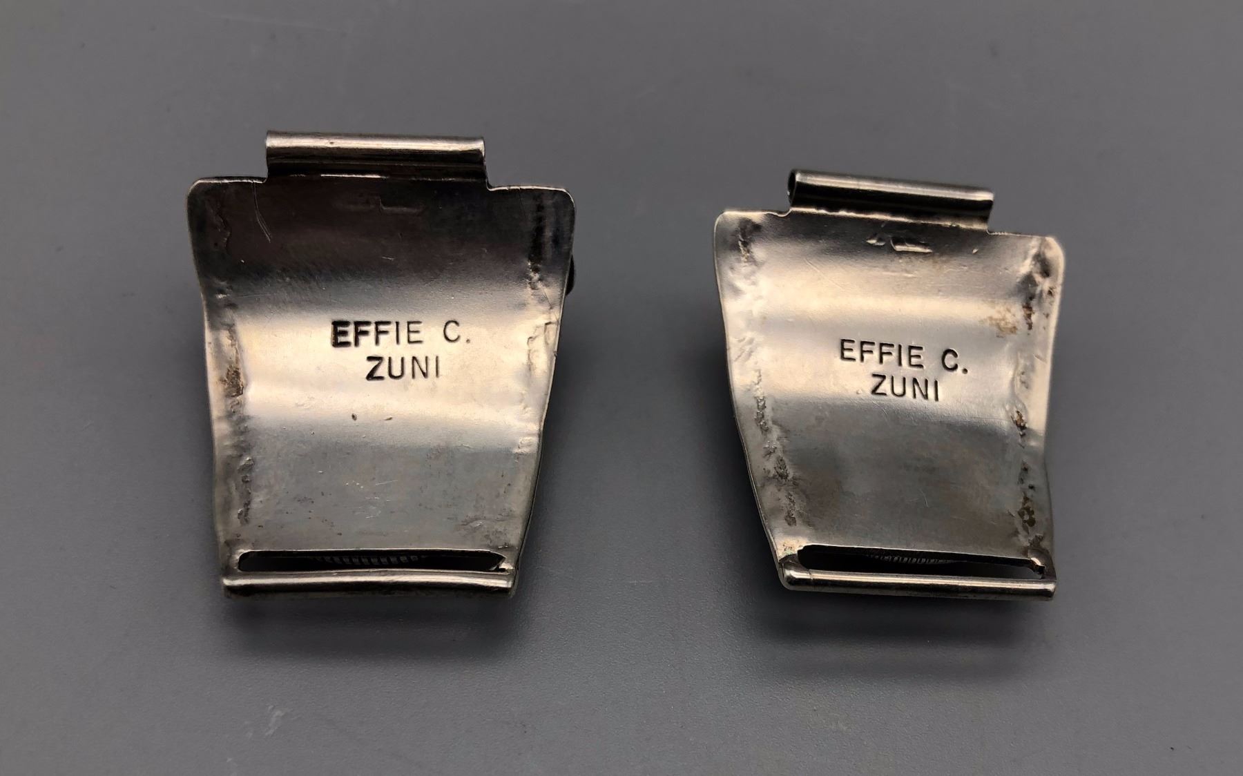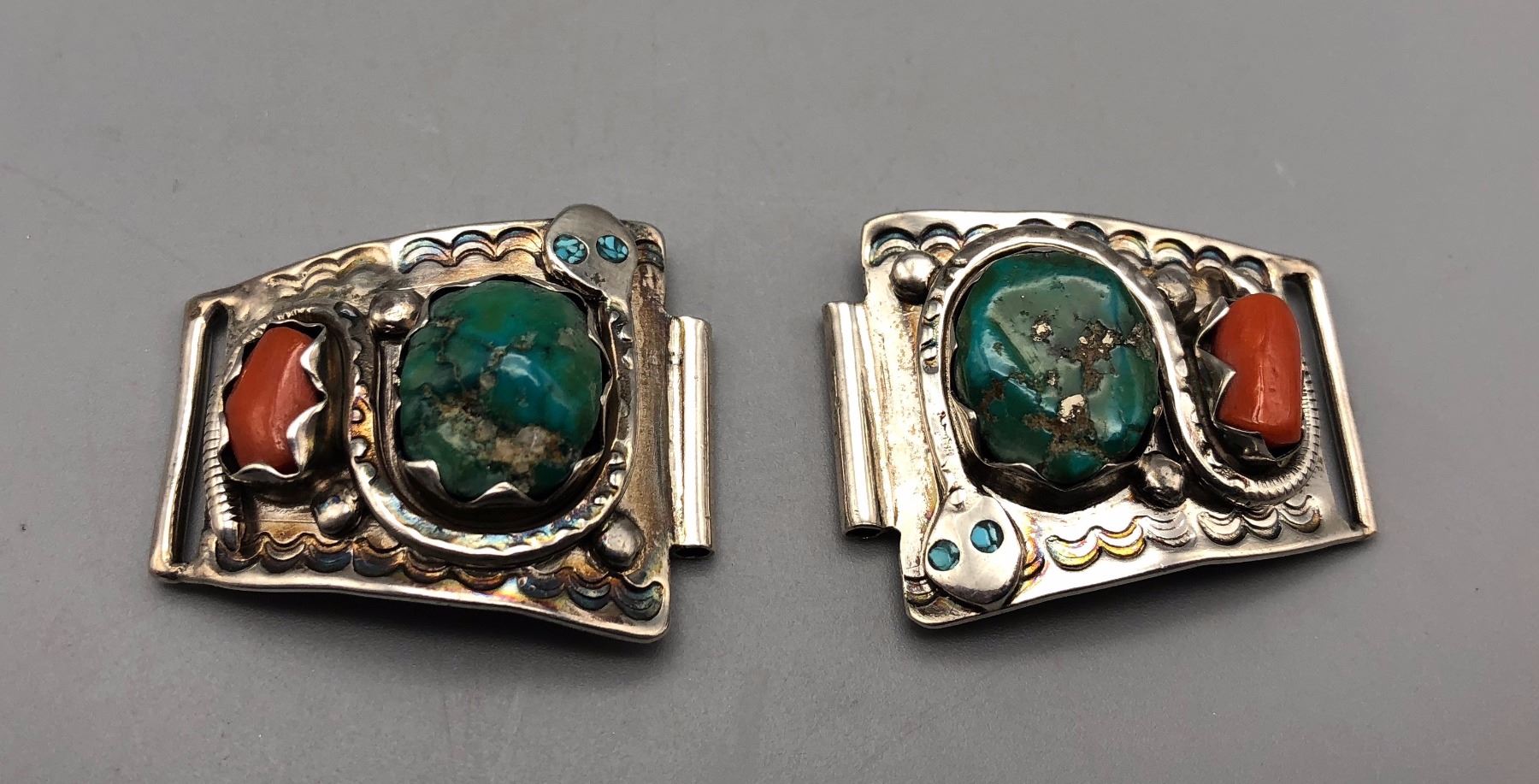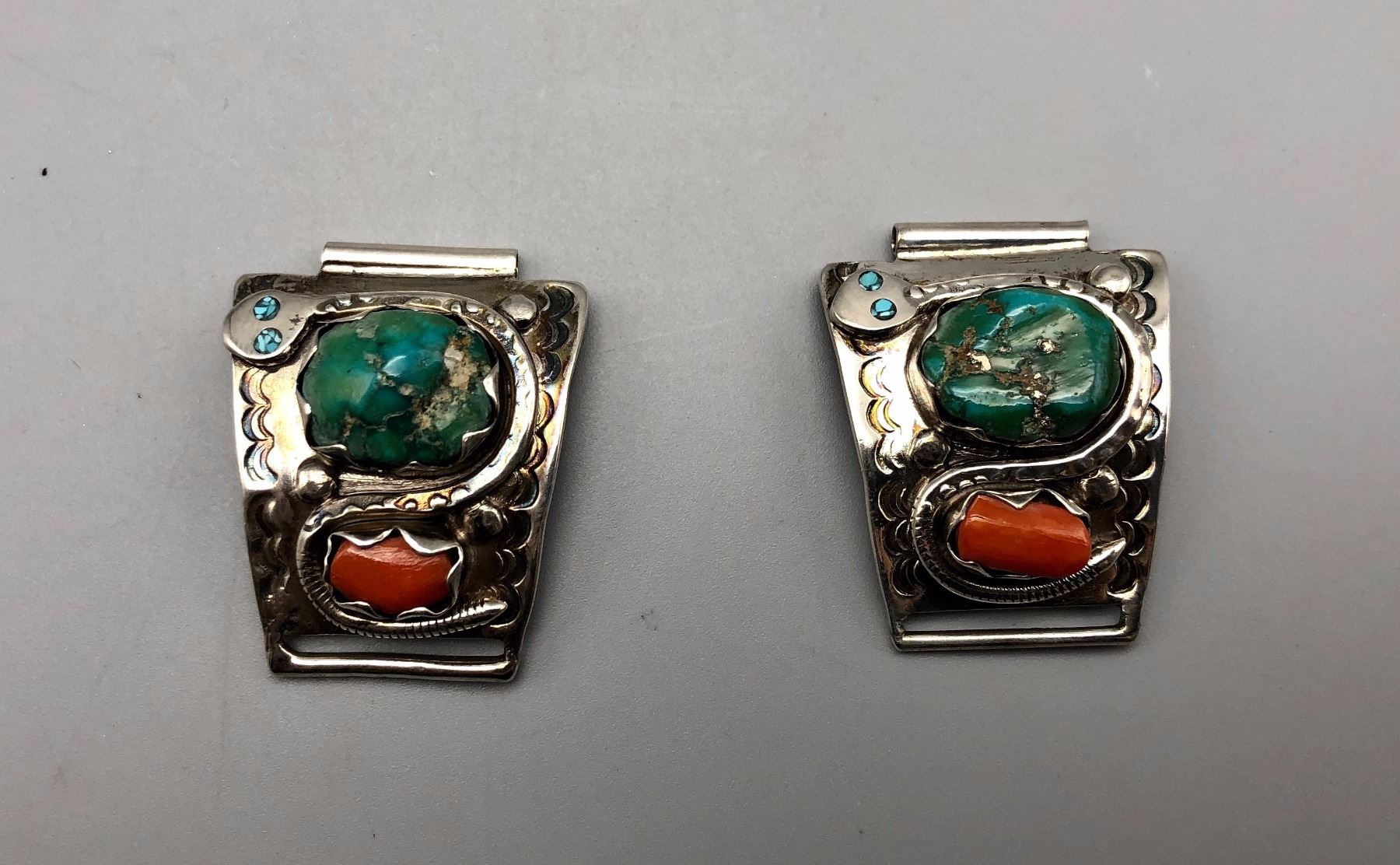 Maker: Effie Calavaza, Zuni. Approx. Age: Circa 1970s. Size: Each tip measure 1 1/8” w x 1 3/8” l. Lot weighs 32.2 g. Additional Info: “Snake” Watch Tips with turquoise and coral set in hand embellished silver by a world-famous maker. Condition: Good for it’s age, normal were expected. Please look closely at the pictures - they are an important part of our description. Shipping: There will be a $5 handling / packaging fee for shipping this lot. The actual cost of postage will be added on top of that.