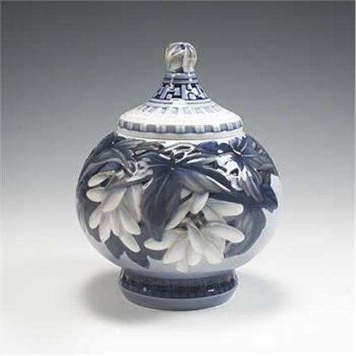 Effie Hegermann-Lindencrone lidded vase, model #1724 Bing & Grondahl Denmark, 1922 glazed porcelain 6.75 dia x 9 h inches Carved hard-paste porcelain painted with underglaze colors. Featuring a footed body decorated with a low-relief frieze of maple leaves and seedpods and a pierced, hand-carved and reticulated lid. Signed with stamped manufacturer's marks to underside in green: [Three Castles B & G Kj*bendhavn Danmark] and stamped artist's signature to underside of body and lid in blue: [EHL 1724/22].