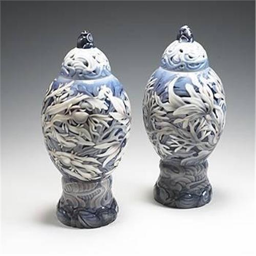 Effie Hegermann-Lindencrone lidded vases, model #1710, pair Bing & Grondahl Denmark, 1922 glazed porcelain 5.25 dia x 13 h inches Carved hard-paste porcelain painted with underglaze colors and decorated with a low-relief frieze. Featuring a pierced, hand-carved and reticulated lid decorated with an organic stylized wave pattern and seashells. Signed with stamped manufacturer's mark to underside in green: [Three Castles B & G Kj*bendhavn Danmark] and stamped artist's signature to underside of body and lid in blue: [EHL 1710/22].