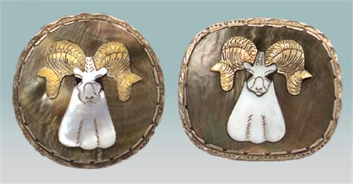 Effie Qualo Buckle and Bolo Set. Buckle is 2 1/2" x 3". Bolo is 3" diameter. Classic Qualo. Big horn sheep design. Fine condition. (est $1,500-2,500)