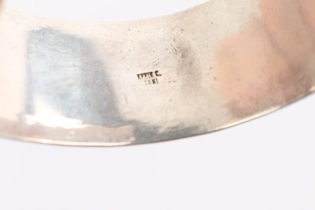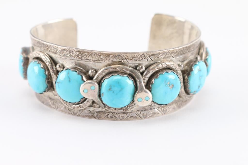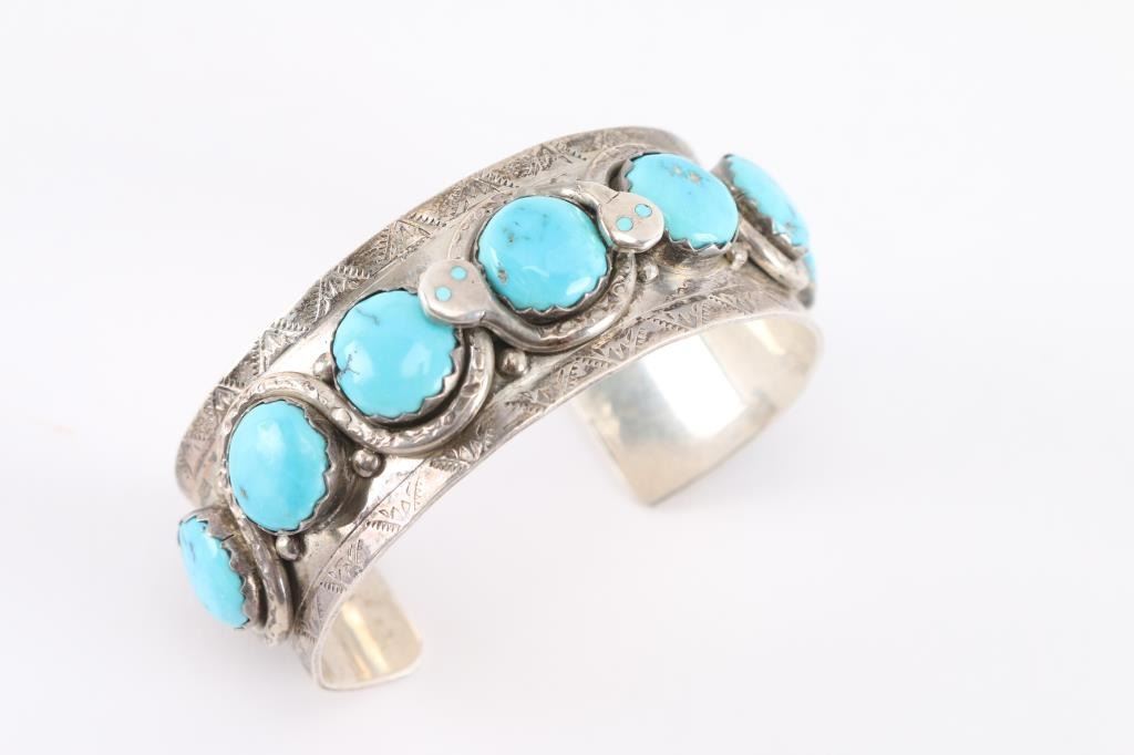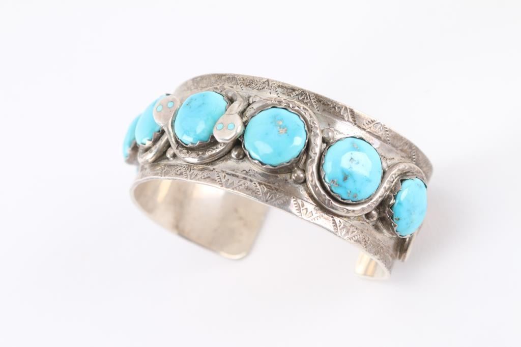 7 sleeping beauty turquoise stones. Accented with a snake design. Maker marked .