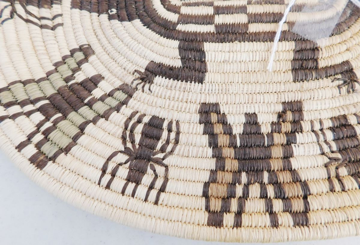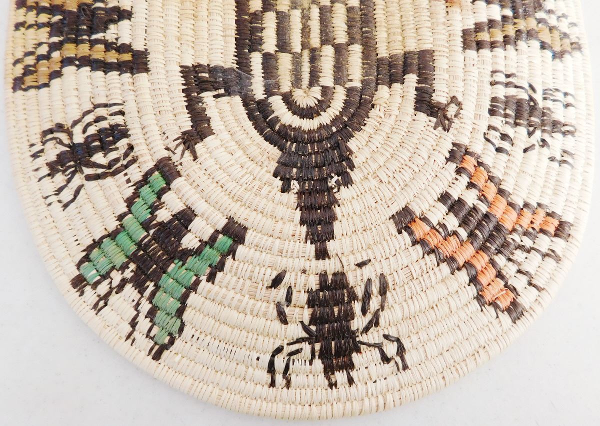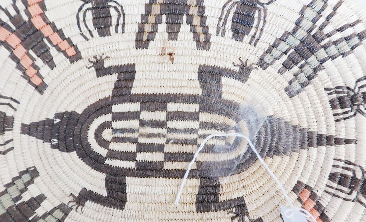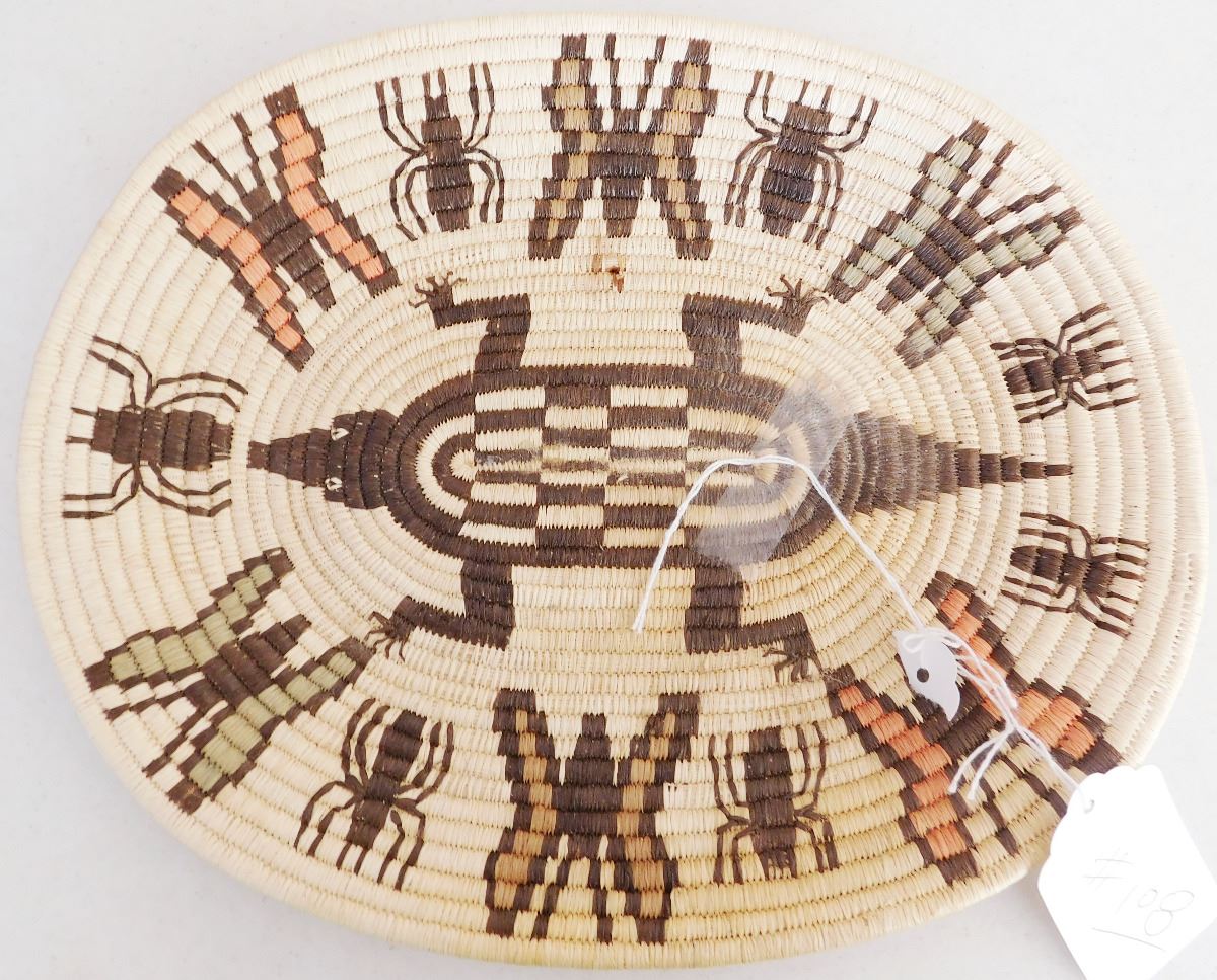 Effigy Basket, circa 1960s. Made of plant fibres and measuring 12" x 10". From Panama. Polychrome basket has butterflies, spiders and a lizard effigy. Condition: Very good, minor hole, see images. Shipping: $16.50.