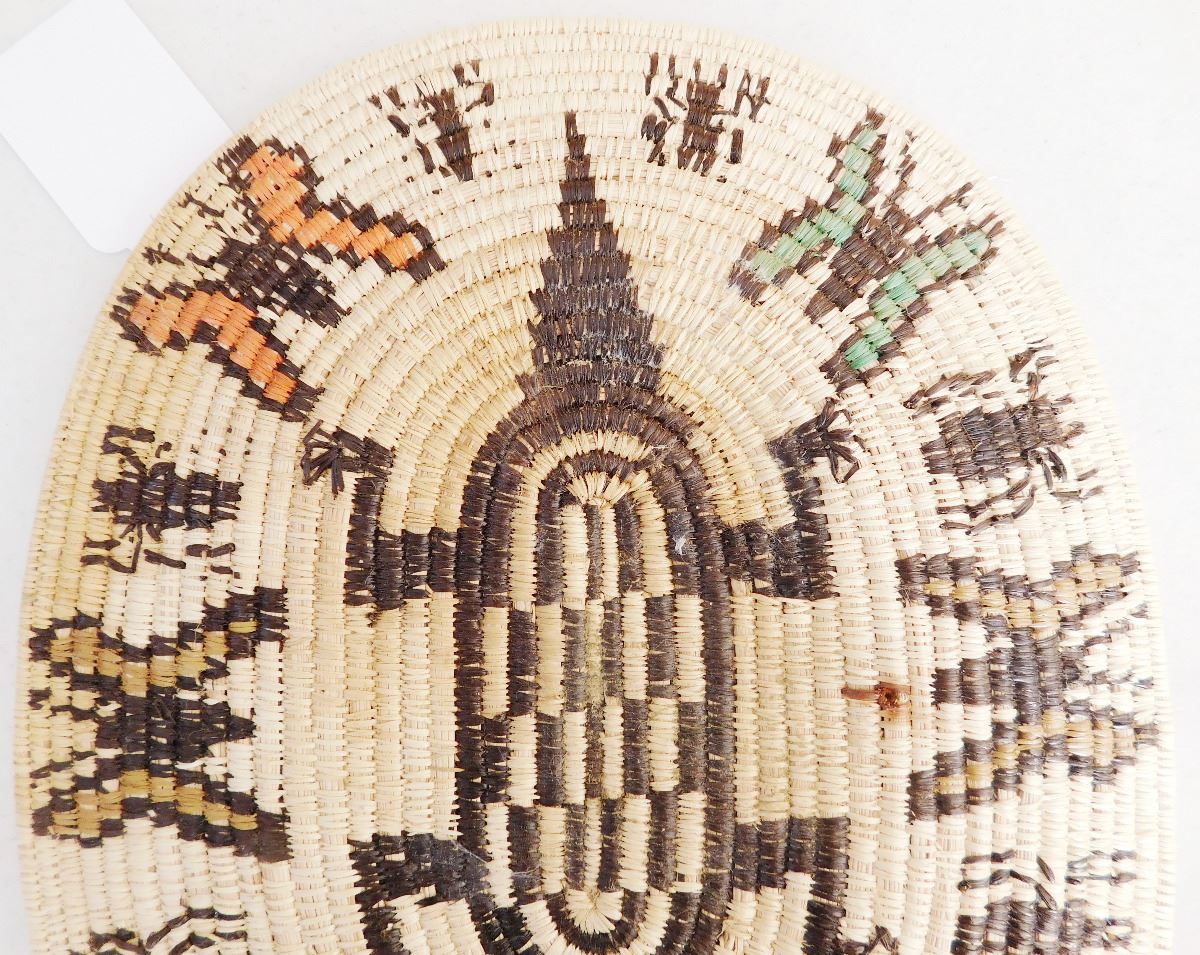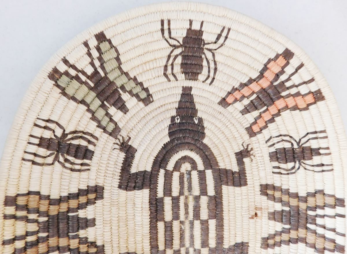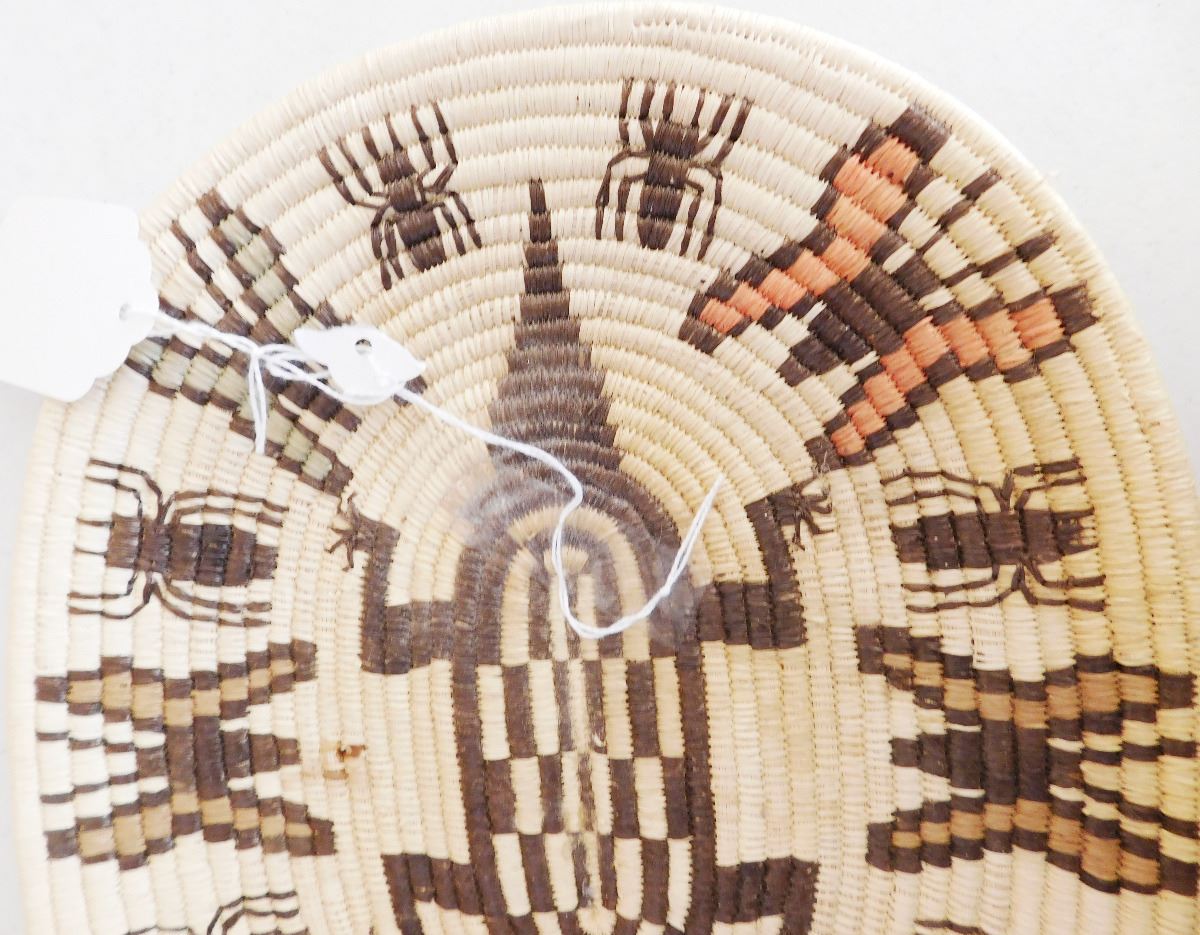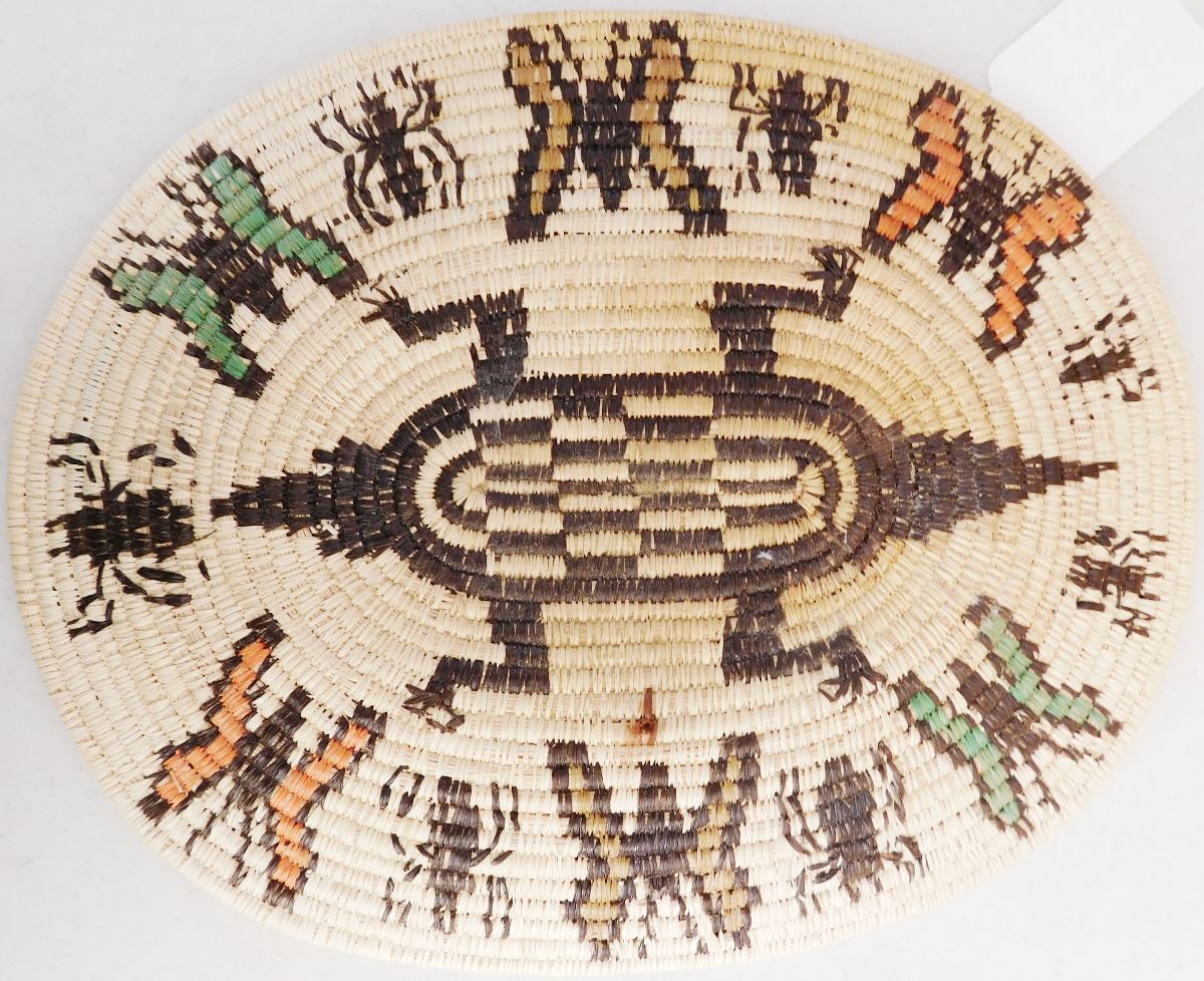 Effigy Basket, circa 1960s. Made of plant fibres and measuring 12" x 10". From Panama. Polychrome basket has butterflies, spiders and a lizard effigy. Condition: Very good, minor hole, see images. Shipping: $16.50.