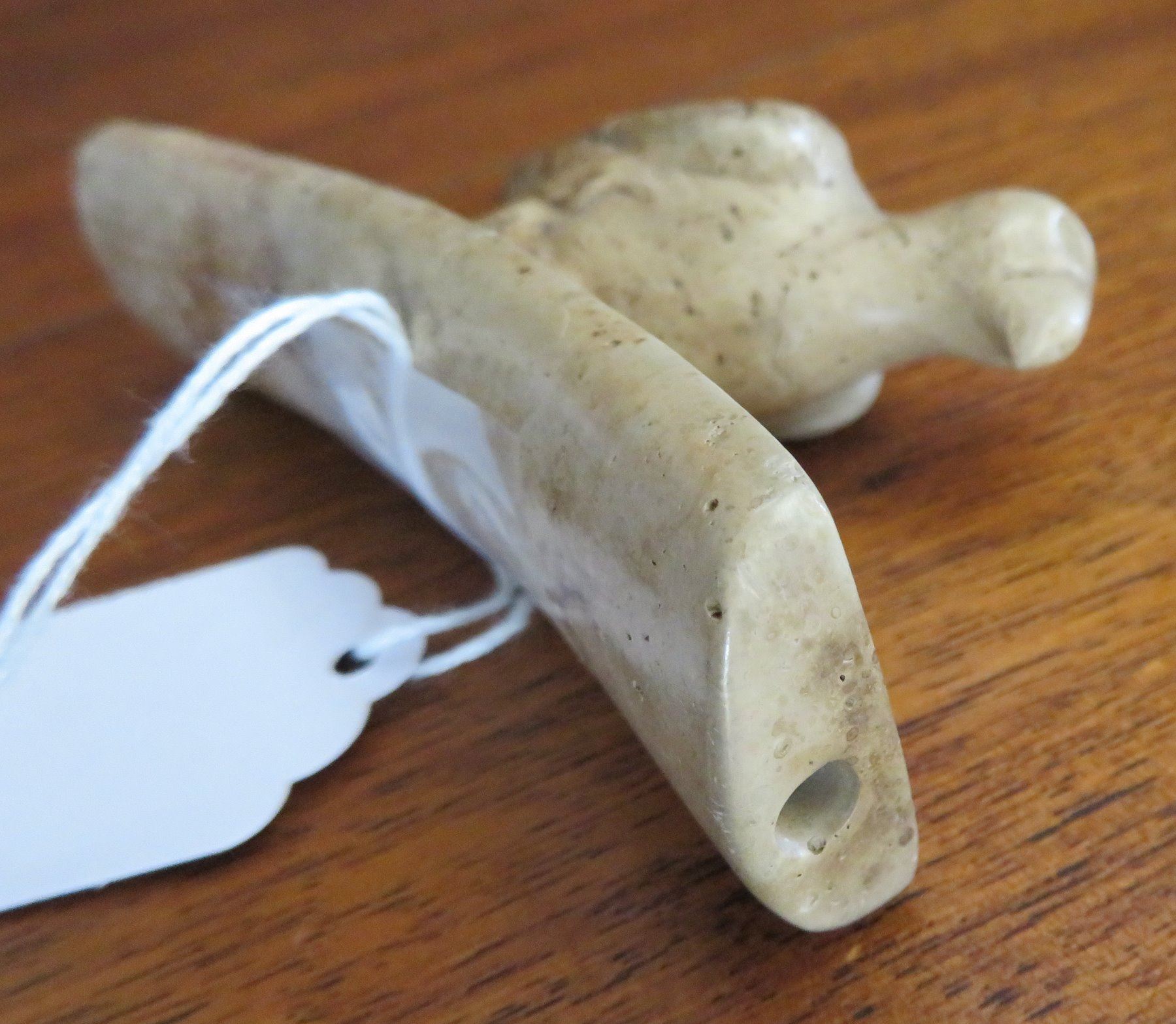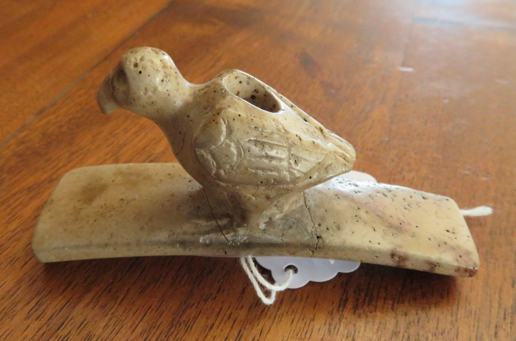 Effigy Bird Pipe, pre-historic item. Made of Ohio pipestone, the item measures 3 3/4" x 1 1/8" x 1 3/4". Ohio. Condition: Found broken and reglued, see images. Shipping: $16.50 w/insurance and signature.