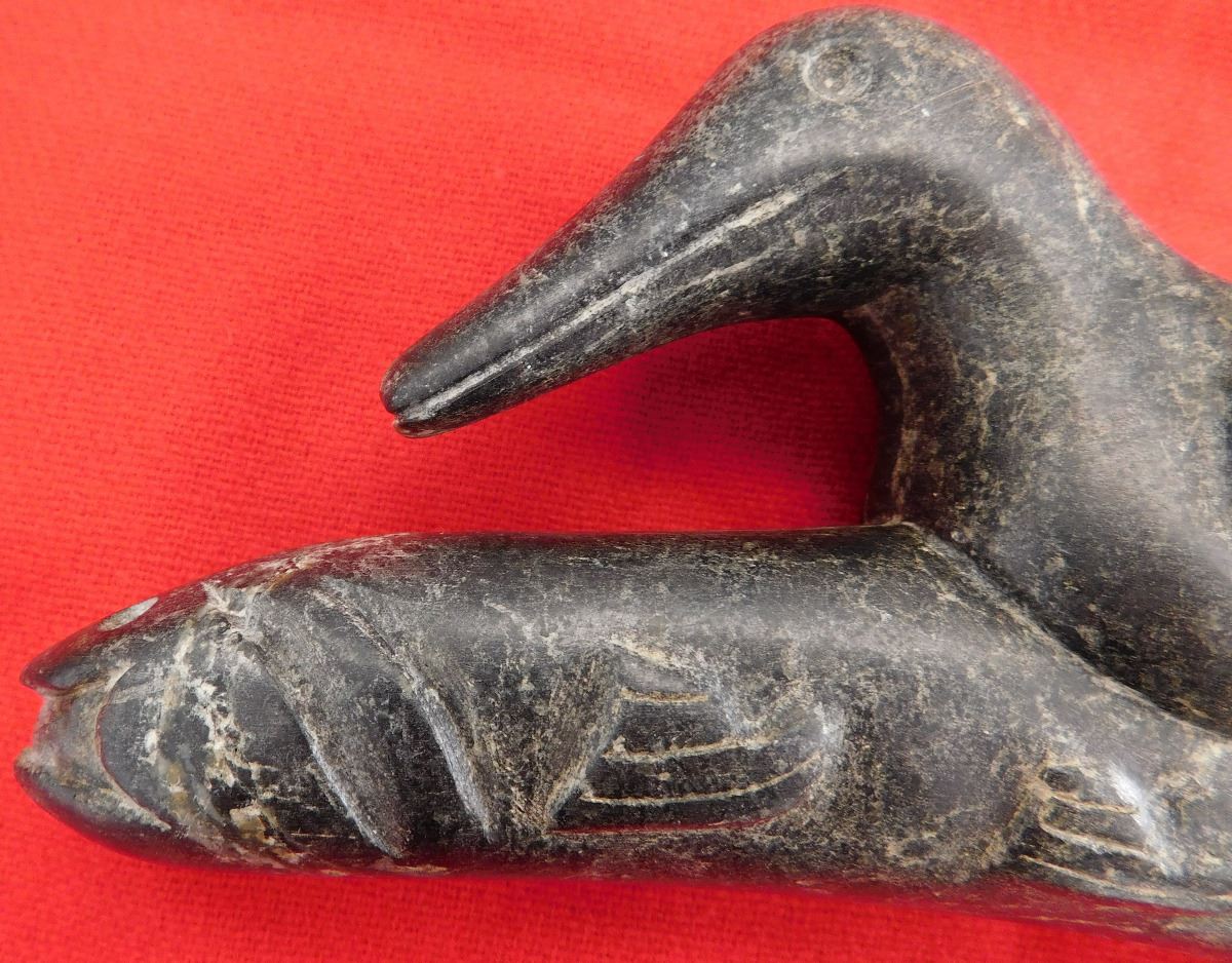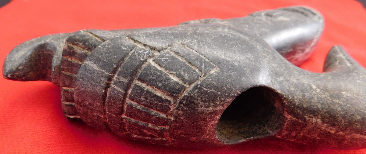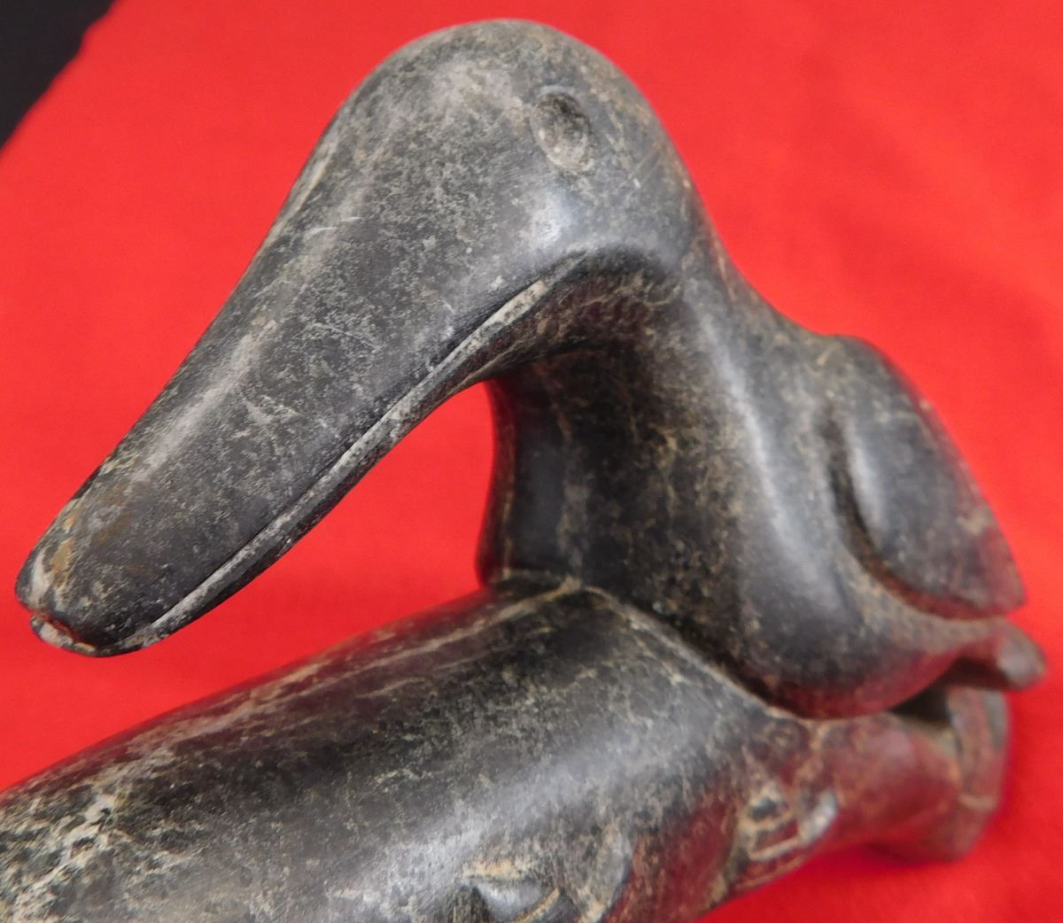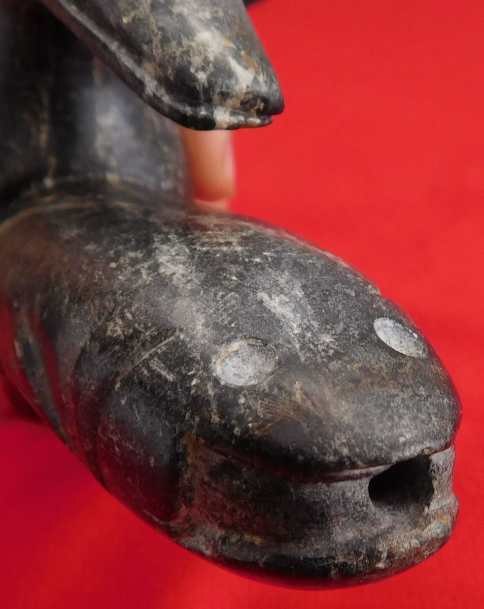 Effigy Duck & Fish Pipe, pre-historic item. Carved of steatite, this item measures 7" x 3.5" x 2". From Ross County, Ohio. Condition: Nice patina, minor scratches and scuffs, see images. Shipping: $16.50.
