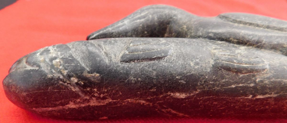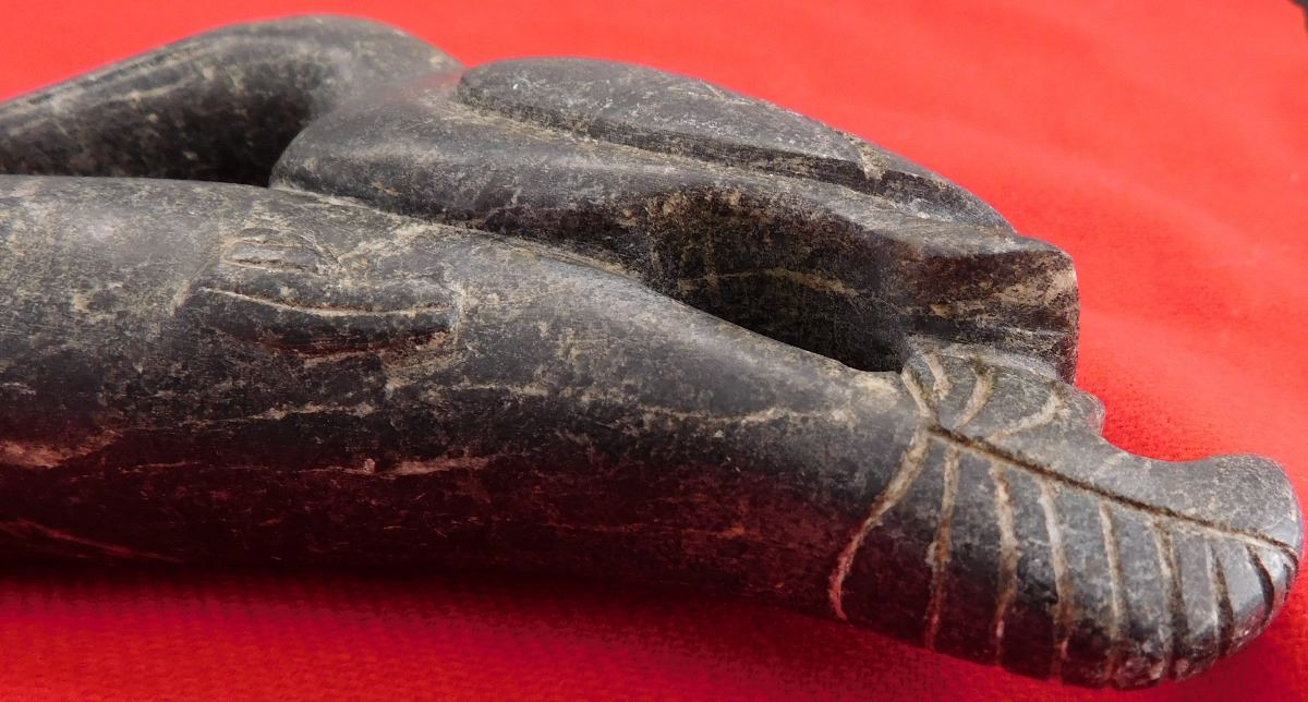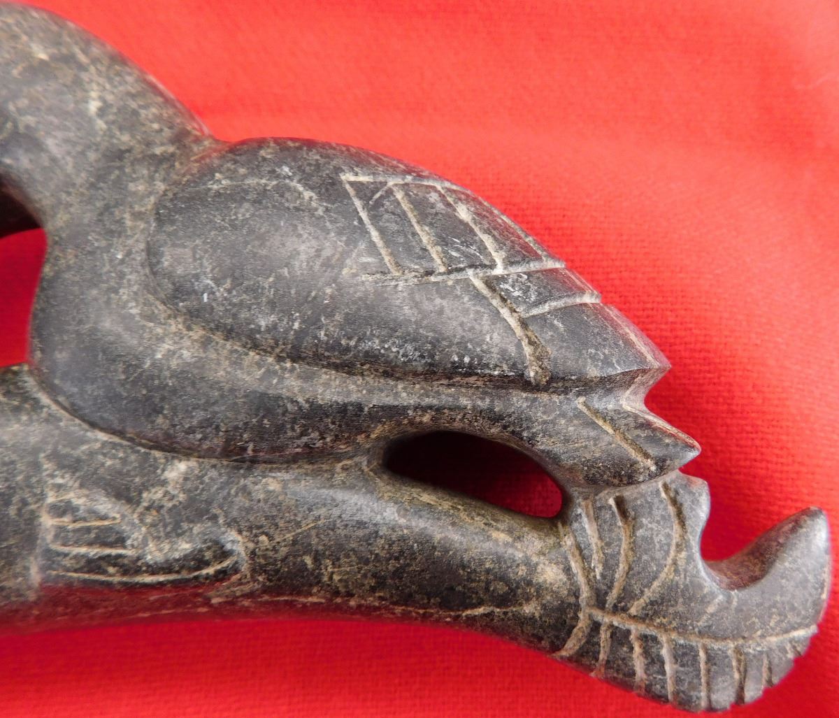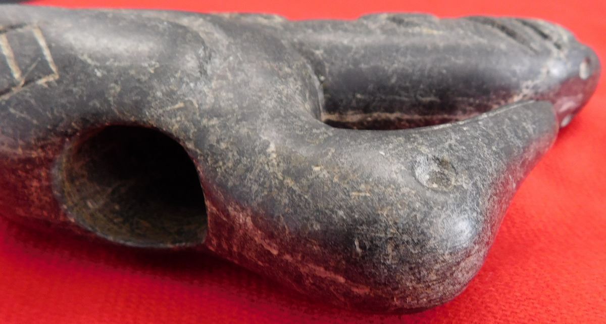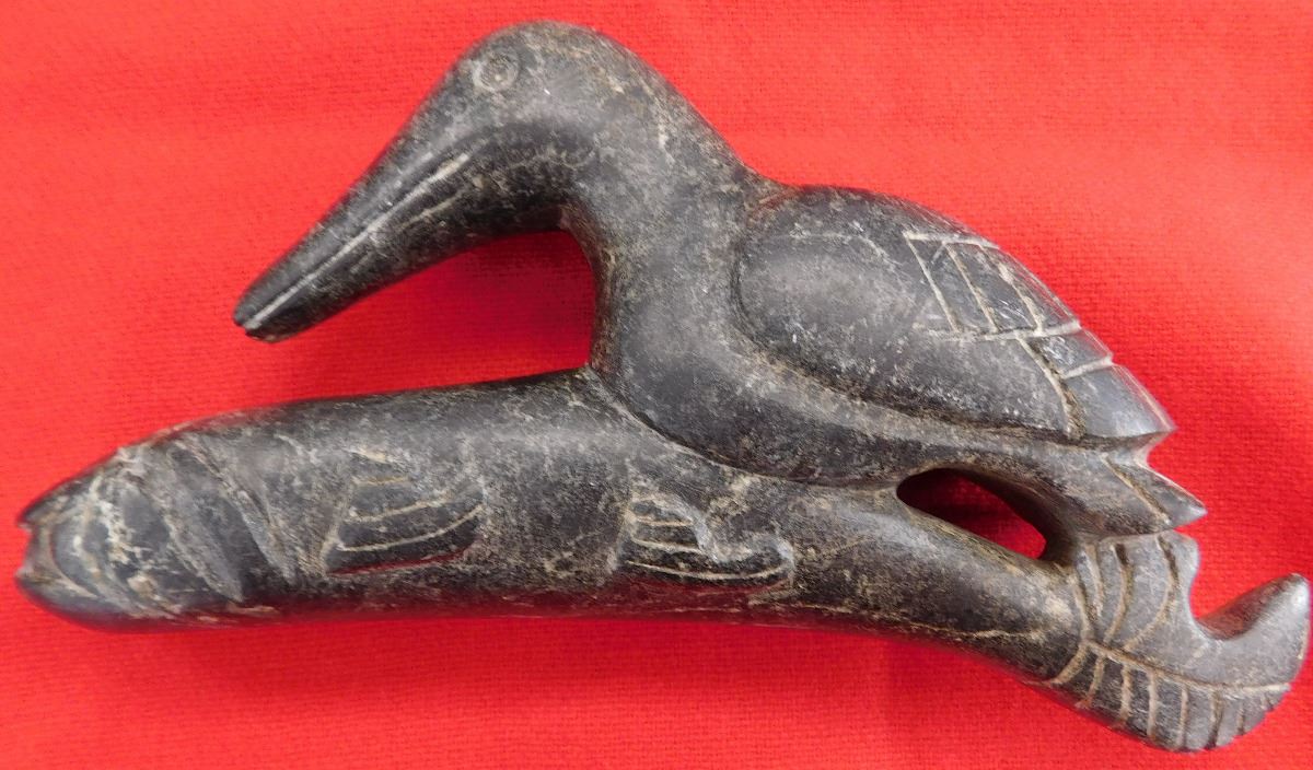 Effigy Duck & Fish Pipe, pre-historic item. Carved of steatite, this item measures 7" x 3.5" x 2". From Ross County, Ohio. Condition: Nice patina, minor scratches and scuffs, see images. Shipping: $16.50.