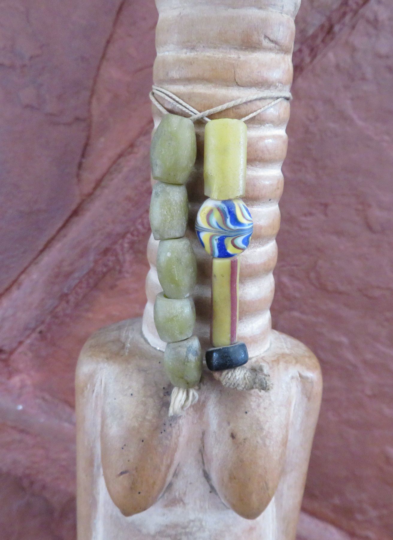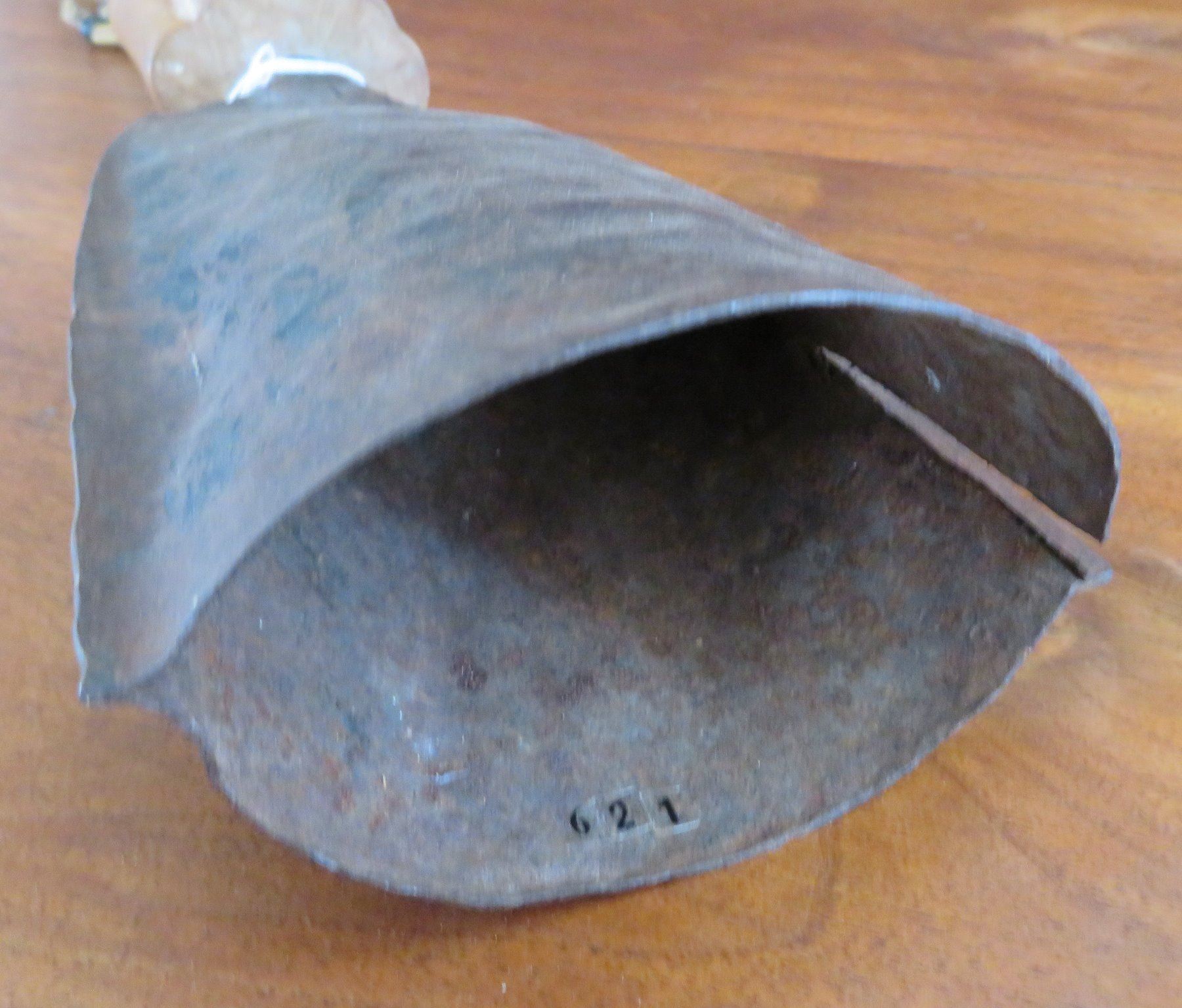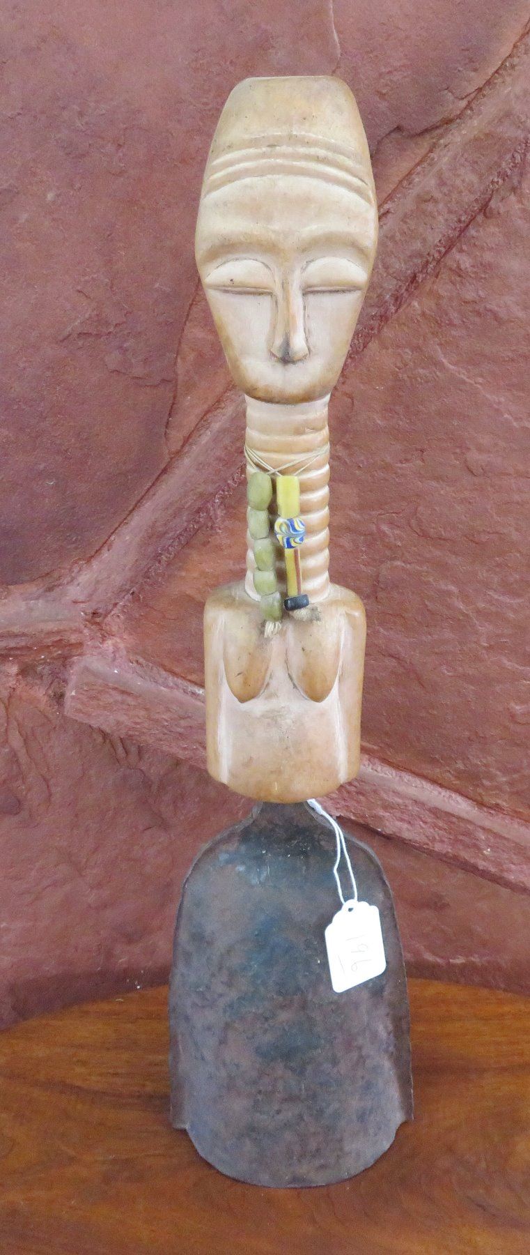 Effigy Metal Bell w/Handle, late 20th century item. Made of wood and metal, the item measures 19". Ashanti, Ghana. Has beads, older bell. Condition: Good, see images. Shipping: $30.00 w/insurance and signature, due to length and weight.