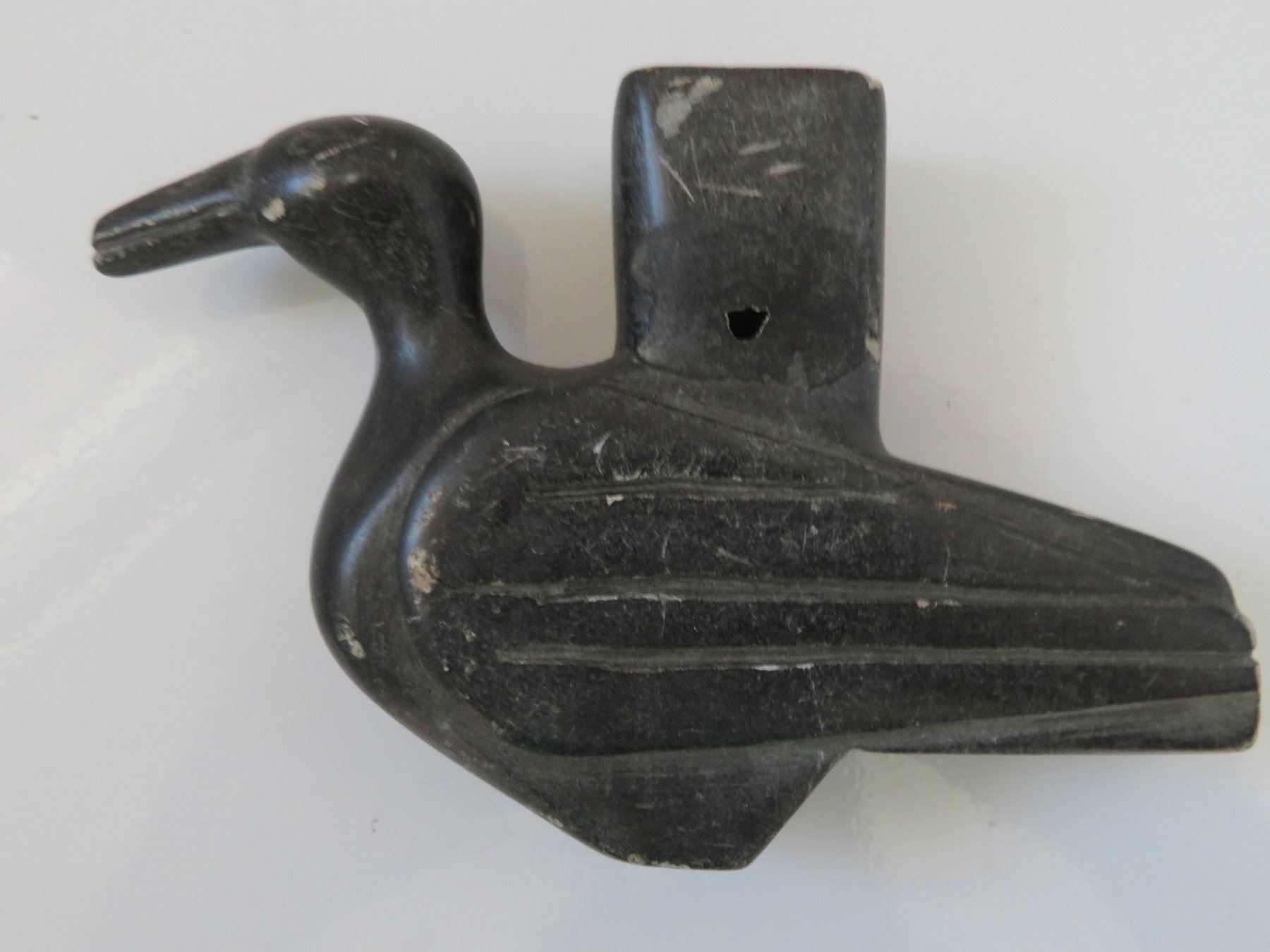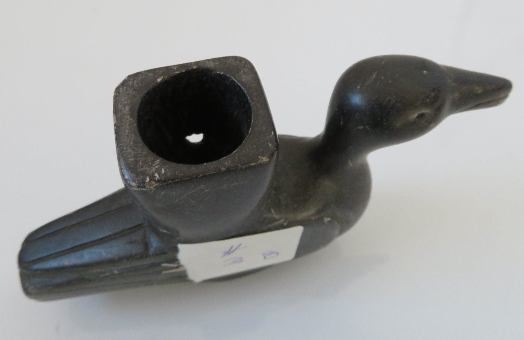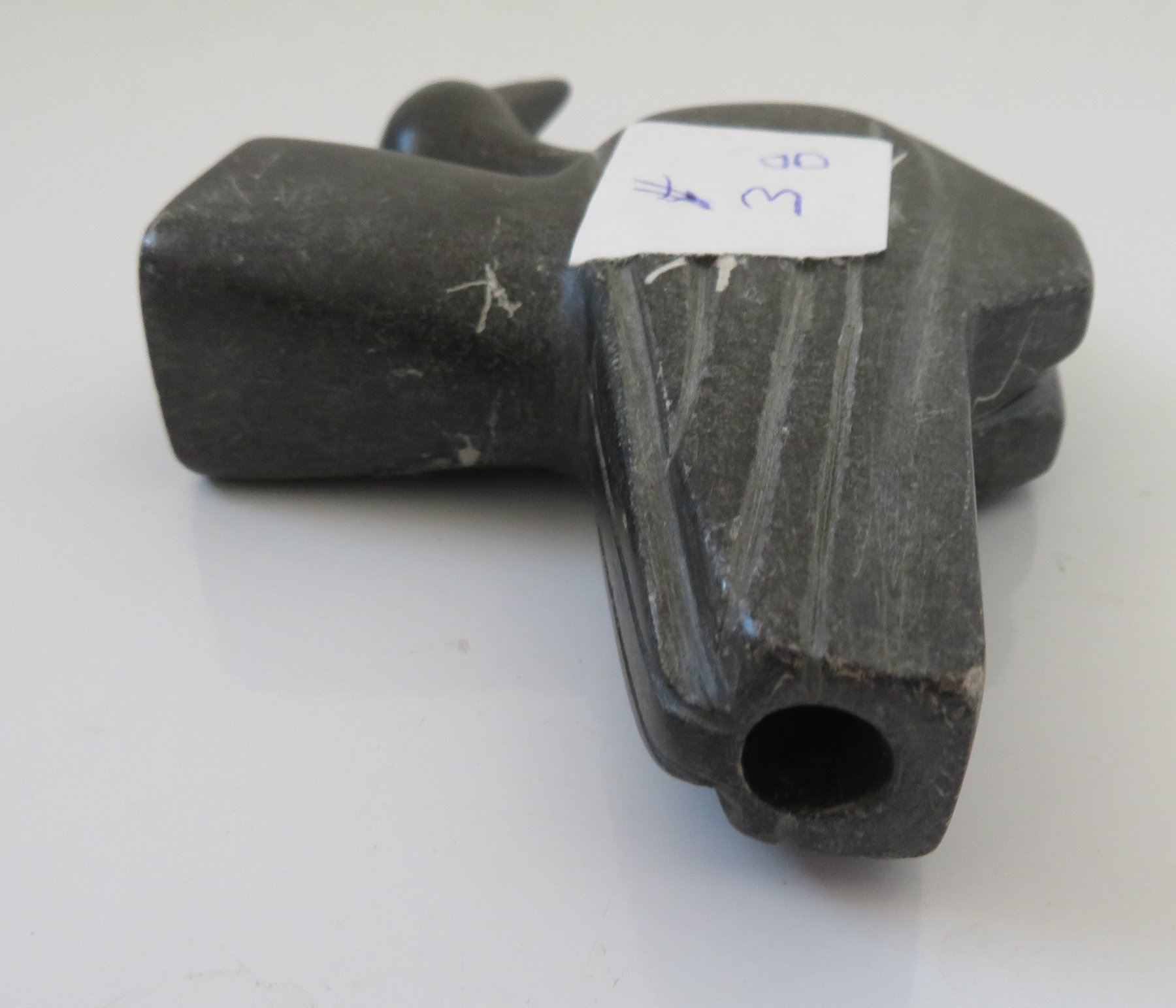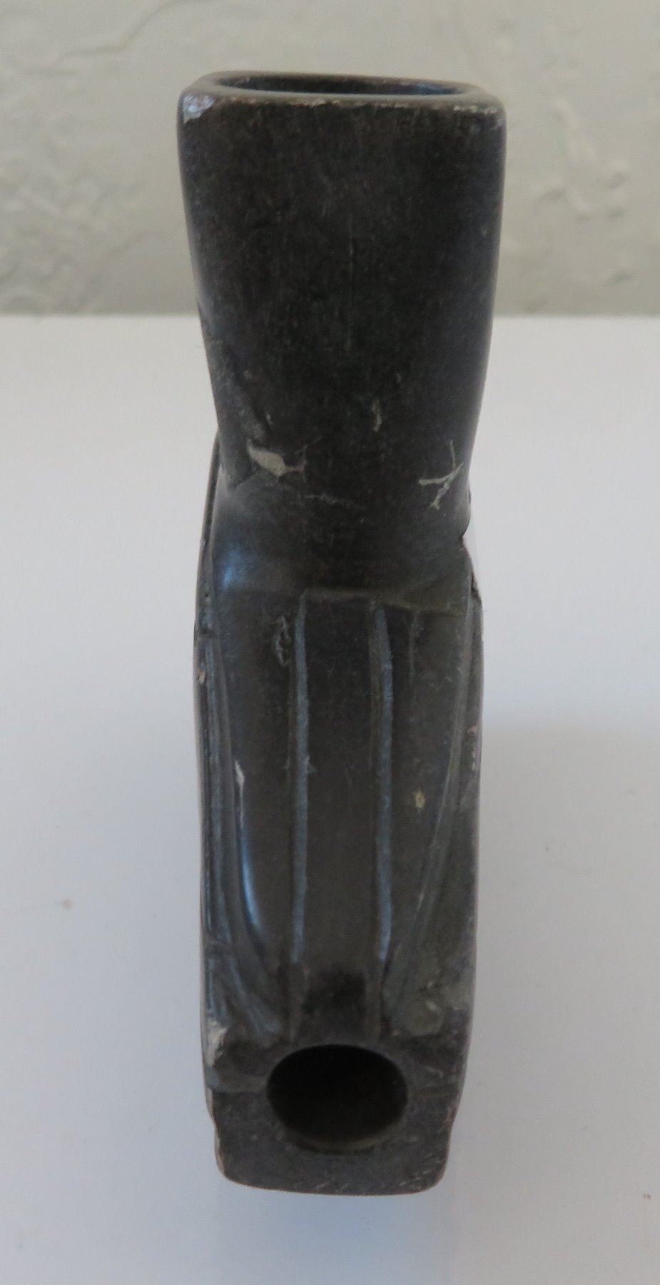 Effigy Pipe Bowl, early historic period. Made of steatite, the item measures 5" x 1 1/2". Indiana. Condition: Side hole in bowl, scratches, see images. Shipping: $25.00 w/insurance and signature.