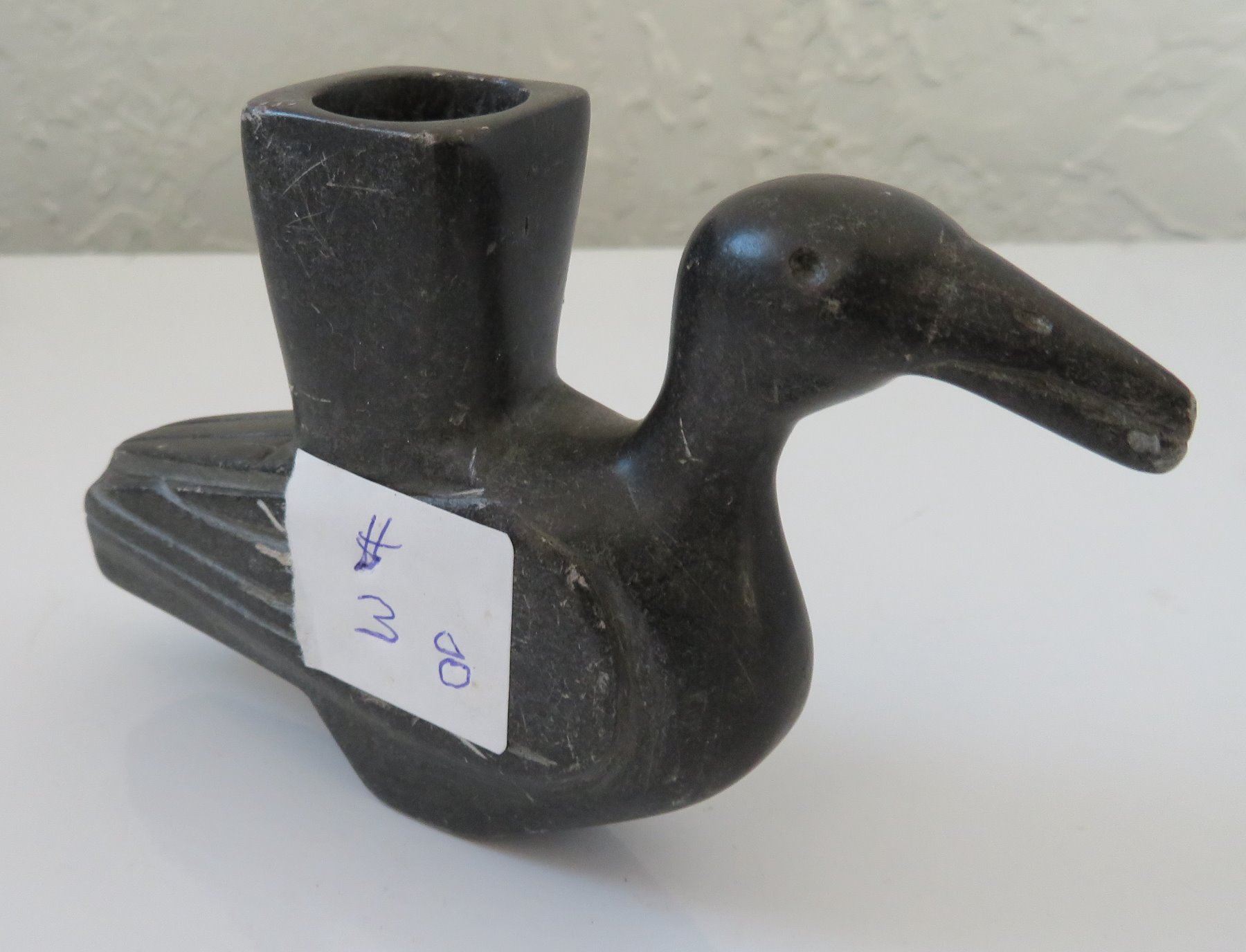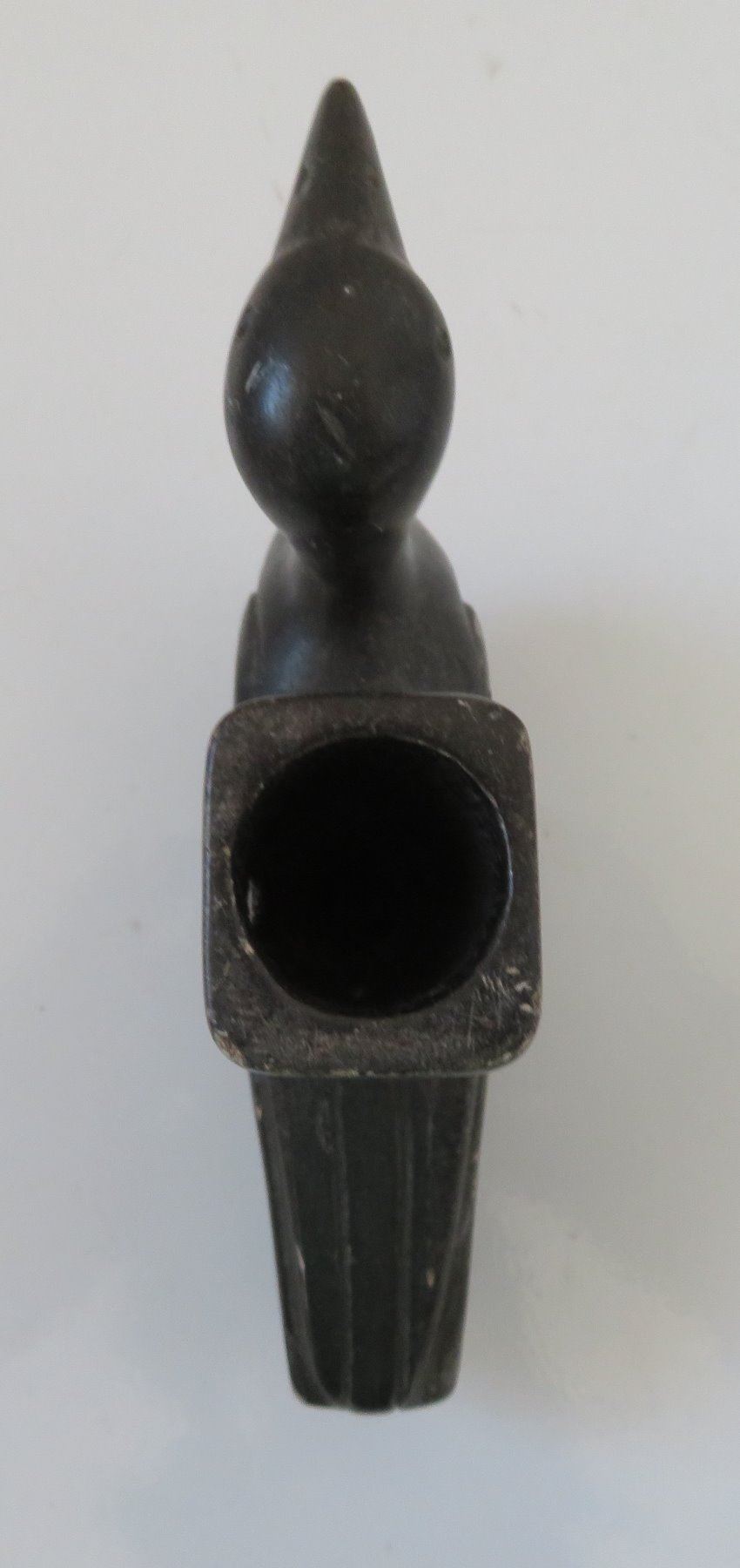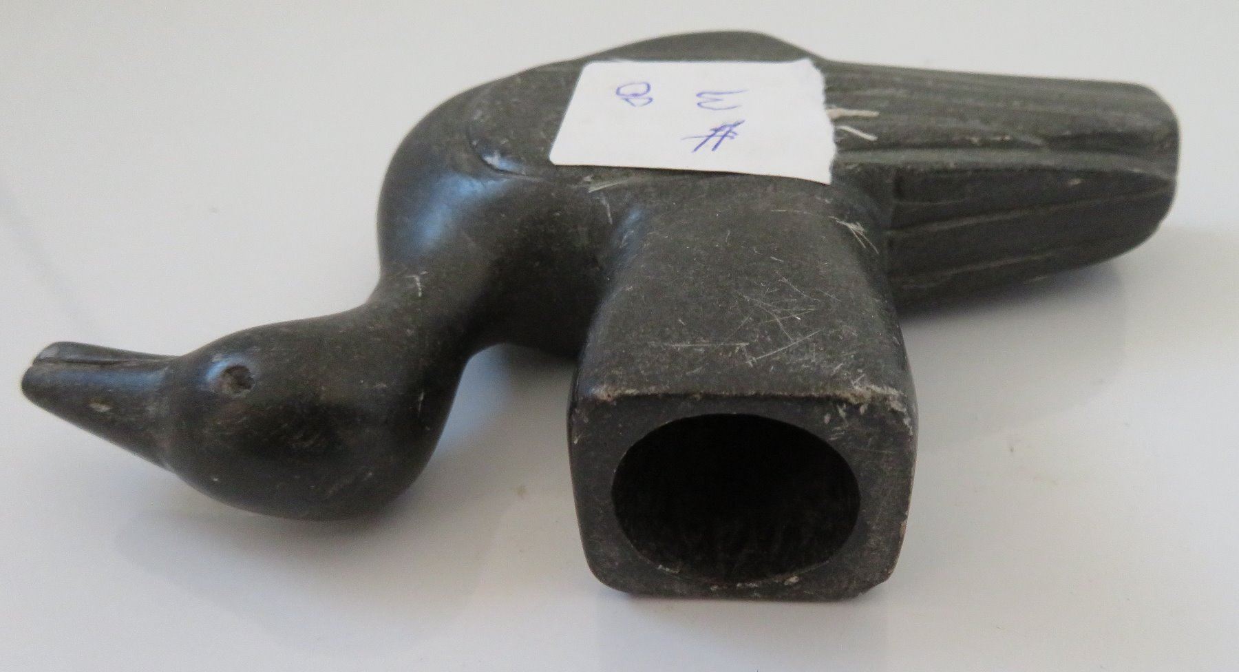 Effigy Pipe Bowl, early historic period. Made of steatite, the item measures 5" x 1 1/2". Indiana. Condition: Side hole in bowl, scratches, see images. Shipping: $25.00 w/insurance and signature.