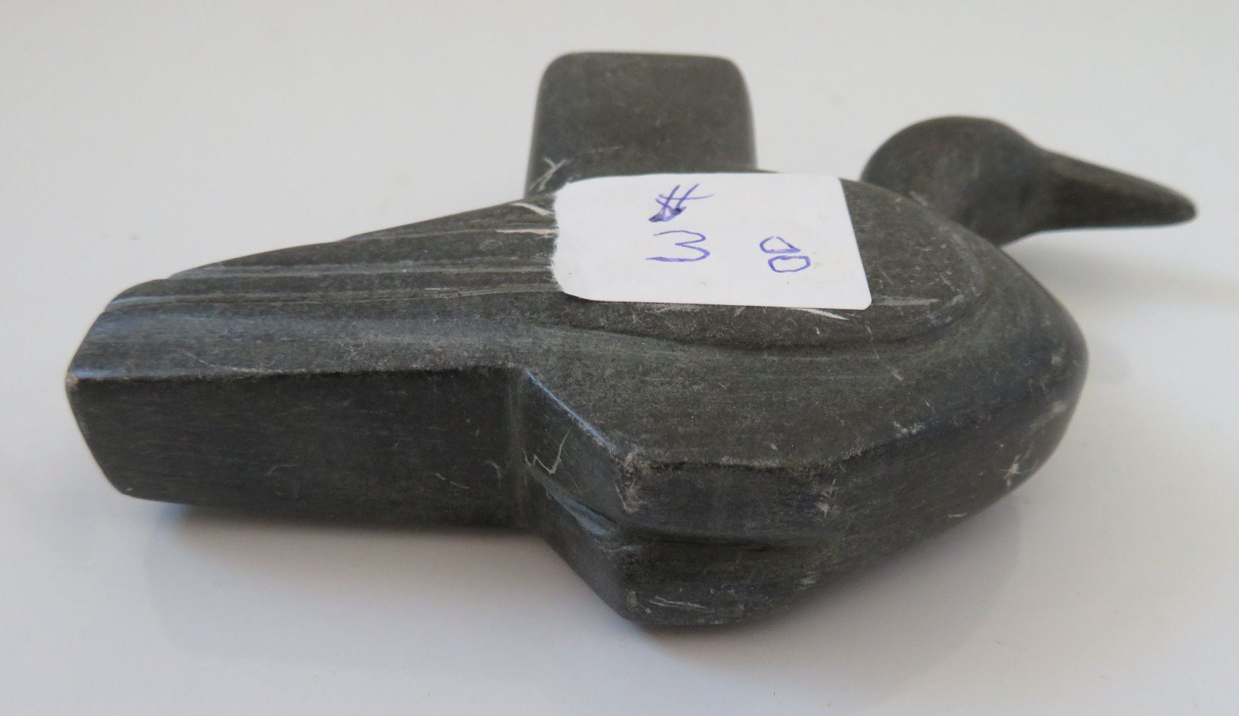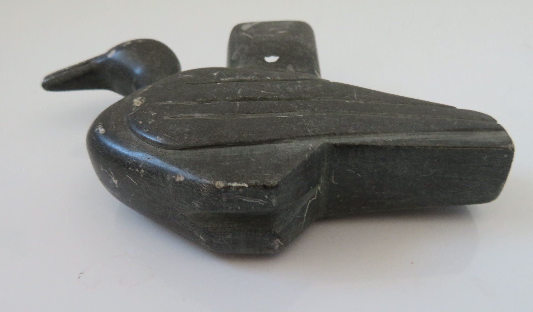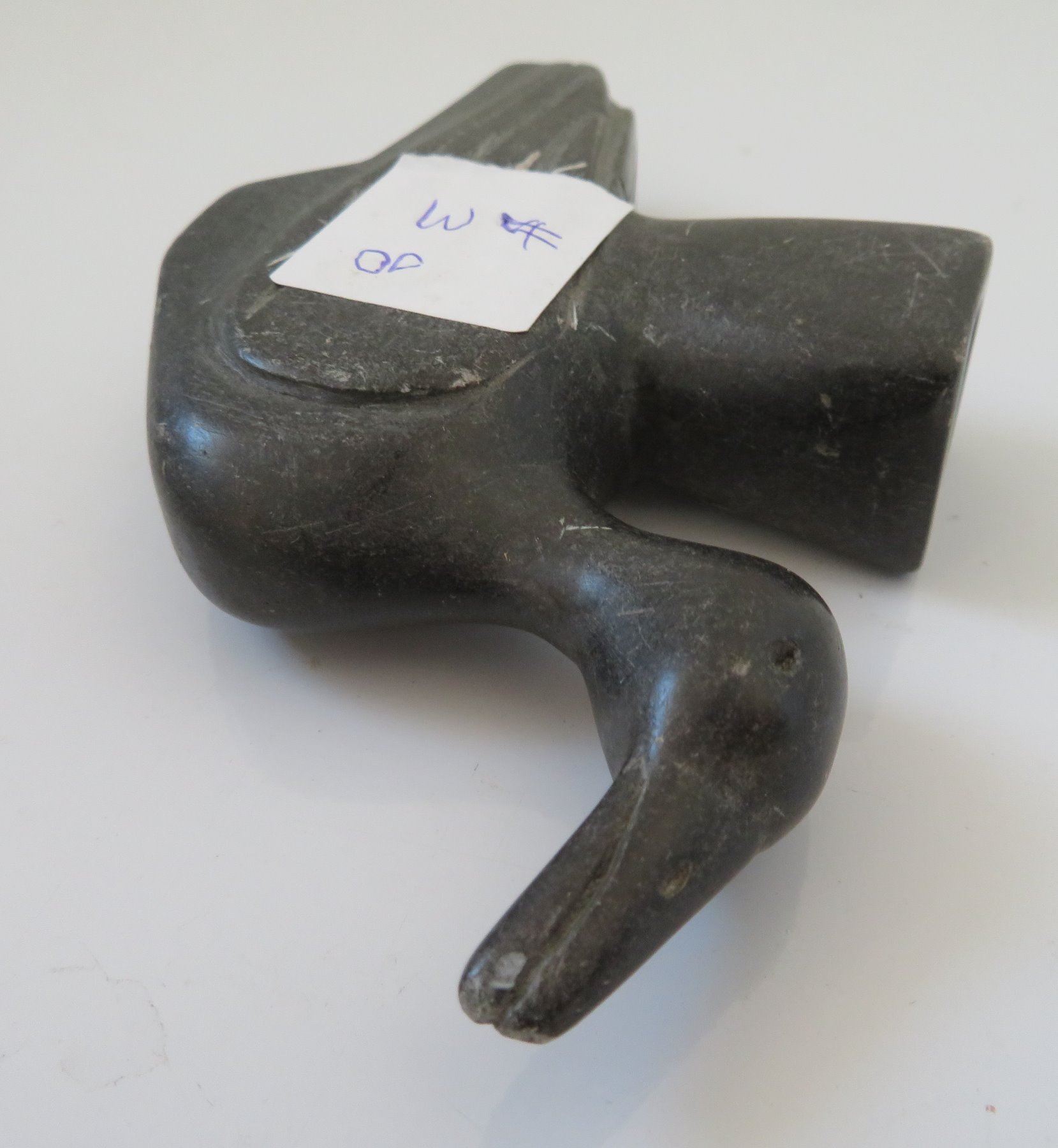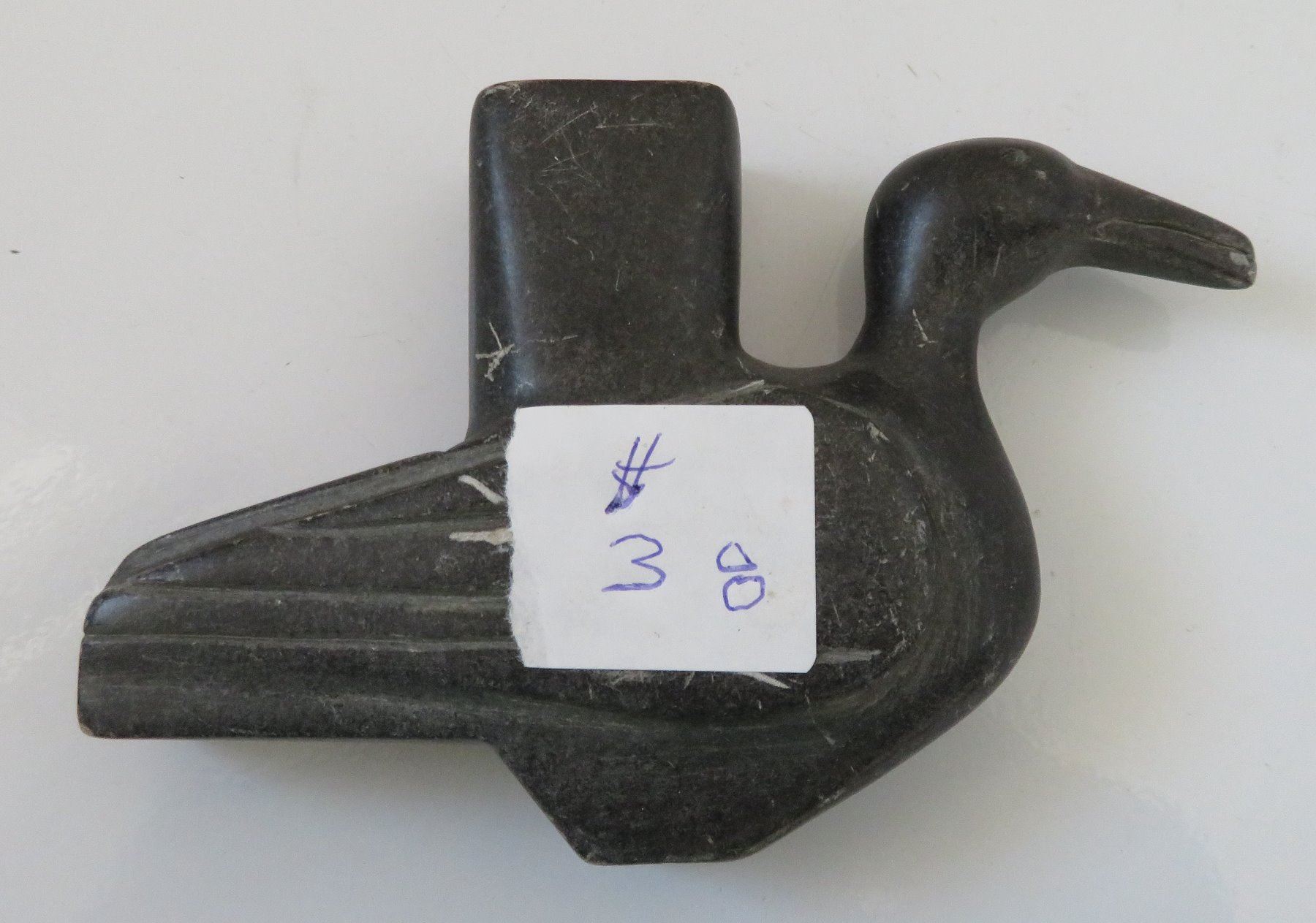 Effigy Pipe Bowl, early historic period. Made of steatite, the item measures 5" x 1 1/2". Indiana. Condition: Side hole in bowl, scratches, see images. Shipping: $25.00 w/insurance and signature.