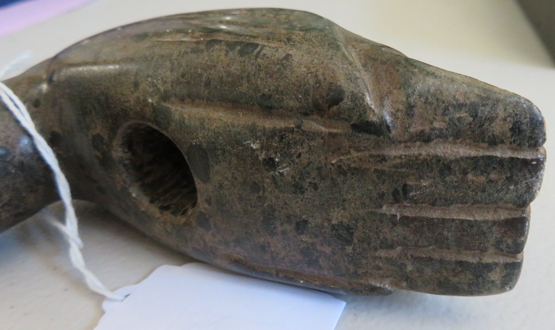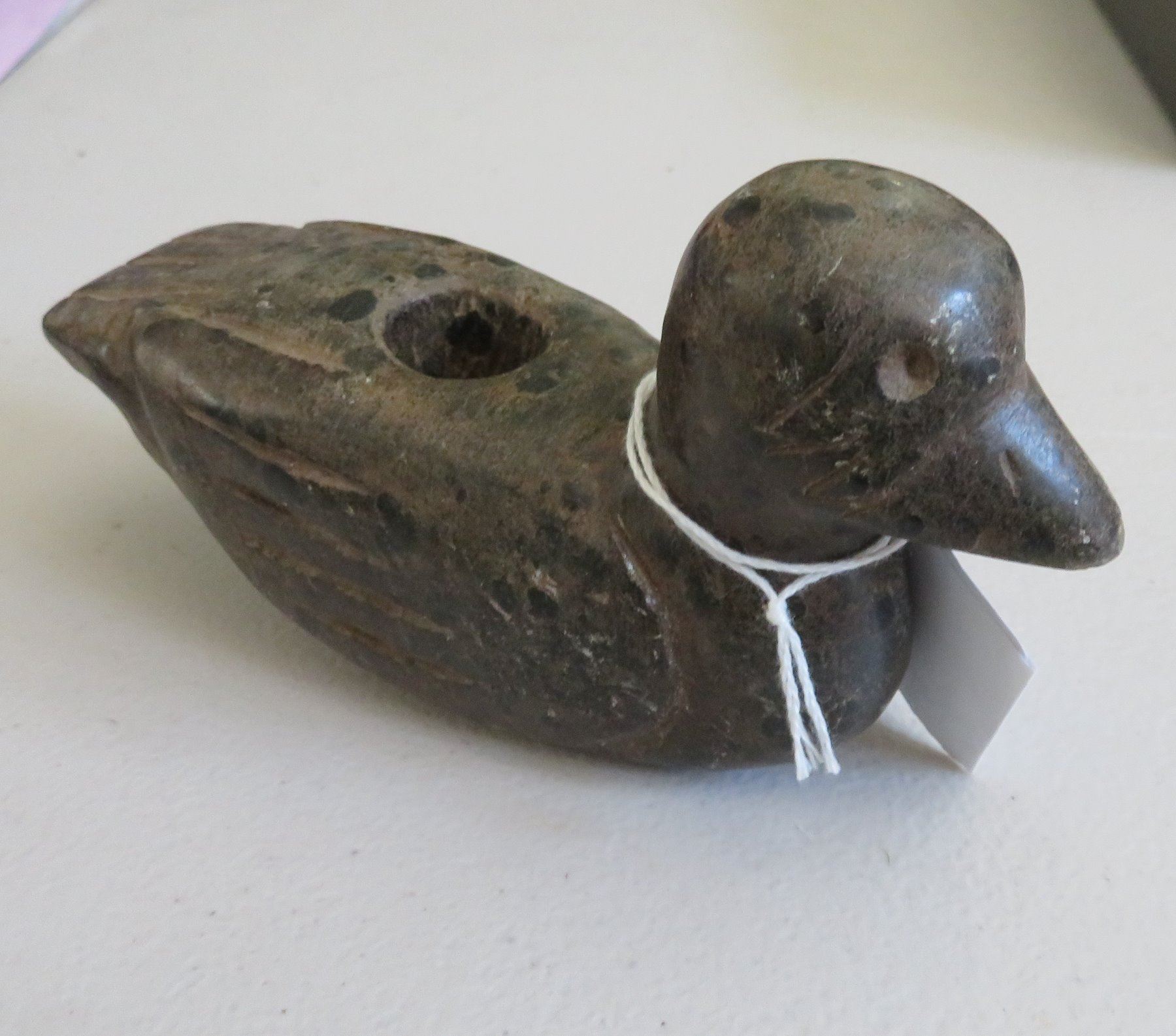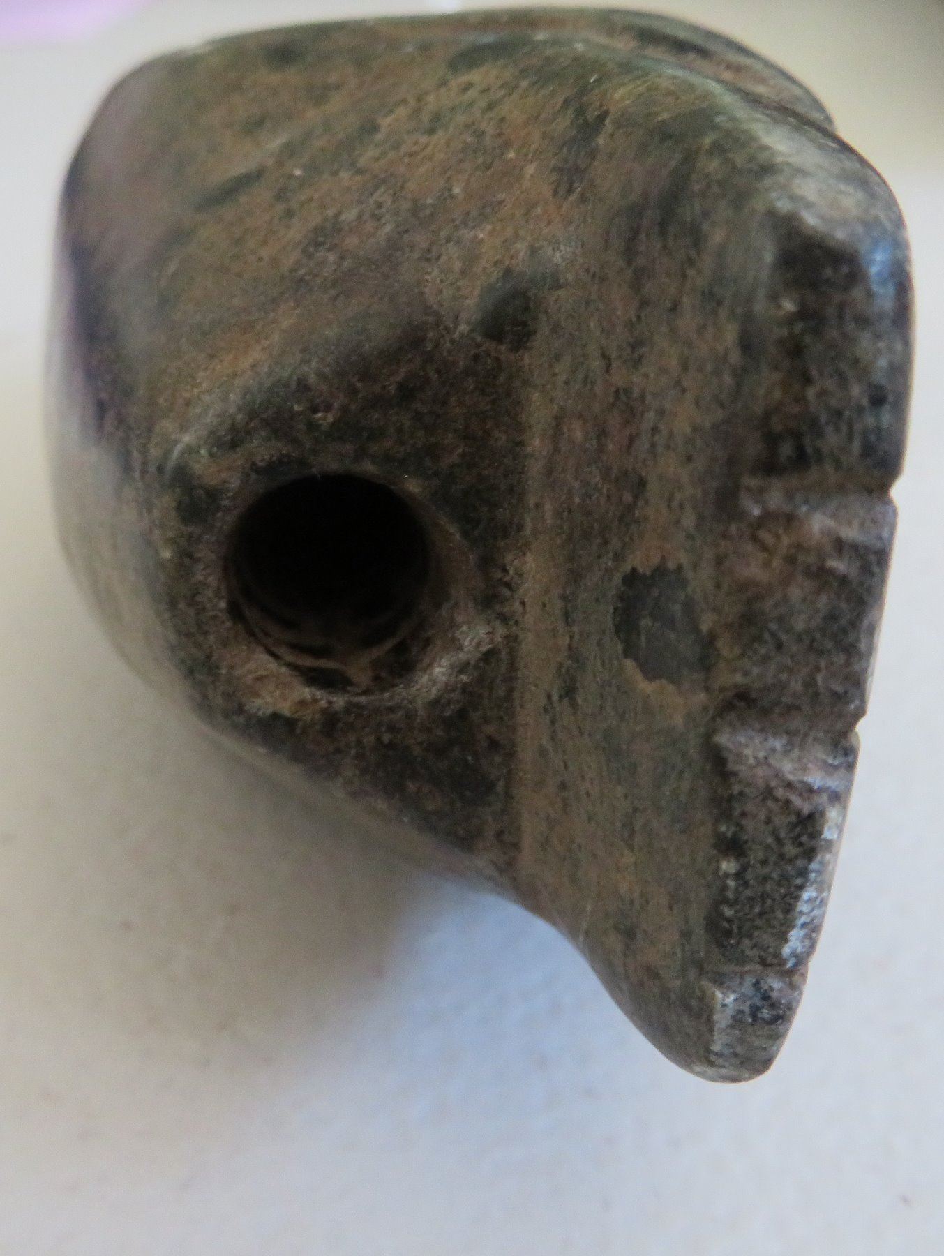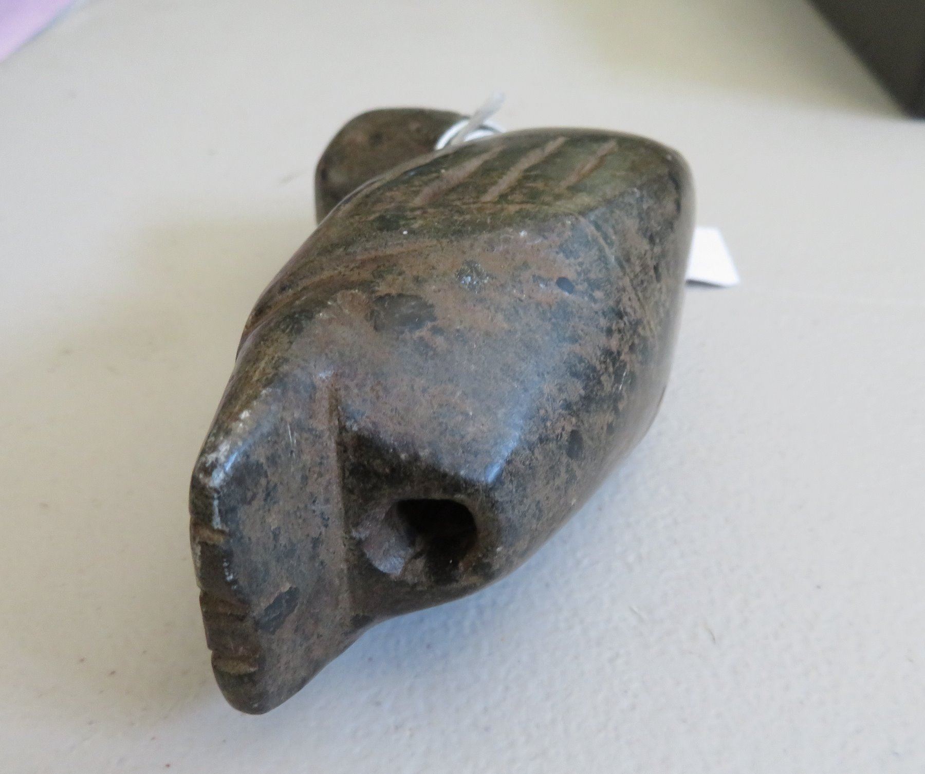 Effigy Pipe, pre-historic item. Made of steatite, the item measures 6" x 3" x 2". Ohio. Condition: Good, see images. Shipping: $22.50 w/insurance and signature.