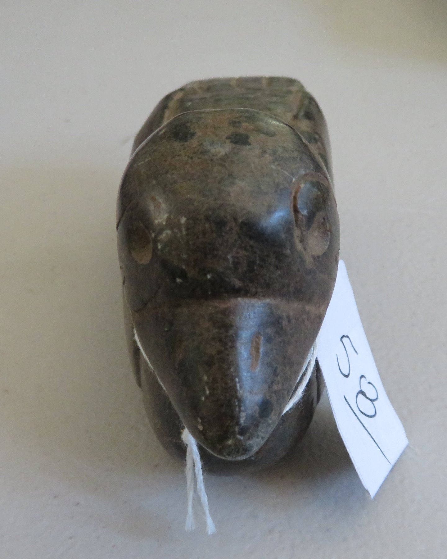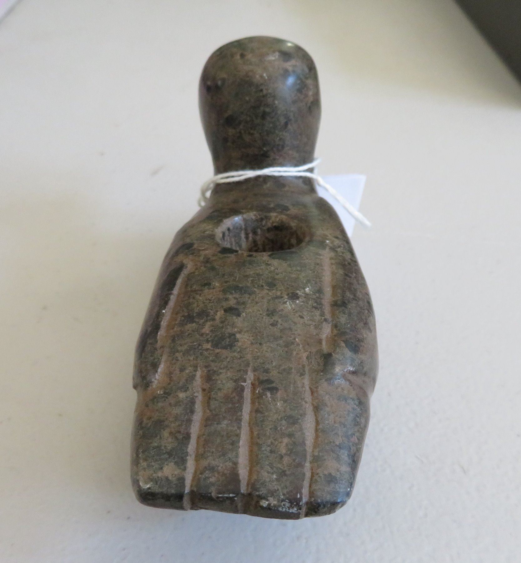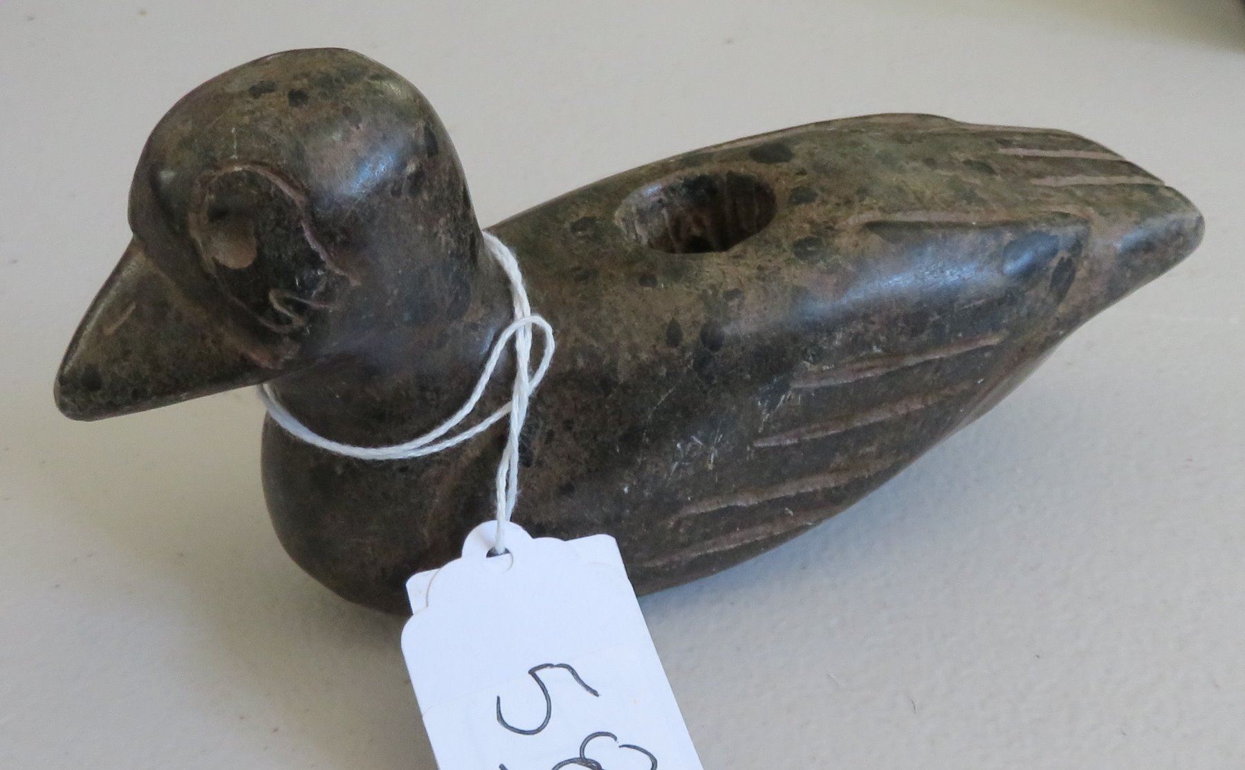 Effigy Pipe, pre-historic item. Made of steatite, the item measures 6" x 3" x 2". Ohio. Condition: Good, see images. Shipping: $22.50 w/insurance and signature.