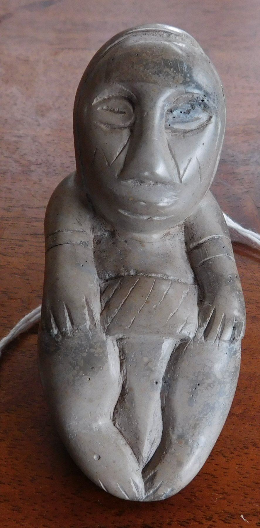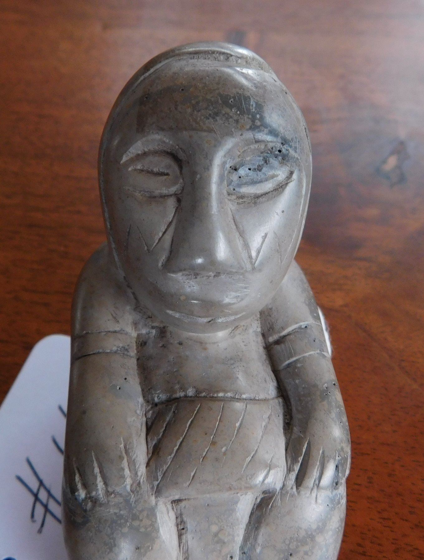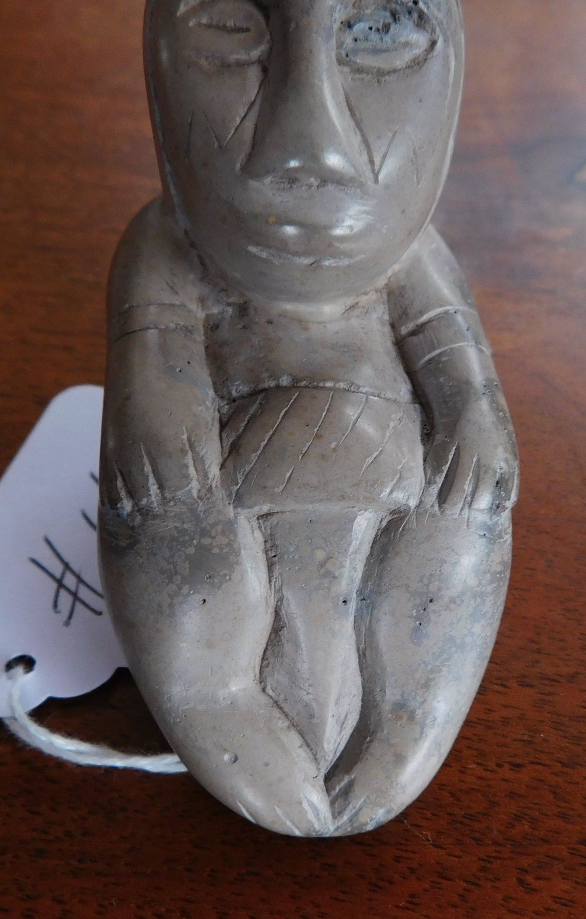Effigy Seated Stone Figure, pre-historic item. Made of Ohio pipestone, the item measures 1 1/2" x 3" x 2 1/4". Hopewell period. Missouri. Engraved throughout. From an old, 1960s California collection. Condition: Good, see images. Shipping: $16.50 w/insurance and signature.