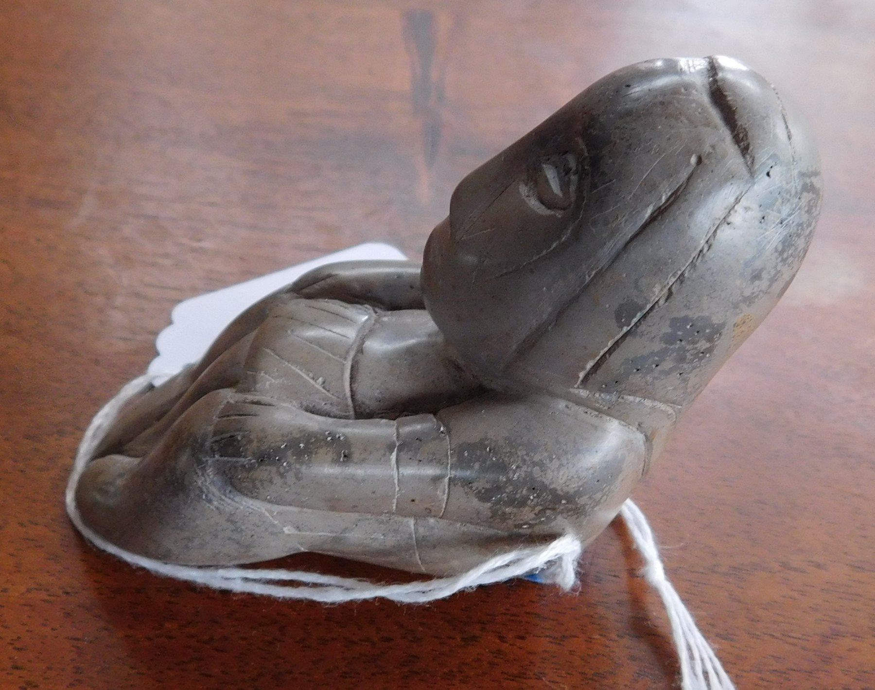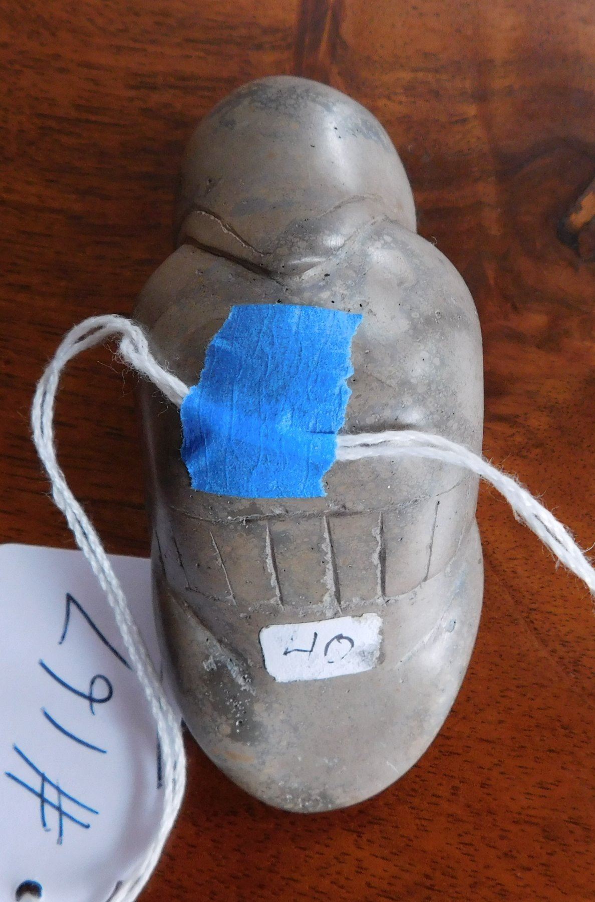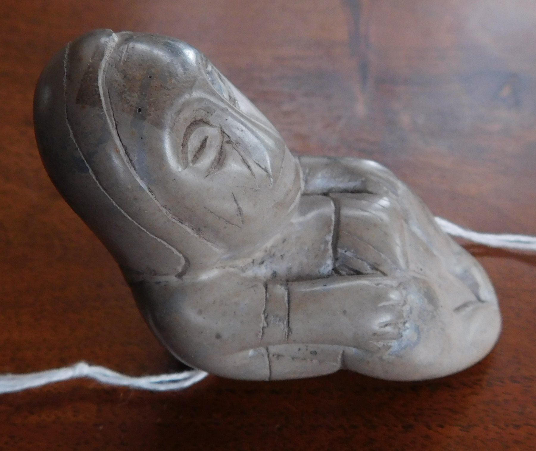 Effigy Seated Stone Figure, pre-historic item. Made of Ohio pipestone, the item measures 1 1/2" x 3" x 2 1/4". Hopewell period. Missouri. Engraved throughout. From an old, 1960s California collection. Condition: Good, see images. Shipping: $16.50 w/insurance and signature.