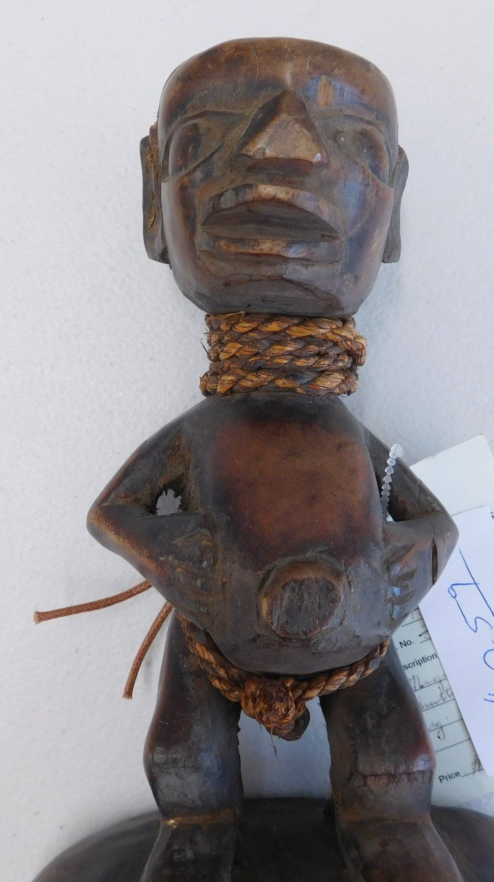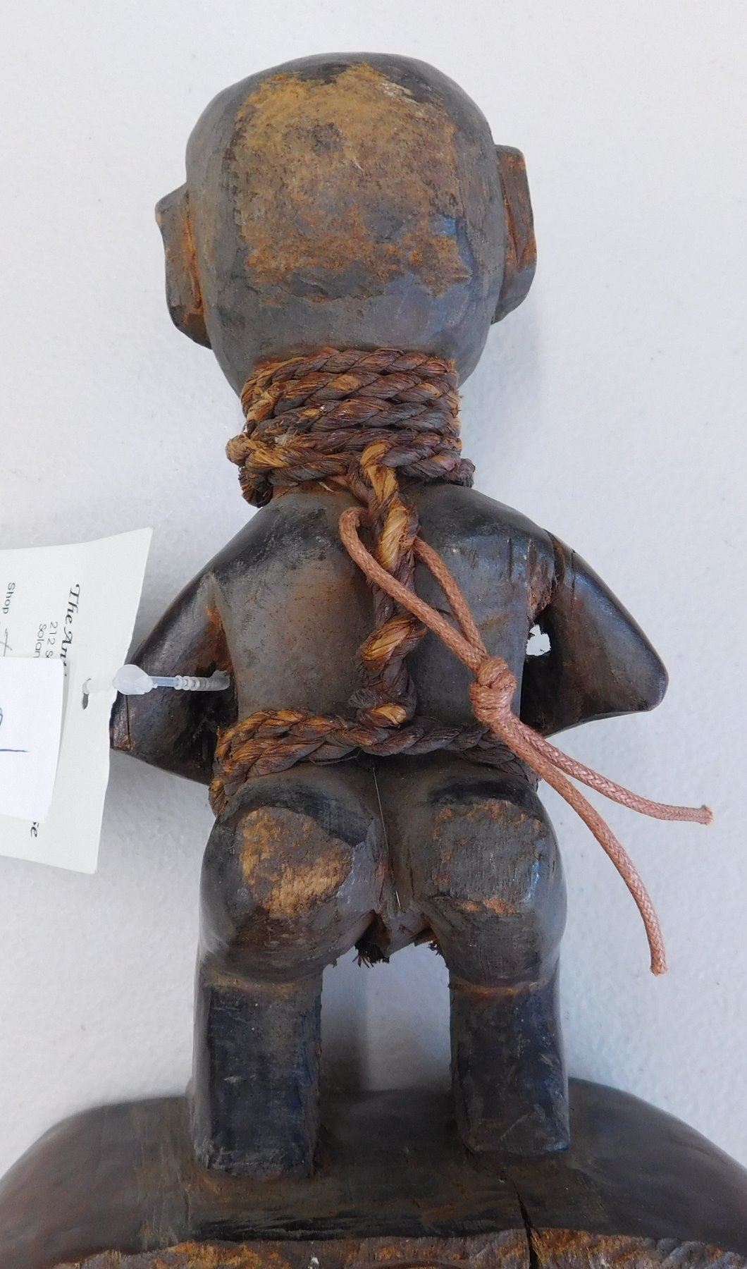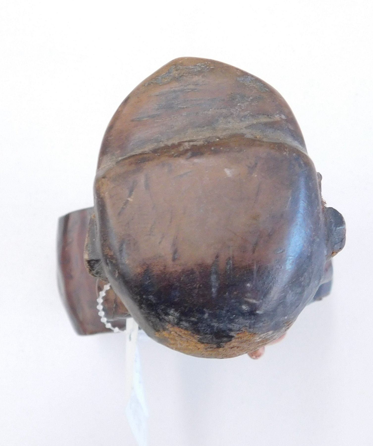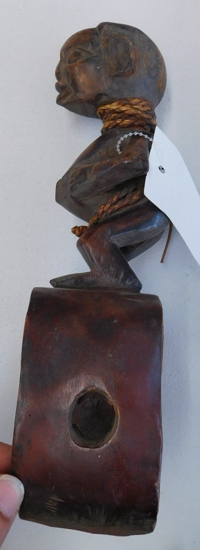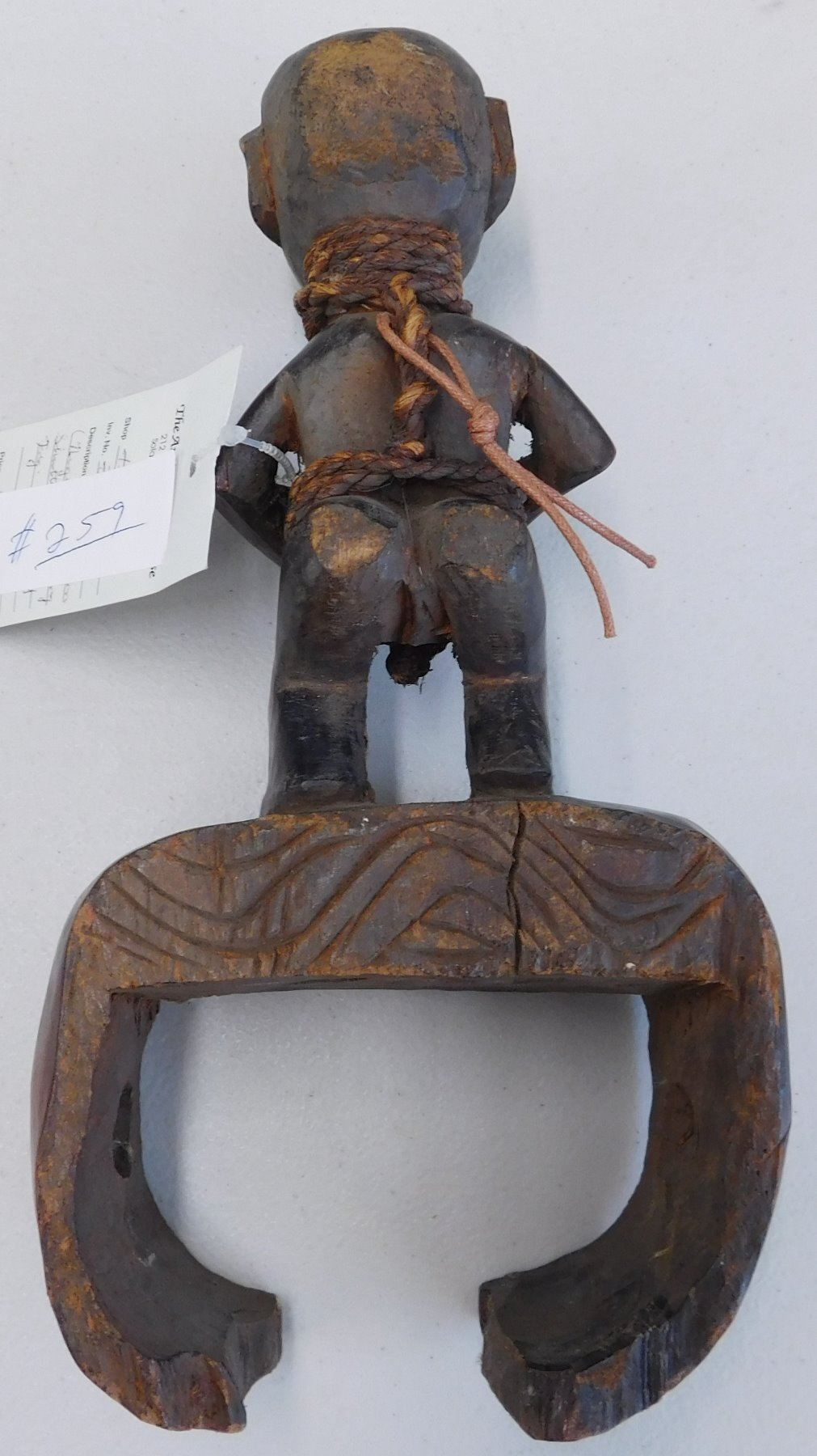 Effigy Shuttle Piece, circa 1900. Made of wood and cord, the item measures 11" x 5" x 3". Possibly Nigerian. Nice old carving. Condition: Broken on bottom, see images. Shipping: $27.50 w/insurance and signature, due to length.