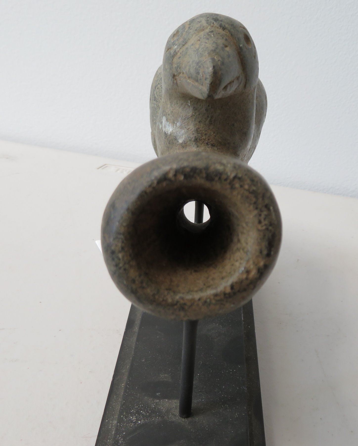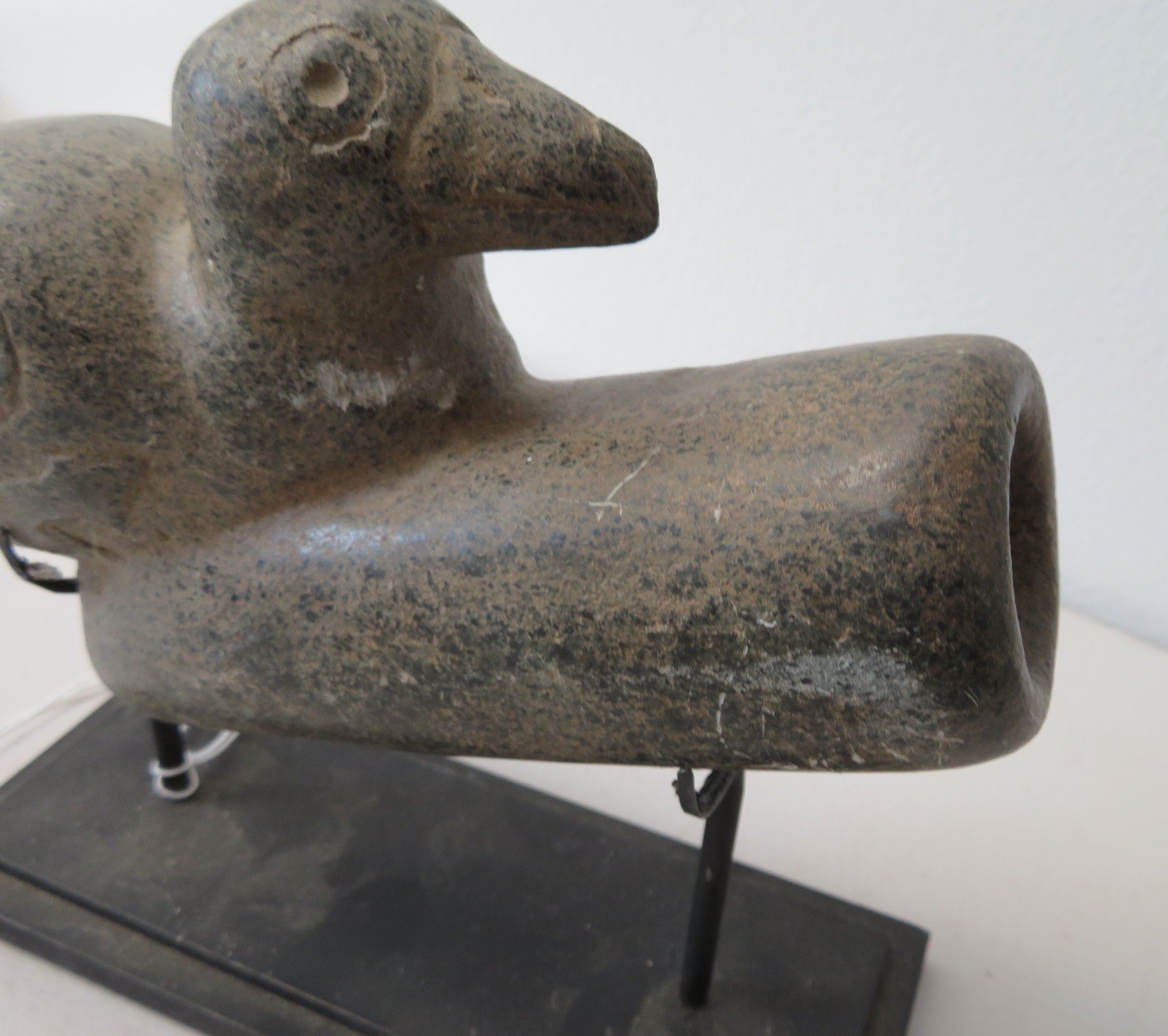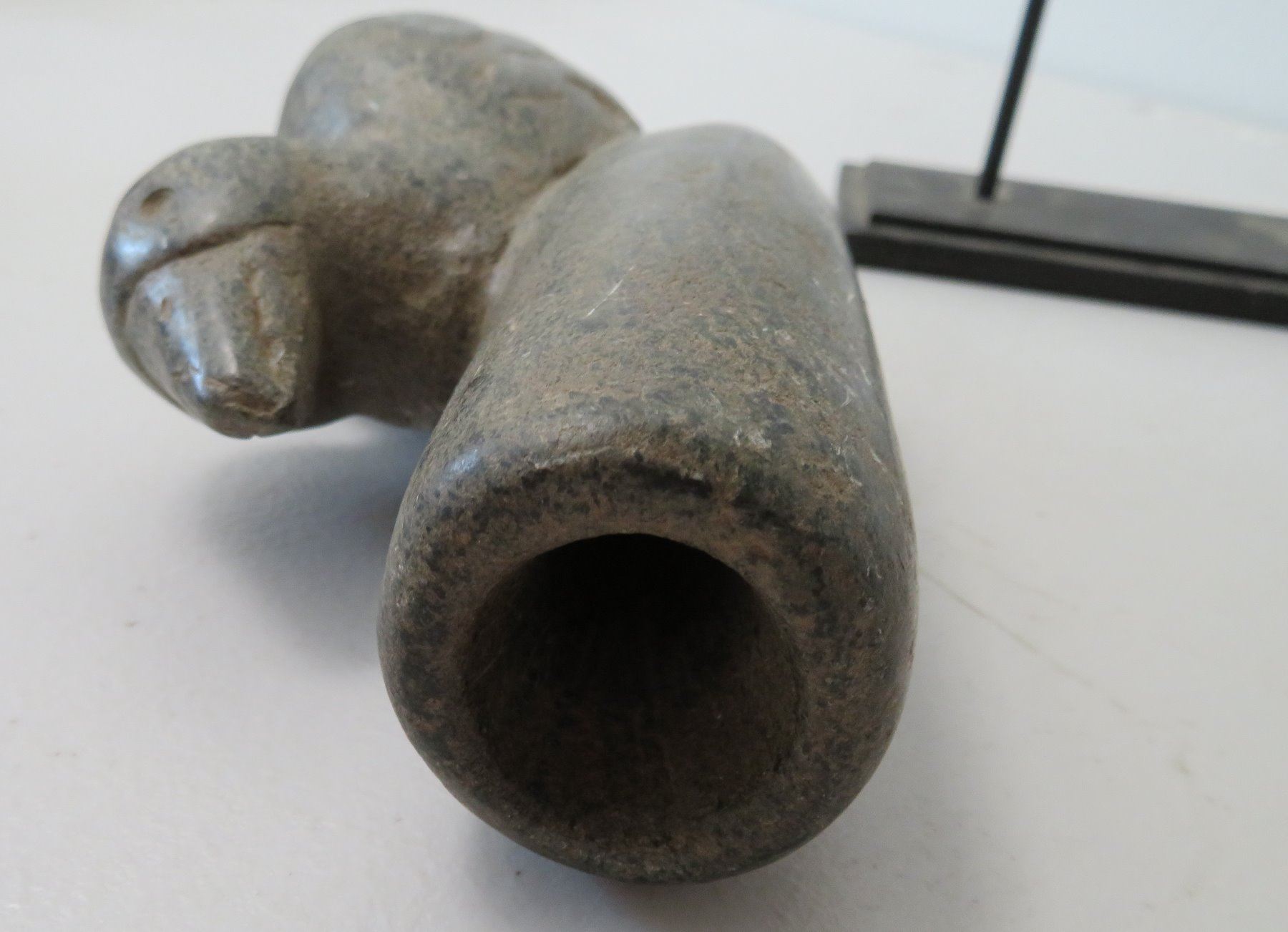 Effigy Stone Bird Pipe, pre-historic item. Made of steatite, the item measures 7 3/4" x 2" x 3 1/2". Georgia. With stand. Condtiion: As found, see images. Shipping: $30.00 w/insurance and signature, due to size and weight.