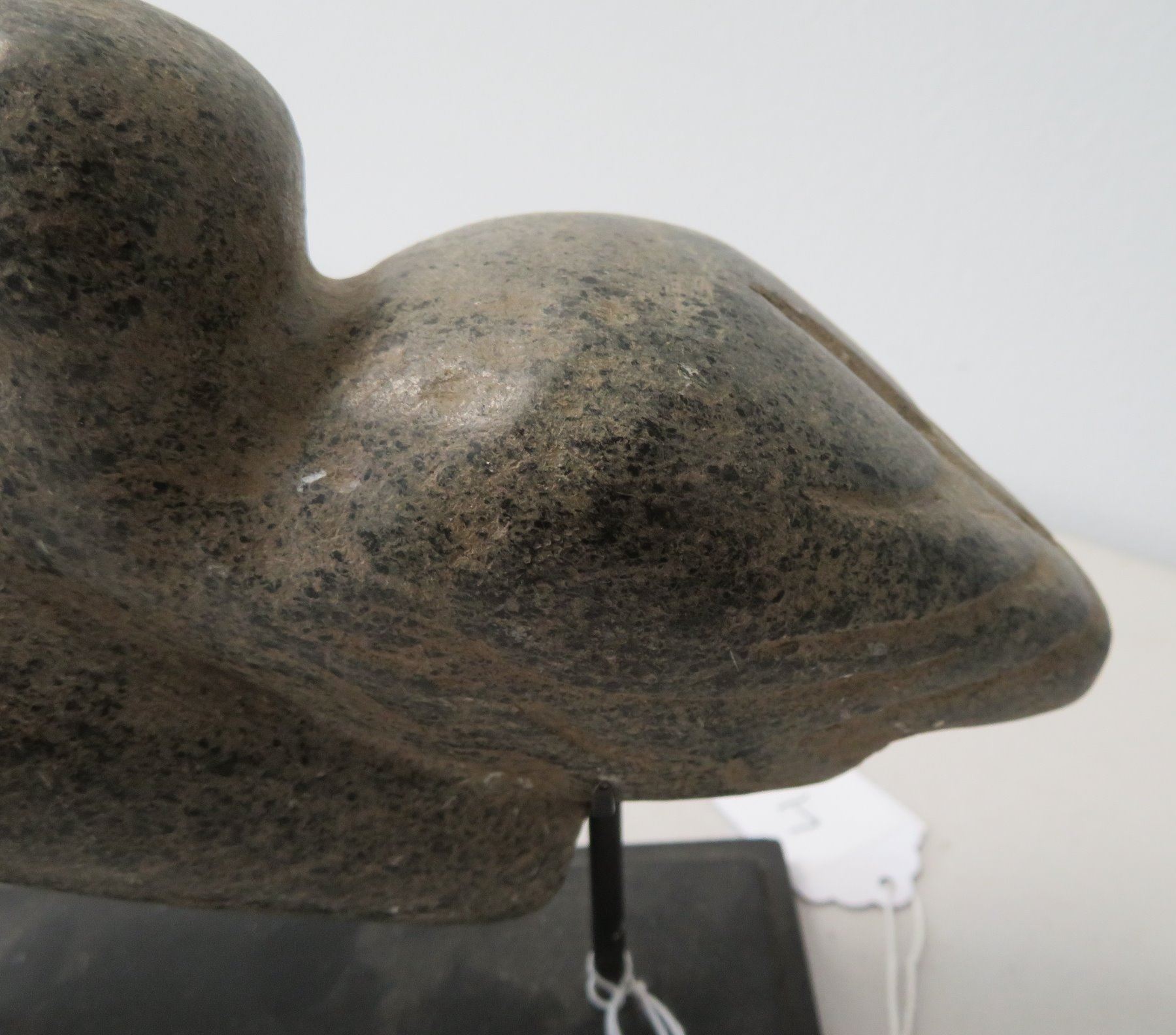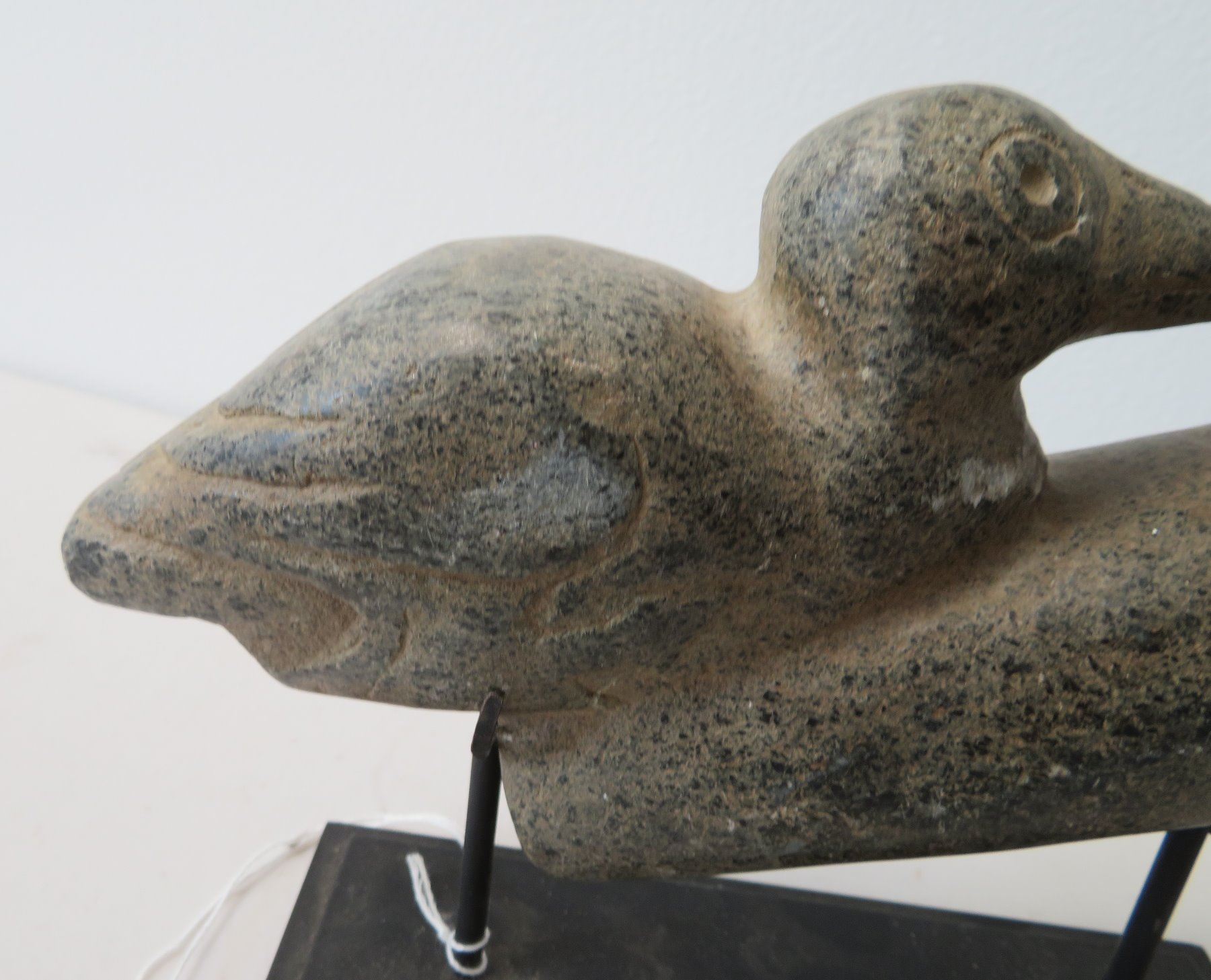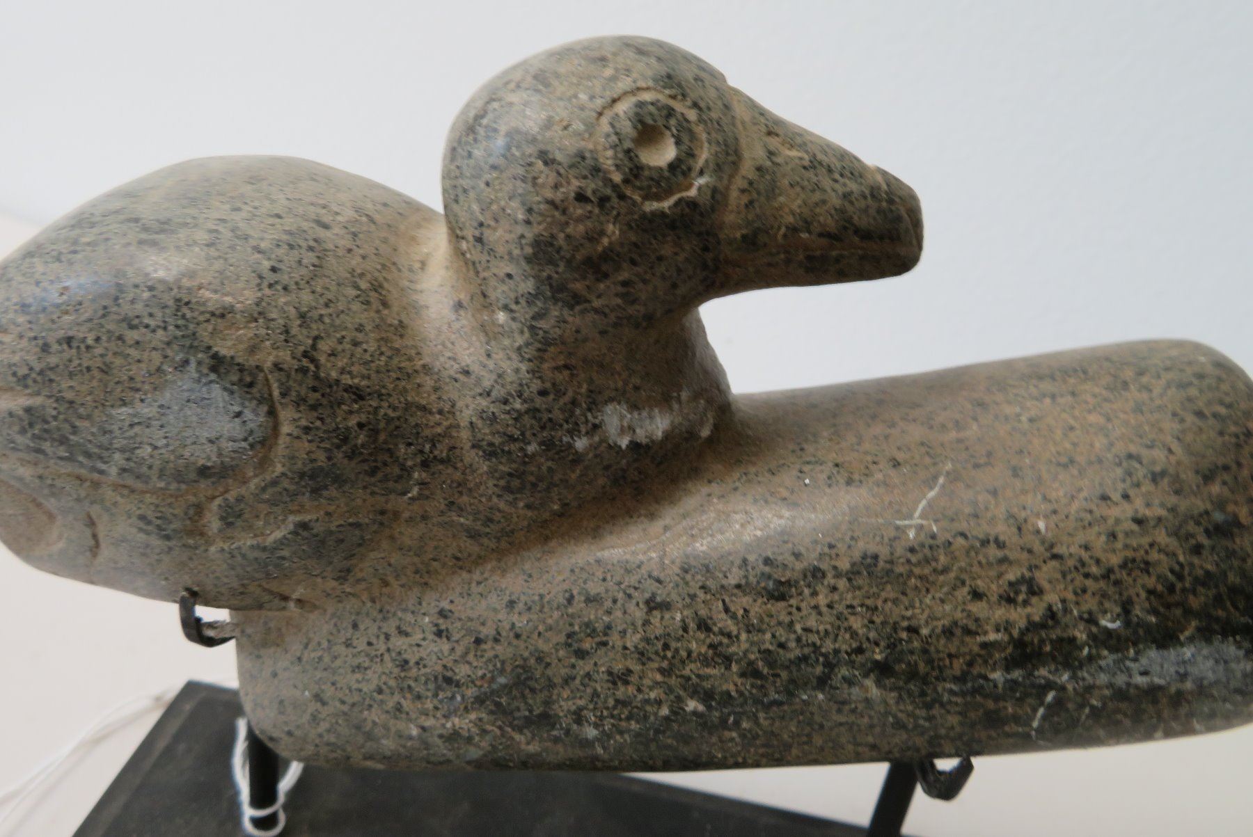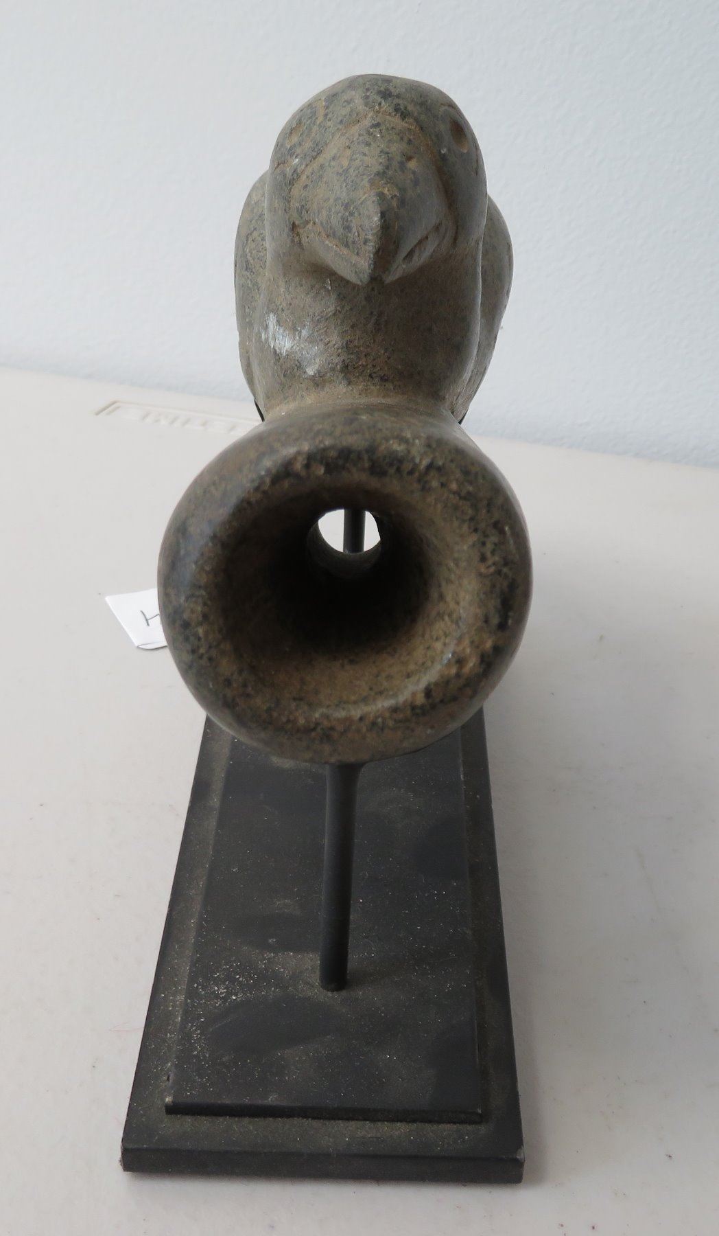Effigy Stone Bird Pipe, pre-historic item. Made of steatite, the item measures 7 3/4" x 2" x 3 1/2". Georgia. With stand. Condtiion: As found, see images. Shipping: $30.00 w/insurance and signature, due to size and weight.