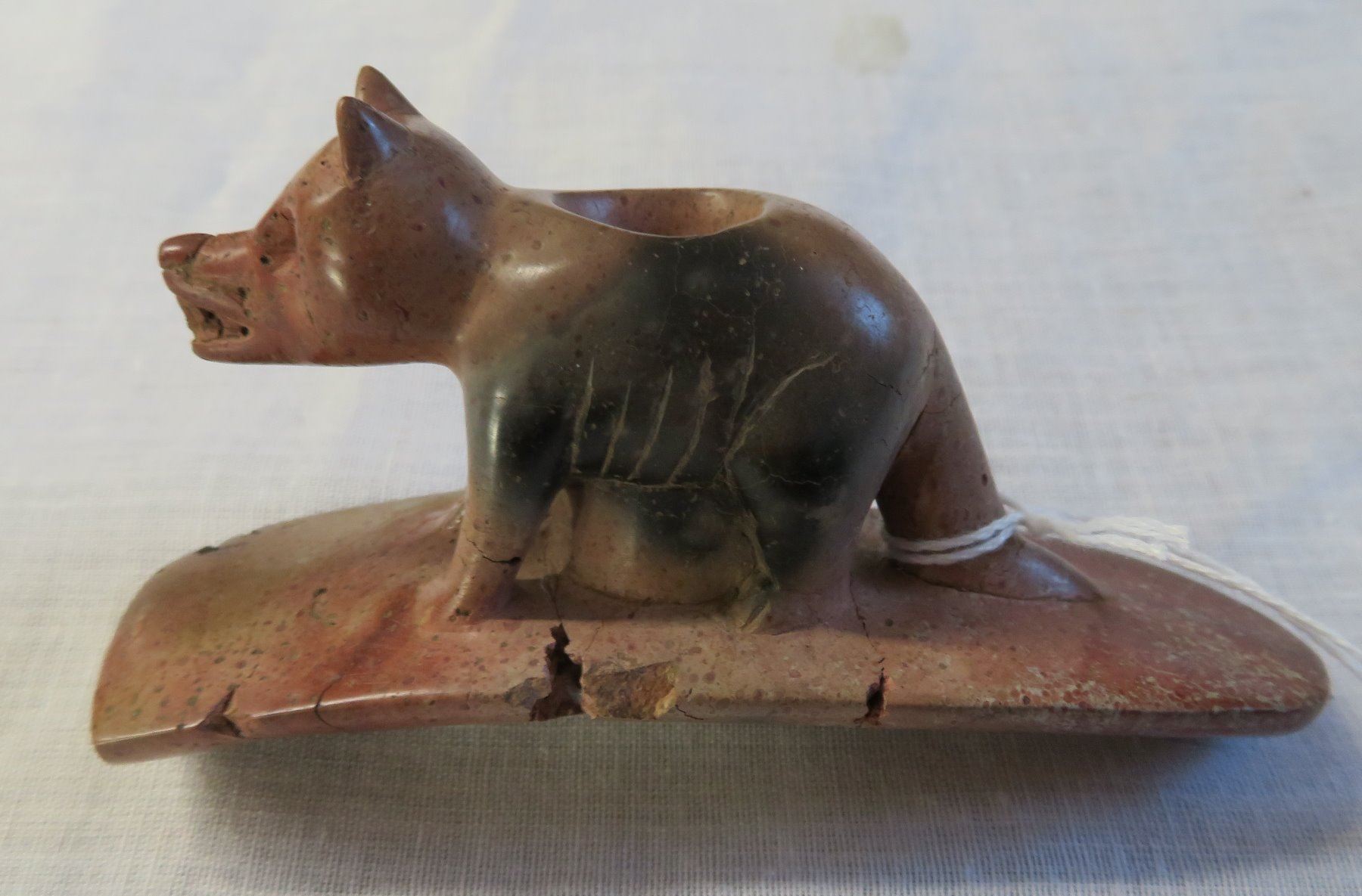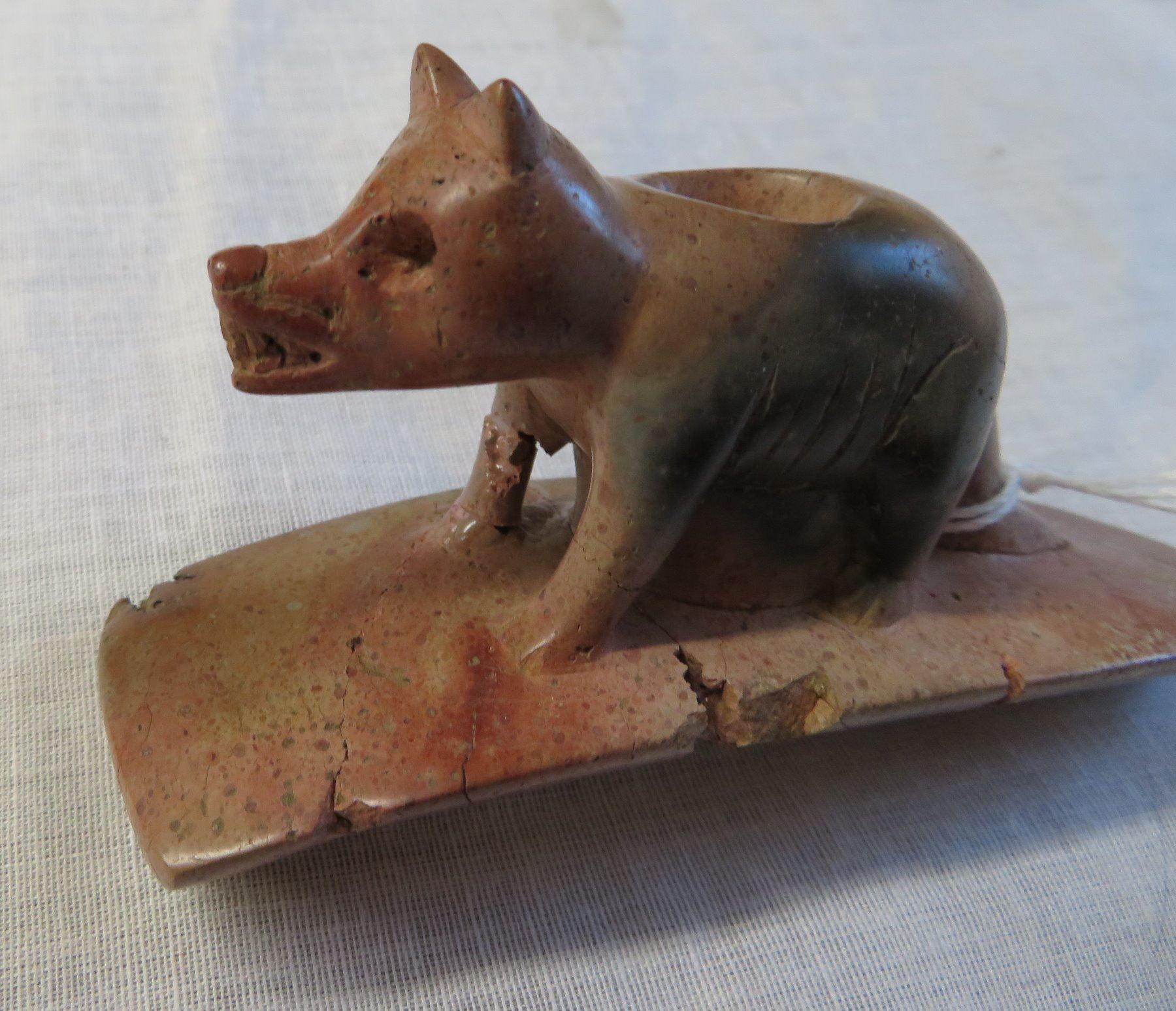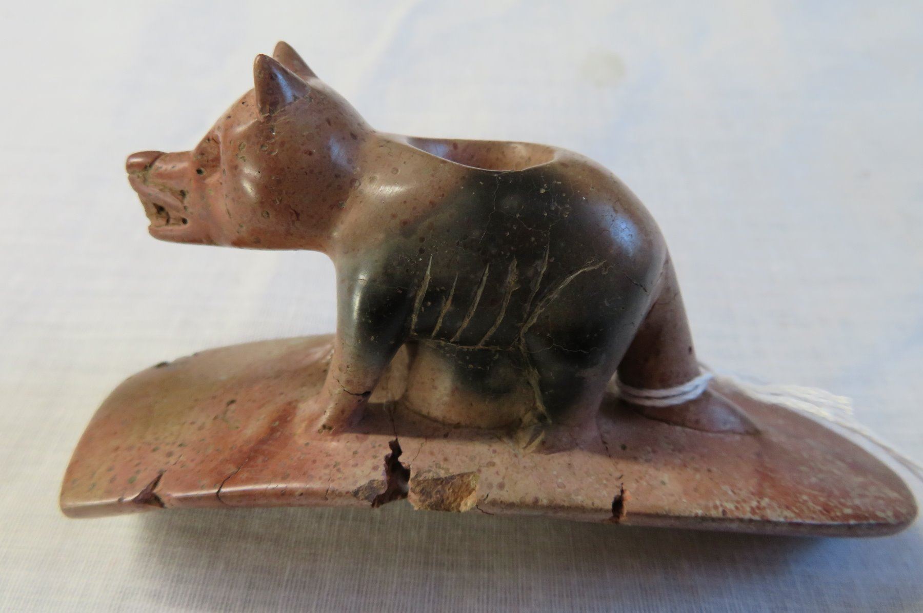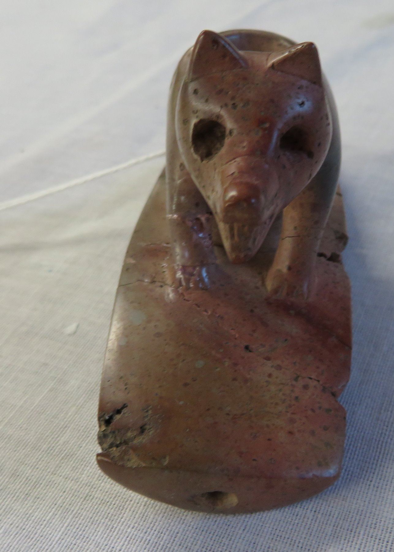 Effigy Wolf Pipe, age unknown. Made of pipestone, the item measures 4" x 2". Lucas County, Ohio. Condition: Broken and glued, see images. Shipping: $15.50 w/insurance and signature.