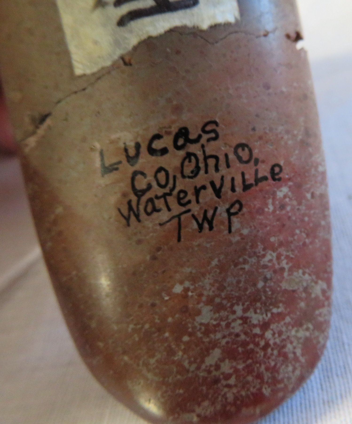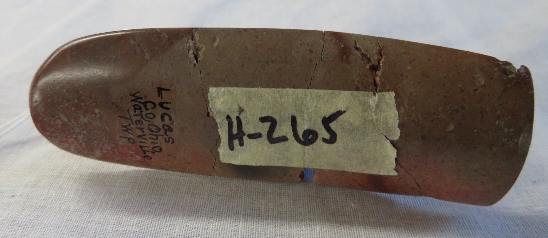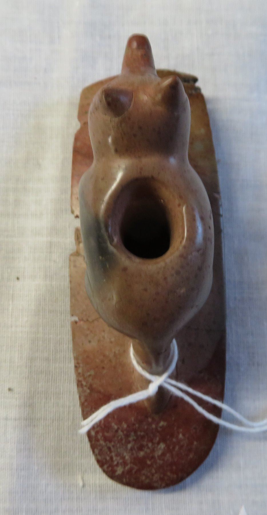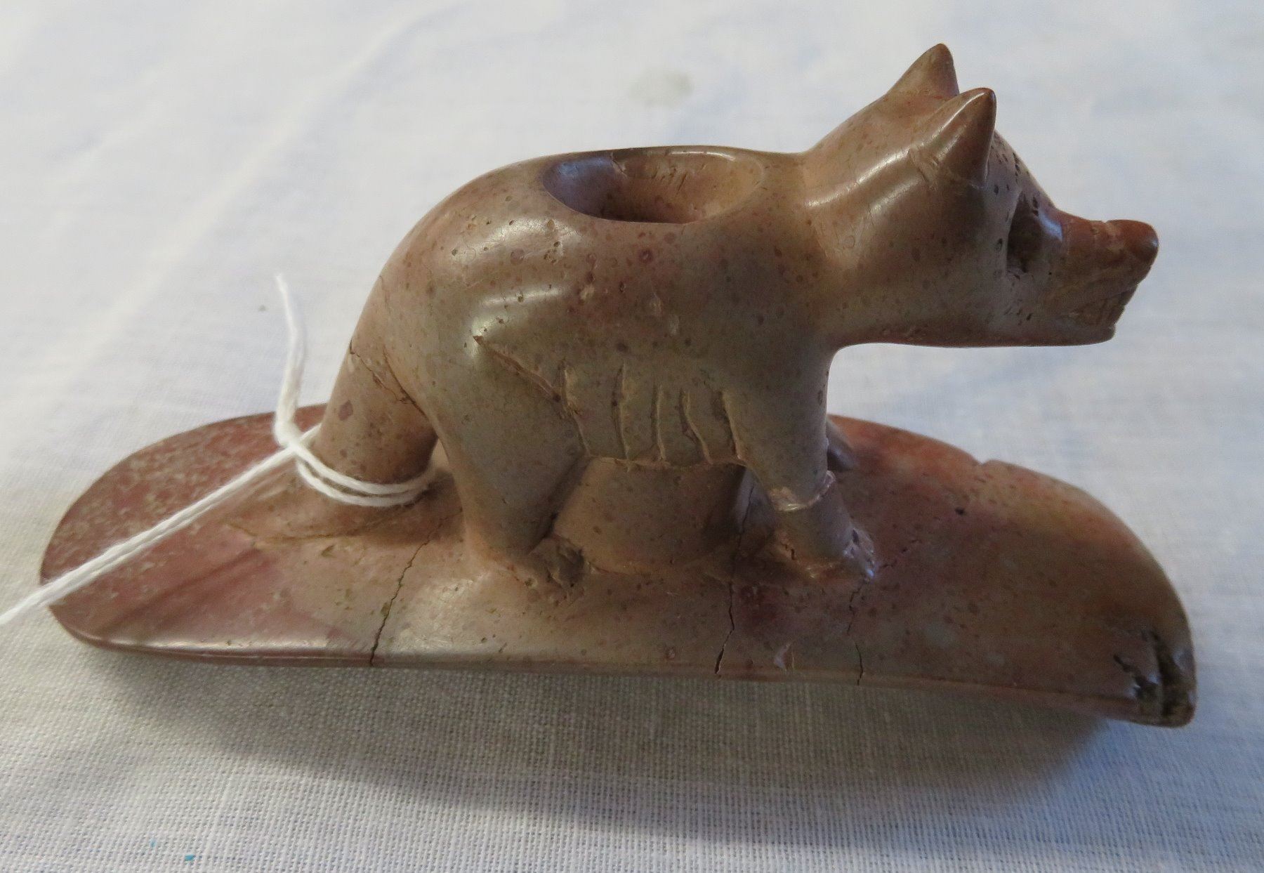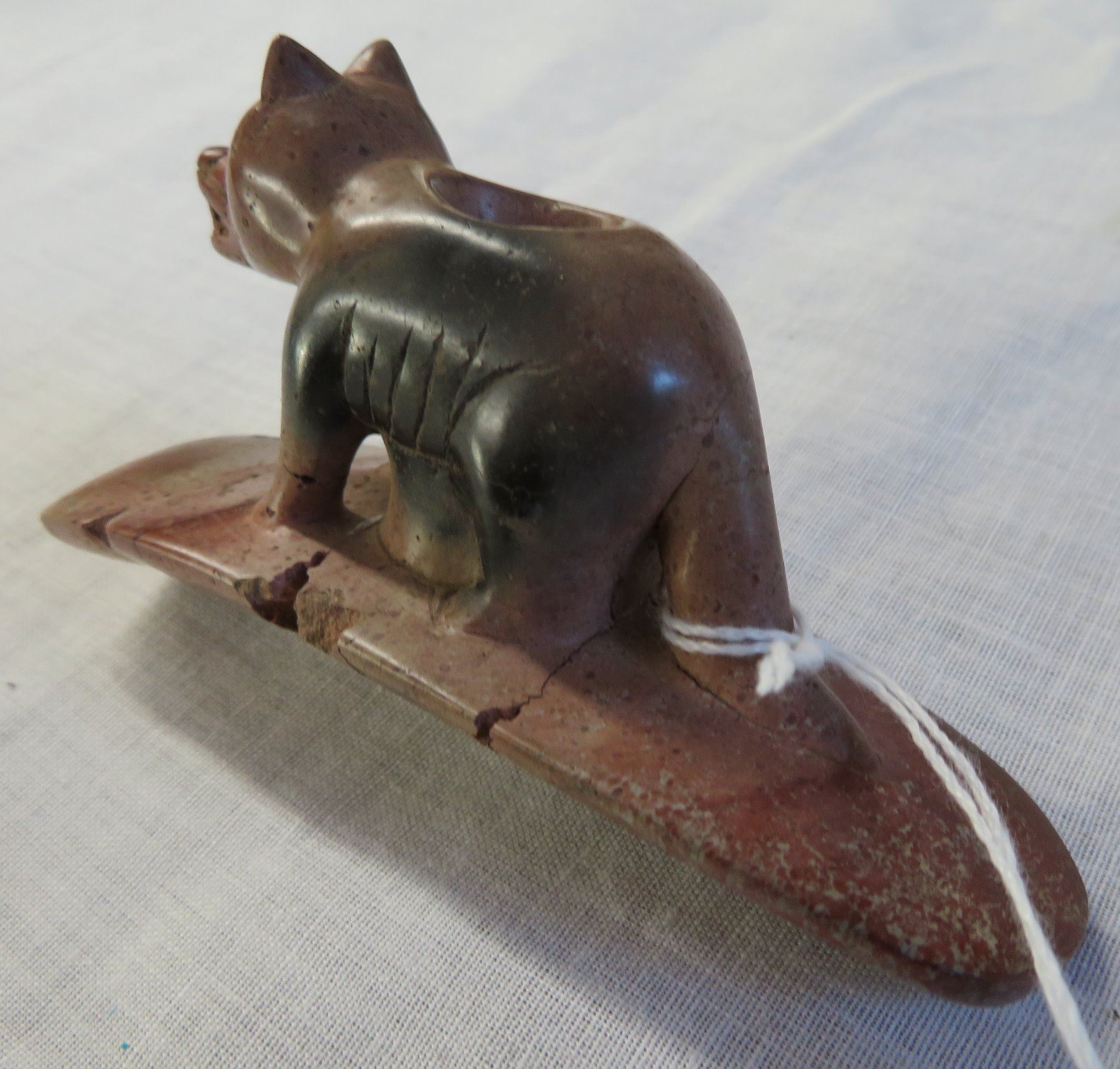 Effigy Wolf Pipe, age unknown. Made of pipestone, the item measures 4" x 2". Lucas County, Ohio. Condition: Broken and glued, see images. Shipping: $15.50 w/insurance and signature.