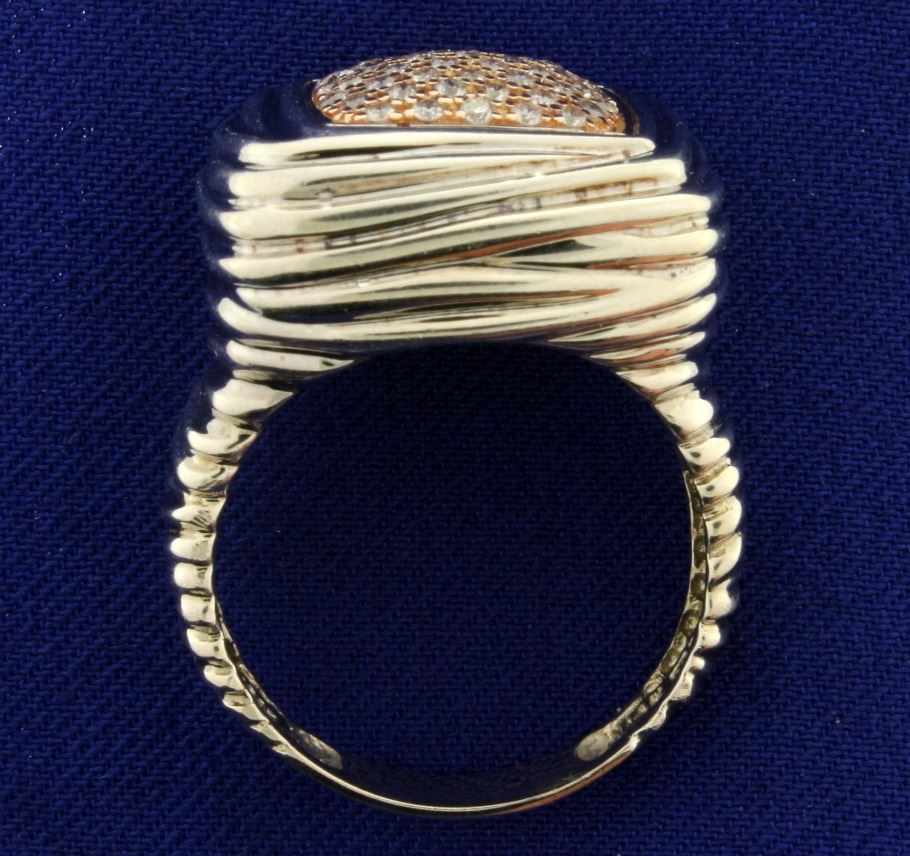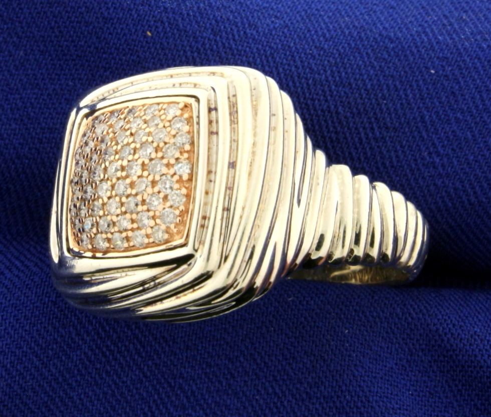 In sterling silver and 14k rose gold. Contains 1/2 ct of high quality diamonds - H color/I clarity. Size 10 1/2. 10.6g.
