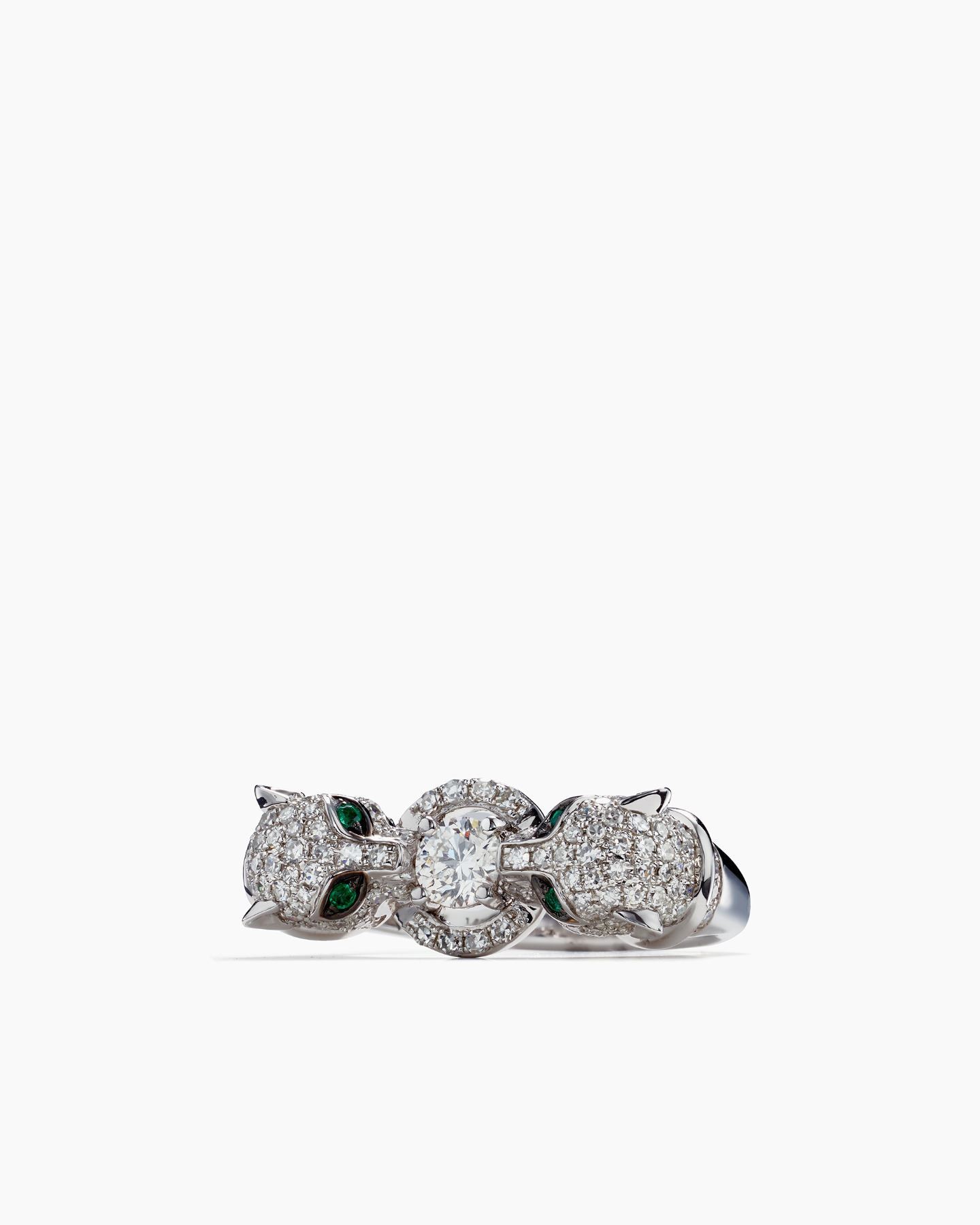 Covered in glittering pave’ diamonds, this new ring from our Signature Panther Collection stars a round brilliant solitaire as a center stone. An elite designer twist on the classic solitaire ring. Never missing a detail you will find each panther’s eyes complete with the most majestic of green emeralds. This ring will rightfully take any jewelry collection to the next level.